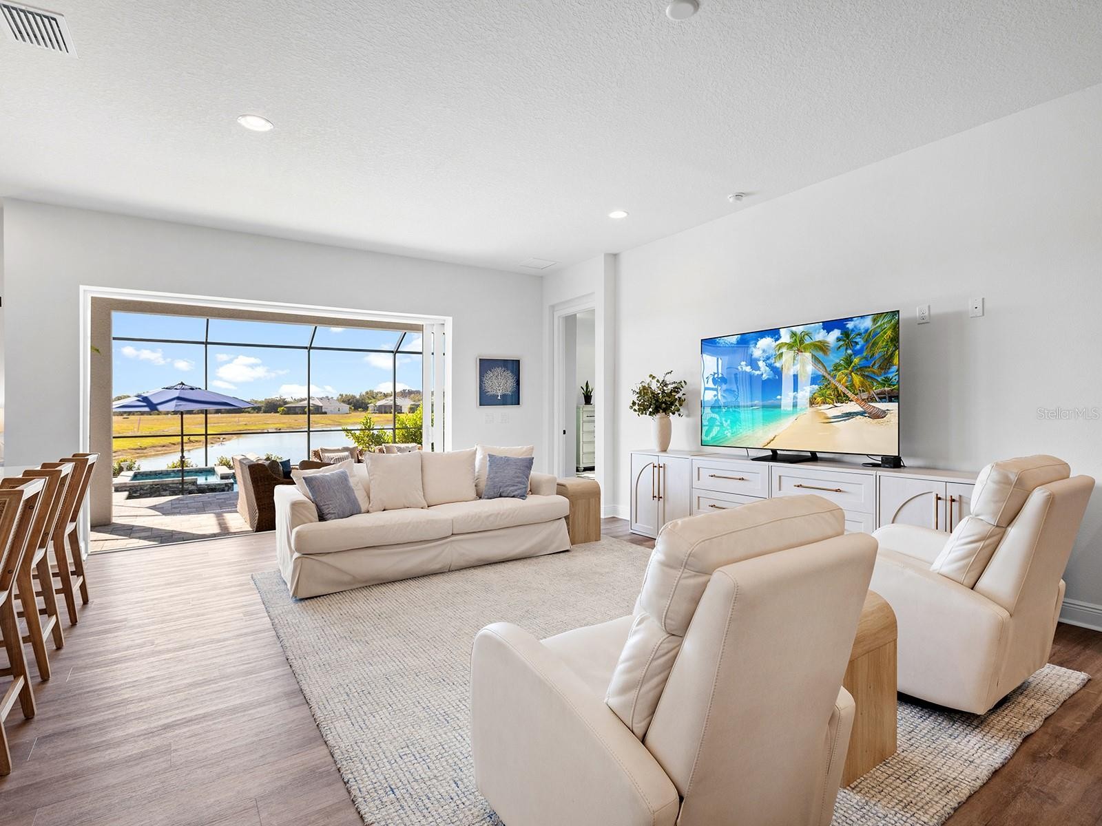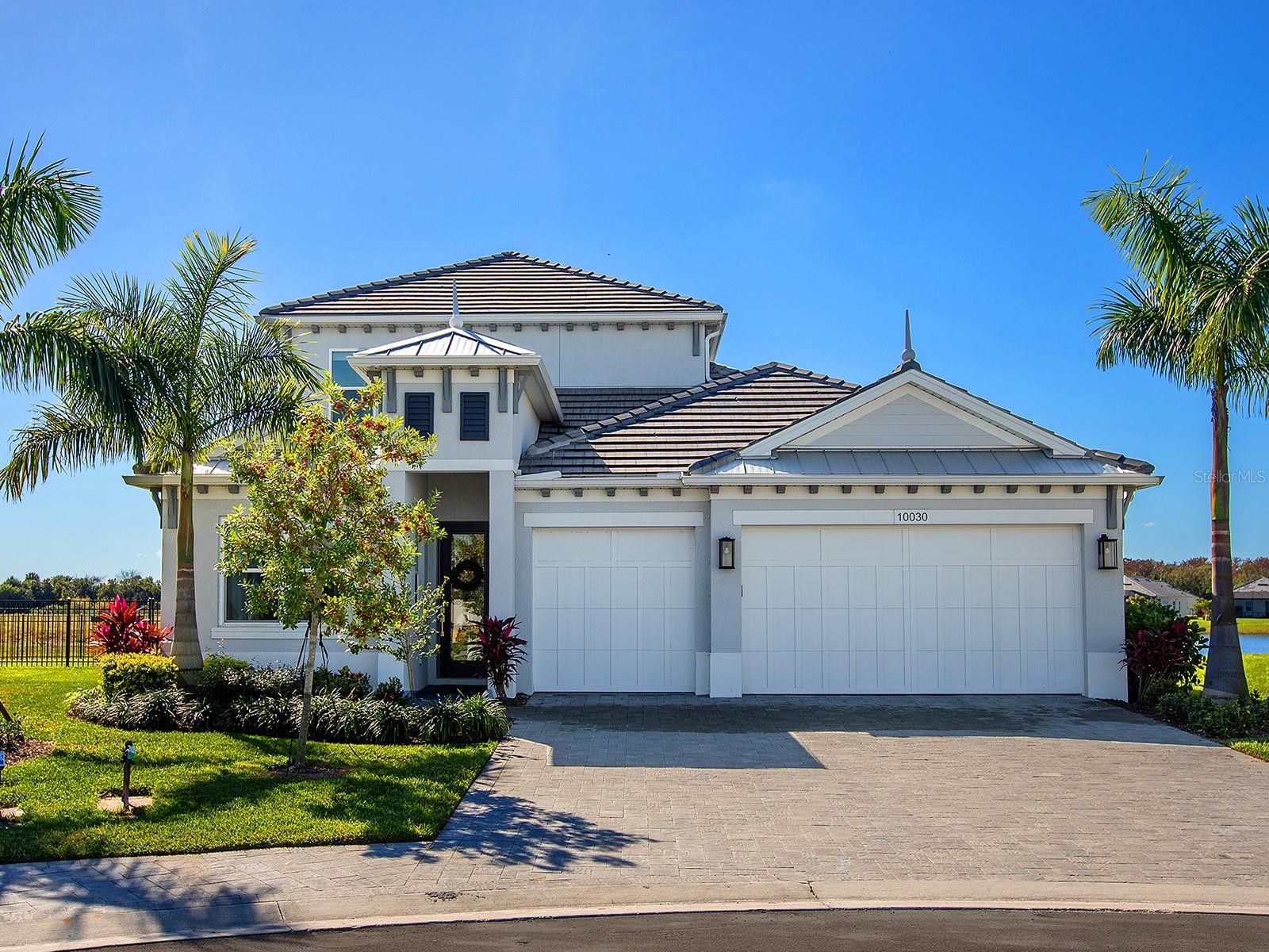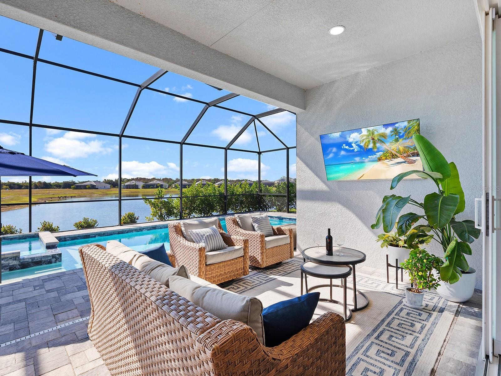 Welcome to Watercolor Place, a recently developed gated community in Bradenton, Florida, known for its low HOA fees and NO CDD fees. Positioned on a premium cul-de-sac and lakefront lot, this two-story residence built in 2024 offers a total of 3,041 square feet of interior living space, thoughtfully designed for comfort, function, and elegance. With four bedrooms and four full baths, the layout includes a versatile upstairs bonus room featuring its own full bath, walk-in closet, and independent HVAC unit, making it an ideal space for a media lounge, game room, or guest suite. Upon entering, you are greeted by an open-concept design highlighted by 10-foot ceilings, eight-foot doors, and large windows that welcome an abundance of natural light. The chef’s kitchen serves as the heart of the home, appointed with a 10-foot island, double ovens, an oversized cooktop, pantry, and a custom pass-through window to the lanai. The adjacent great room and dining area flow seamlessly, creating a central hub for daily living and entertaining. The main-level primary suite is a thoughtfully designed retreat, featuring a spa-inspired bath with dual rain head showers and handheld fixtures. A spacious walk-in closet is enhanced by added rows of built-in hanging shelves for optimized storage. Three additional bedrooms are conveniently located on the main floor, offering flexibility for families or guests. Upstairs, the expansive bonus room offers limitless possibilities, complete with a full bath, large closet, and separate HVAC system. It can function as a bonus room, fifth bedroom, studio, office, or secondary living space. Throughout the residence, upgraded features include custom flooring, pocket doors, tray ceilings, and insulated interior walls for added comfort and efficiency. Outdoor living is elevated by the extended lanai, which features a smartphone-controlled heated saltwater pool and spa, sundeck, and covered lounge space—all overlooking tranquil lake views and beautiful sunset views. A fenced-in side yard adds functional outdoor space, ideal for pets or play. Additional exterior appointments include impact-rated windows and doors, a three-car garage with outside keypad, a paver driveway and walkway, exterior coach lighting, tankless gas water heater, rain gutters, and a fully integrated irrigation system. Window treatments are installed throughout, enhancing privacy and light control. Watercolor Place residents enjoy maintenance-free living with HOA services that include lawn care, landscaping, and Wi-Fi and cable. The newly completed amenity center offers a resort-style zero-entry pool, state-of-the-art fitness center, social gathering spaces, and a built-in grill station. Ideally situated just minutes from the new Target and Costco shopping plaza, Publix, dining options, and minutes away to the vibrant offerings of downtown Lakewood Ranch, this home represents the ideal balance of privacy, luxury, and accessibility. Come see what this home has to offer!!