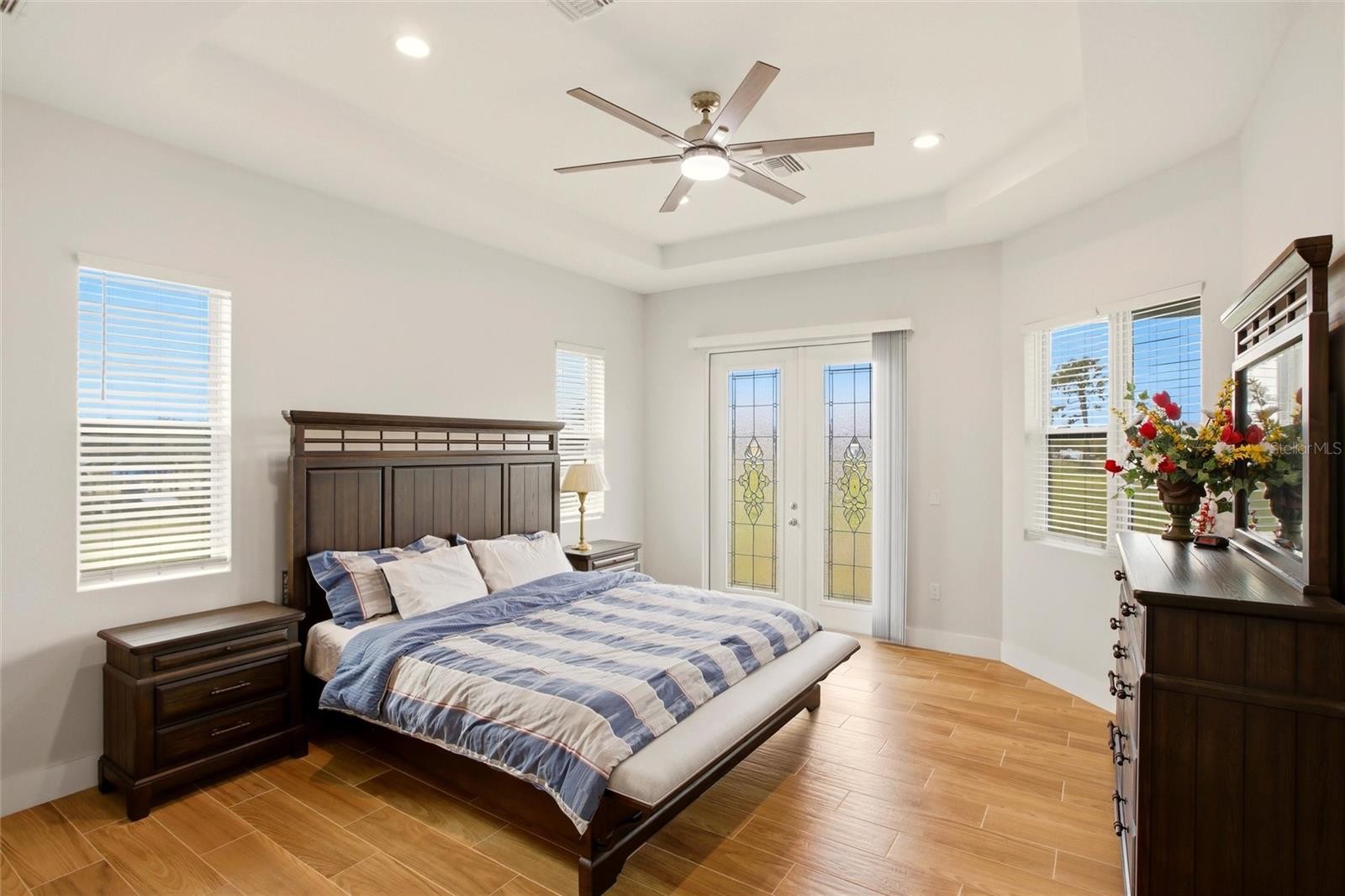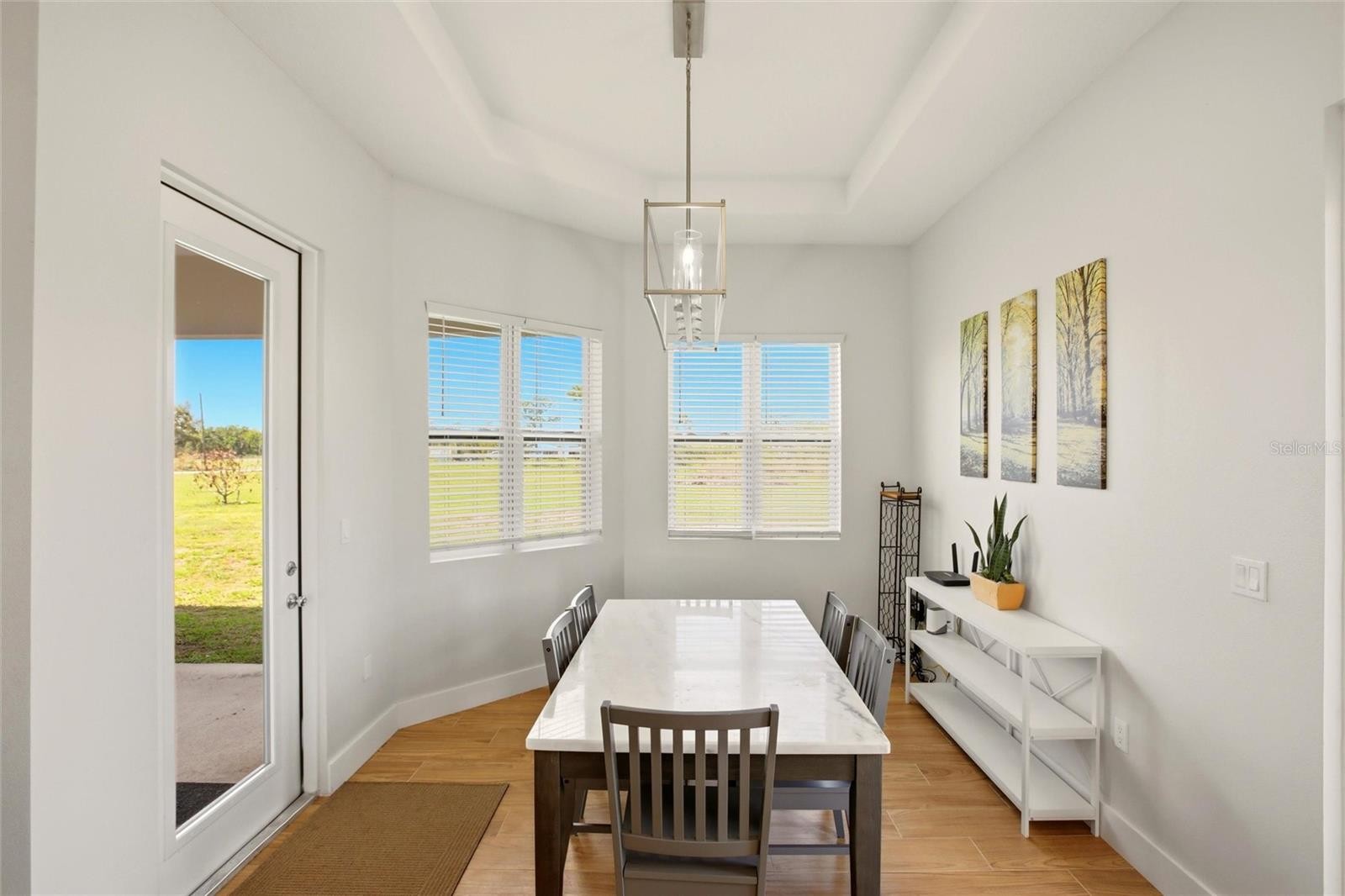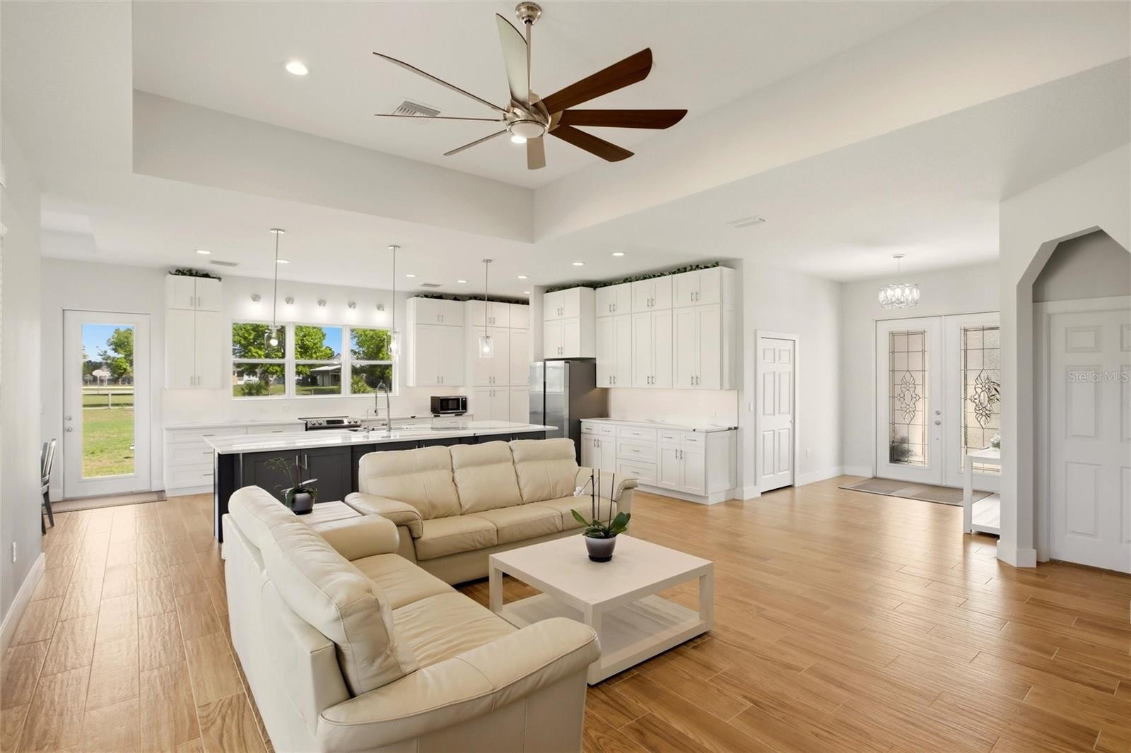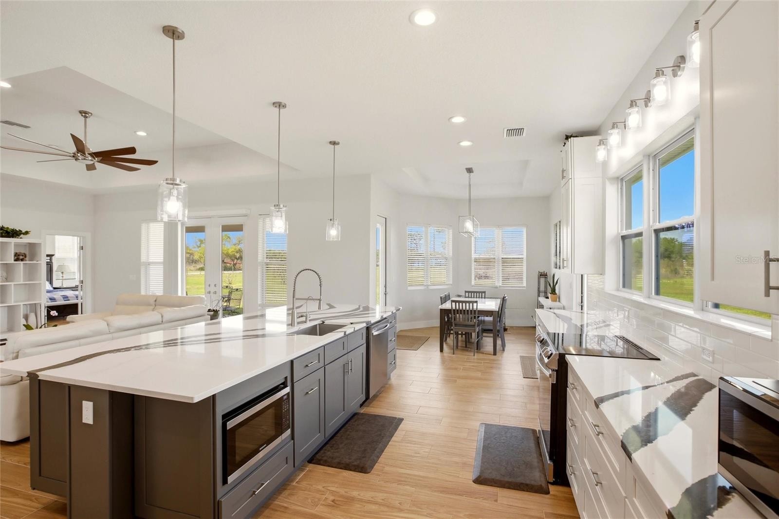 This is it! Your private country retreat just minutes from the conveniences of the city. This beautifully custom-built home is nestled on nearly six peaceful acres, offering the perfect balance of privacy and accessibility. Relax on the inviting front porch overlooking a scenic pond filled with koi and turtles, where nature becomes part of your everyday view. Inside, the home features four bedrooms and three bathrooms with a bright, open floor plan. French doors lead to your backyard retreat, while impact-rated windows flood the home with natural light and warm Florida sunshine. The showpiece of the home is the stunning kitchen. A spectacular 10' x 4' center island topped with beautiful natural quartz creates the perfect gathering space for family and friends. Floor-to-ceiling white cabinetry provides abundant storage and style, making this kitchen a true chef’s dream. A large walk-in pantry adds even more convenience and functionality. The large living room has a beautiful tray ceiling. There is a three-car garage to protect your vehicles and inside laundry room. The entire home has plank tile flooring, making upkeep a breeze. The spacious primary suite is a relaxing sanctuary. The spa-like bath features a quartz vanity with dual sinks, a walk-in shower with rain head, and a luxurious jacuzzi tub. His-and-hers closets and generous space make it the perfect place to unwind after a day spent enjoying the property. Step outside and the possibilities are endless. With nearly six acres, there is plenty of room for gardening, recreation, animals, or simply enjoying the peaceful surroundings. The property is fully fenced and secured with a solar-powered entrance gate. Located next to the Myakka Community Center, you’ll enjoy convenient access to a paved walking trail, playground, baseball field, and community activities. The side gate allows easy access to the community center's amenities. This is an ideal setting for growing or multigenerational families. At just four years old, this home offers modern construction and peace of mind. Come experience the beauty, space, and lifestyle this exceptional property provides.
