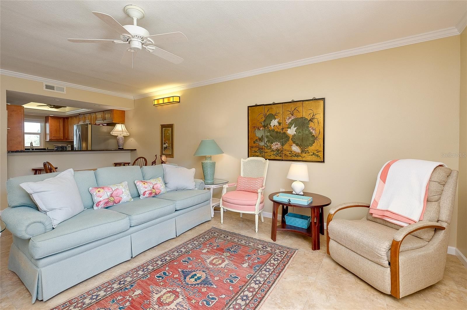 This beautifully updated second-floor unit showcases quality upgrades throughout. Porcelain tiles flow seamlessly through every room, including closets, complemented by textured ceilings, crown molding in the living and dining areas, and new interior doors with brushed nickel lever handles. Double-pane impact-resistant windows and a newer front door provide added peace of mind. French doors from both the living room and primary suite open to the lanai balcony, creating a bright, airy feel. The kitchen is thoughtfully designed with granite countertops, a breakfast bar, rich wood cabinetry, stainless steel appliances, a built-in cooktop, an upper microwave/convection oven, recessed lighting, and a tray ceiling with indirect crown-lit detail. The primary bath features a tiled step-in shower with a glass enclosure and an updated vanity with stylish fixtures and finishing touches, elevating this move-in-ready home. Enjoy community amenities including a heated pool, tennis court, BBQ area, and ample guest parking. Capri Isles and Waterford Golf Clubs are nearby, along with shopping, dining, medical facilities, and public transportation just steps away. Downtown Venice and a variety of restaurants are only minutes away. Assigned parking is located in the south lot. Strong rental potential makes this a smart investment. Schedule your private showing today and start living the relaxed, sun-soaked Venice lifestyle where beach days, golf outings, and waterfront dining are simply part of everyday life.