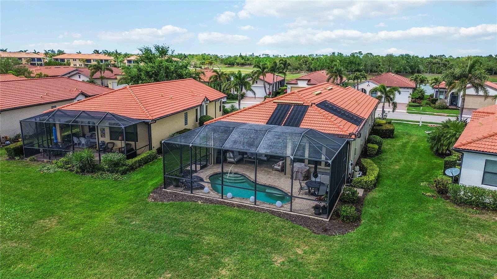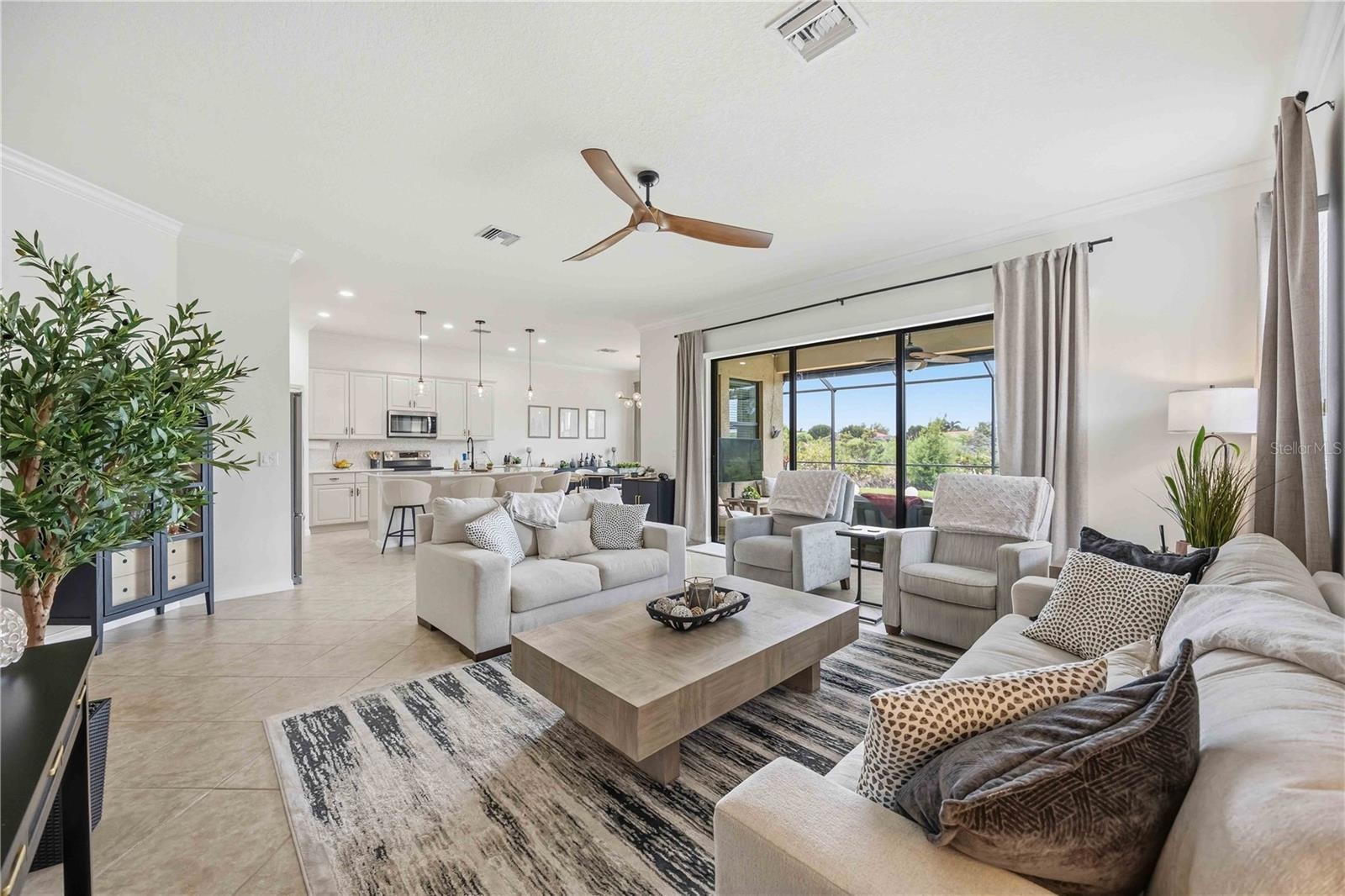 Imagine arriving home to a residence where refined luxury meets effortless everyday living—surrounded by natural beauty and resort-style amenities. Welcome to 10485 Crooked Creek Drive, a beautifully appointed WCI-built Roma model, ideally situated within the gated community of Sarasota National—one of Venice’s most desirable addresses. This exceptional home offers 2 bedrooms, 2 full bathrooms, and a versatile den or office with glass doors for added privacy, encompassing over 1,912 square feet of thoughtfully designed living space. From the moment you step inside, you’ll notice the attention to detail and extensive upgrades, including crown molding, soaring ceilings, fresh interior paint, new carpeting, sealed tile grout, updated lighting fixtures, new appliances, and a new hot water heater. The split-bedroom floor plan provides both privacy and functionality, making it ideal for guests. The primary suite serves as a true retreat, complete with oversized walk-in closets and a private en-suite bath designed for relaxation. The main living areas showcase elegant diagonal tile flooring, a soft neutral palette, and expansive sliding glass doors that open to serene views of the sparkling solar heated pool. At the heart of the home, the open-concept kitchen is perfectly suited for both entertaining and daily living, featuring upgraded cabinetry, stone countertops, stainless steel appliances, a large center island with bar seating, and a charming breakfast nook surrounded by windows overlooking the pool. The adjoining great room creates a seamless flow for indoor-outdoor living. Step outside to your private oasis and fully embrace the Florida lifestyle. The screened lanai offers generous space for lounging and dining, highlighted by the pool and peaceful preserve views—perfect for morning coffee or evening cocktails. Additional features include a spacious laundry room with new washer and dryer, extra cabinetry for storage, an oversized two-car garage, and abundant storage throughout. As a resident of Sarasota National, you’ll enjoy an impressive collection of amenities, including tennis and pickleball courts, a resort-style pool, lap pool and spa, a state-of-the-art 7,356-square-foot fitness center with classes, bocce courts, a dog park, playground, and an event lawn. The community also offers a full-service restaurant, tiki bar, and banquet facilities for both casual and fine dining. Cable is included in the HOA fees for added convenience. Ideally located just minutes from Atlanta Braves spring training facilities, the Legacy Trail, world-renowned Gulf beaches, and the vibrant communities of Wellen Park, Venice, and Sarasota, this home offers both tranquility and accessibility. This is more than just a home—it’s a lifestyle. Don’t miss your opportunity to make 10485 Crooked Creek Drive your own private retreat in paradise.
