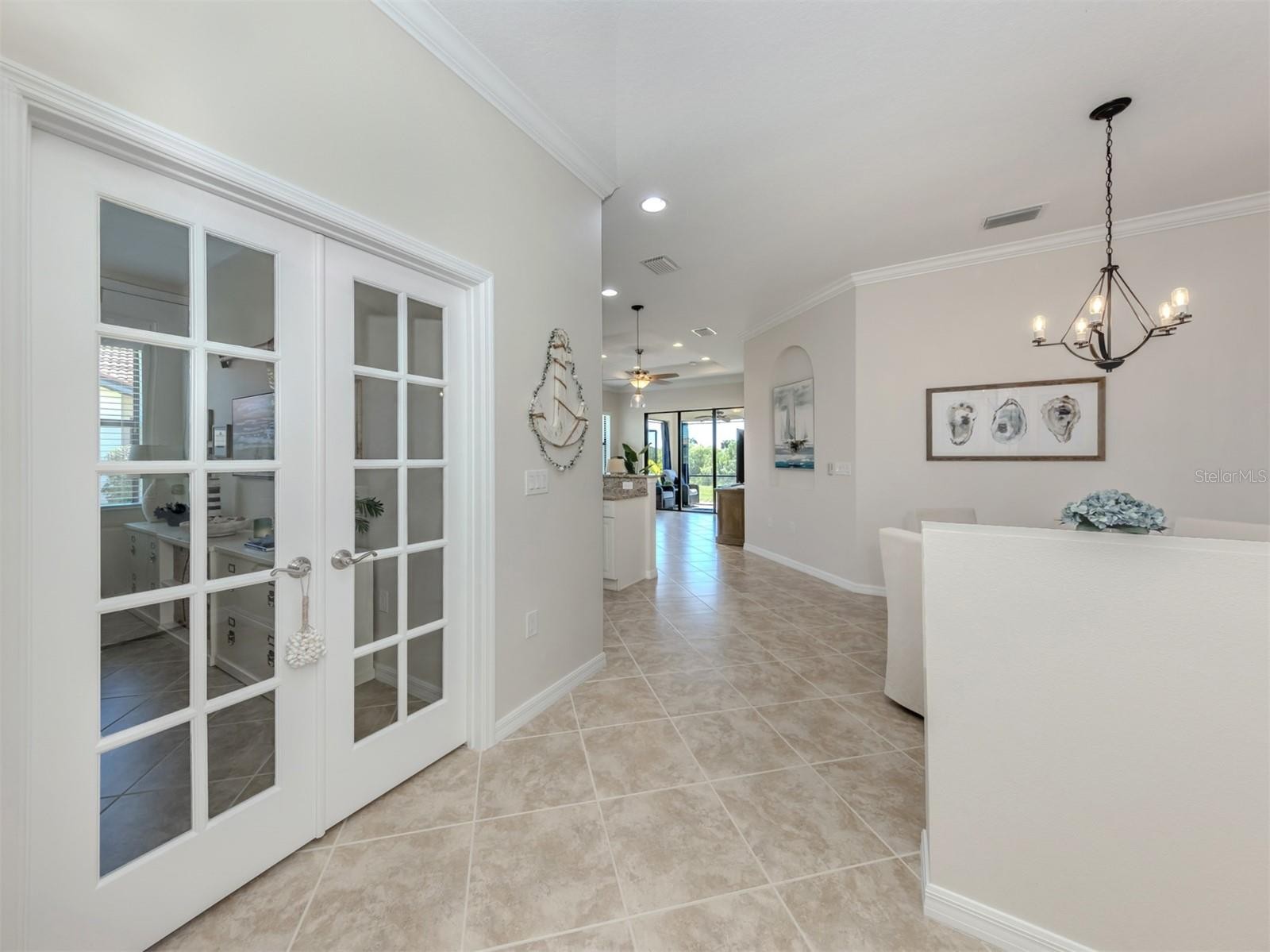 This meticulously maintained, WCI-built residence in the sought after, resort-style community of Sarasota National Golf Club. This beautifully appointed two-bedroom, den, two-bath home, with a two-car garage offers just under 1,600 square feet of stylish and functional living space with 9-foot, 10-inch ceilings throughout with upscale finishes. This home is on a serene preserve view lot with plenty of privacy. Upgrades include 2024 and 2025 new appliances, 2023 new Pergo water-resistant flooring in bedrooms, 2022 newly installed French doors to den, 2021 air conditioner compressor and capacitor, 2020 interior re-painted, 2019 whole-house surge protector, new water heater, and exterior paint, hurricane protection and more! Enter to discover an open and airy floor plan featuring 18-inch ceramic tile on the diagonal throughout the main living areas and new Pergo flooring in the bedrooms. The kitchen is a chef’s delight, boasting solid wood cabinetry with soft-close drawers with several pullout shelving drawers, granite countertops, stainless steel appliances and tiled backsplash, all complemented by recessed lighting and elegant crown molding. The spacious primary suite is privately at the back of the home and filled with natural light from large windows. Features include a tray ceiling, a luxurious en-suite bath with glass-enclosed shower, dual sinks, quartz countertops and a large walk-in closet. The second bedroom is thoughtfully placed at front of the house, adjacent to the second full bath, ideal for guests. The den is positioned in the heart of the home with glass doors and provides a space for a home office, media room or guest room overflow. A separate inside utility room includes a sink and cabinetry for added storage and convenience. Enjoy peaceful mornings or relaxing evenings on the screened lanai overlooking the lush, private preserve setting. Additional features include window treatments, a paver driveway and walkway, and a spacious two-car garage. Live every day like you are on vacation in this resort-style community. This community boasts a 30,000-square-foot clubhouse with resort-style pool, outdoor tiki, a coffee room, Palm Club restaurant, 7,000-square-foot fitness center, fitness classes, day spa, card room, bocce ball, pickleball, tennis, dog park, playground and event lawn. Sarasota National has also been certified by the International Audubon Society. Near the new Atlanta Braves spring training ballpark, newly built downtown Wellen Park, pristine beaches, newly built Costco, shopping, dining, medical facilities, U.S. 41 and Interstate 75. Golf is not required with this home and no restaurant minimums!