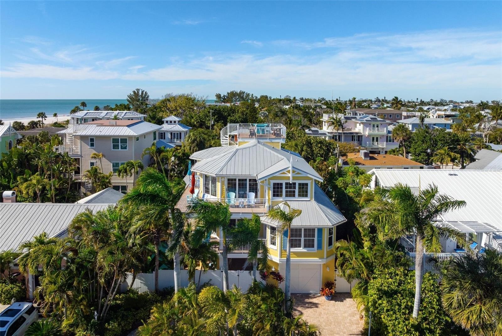 From sunrise to sunset, stunning Gulf views throughout the house. One of the most outstanding features of this property is the expansive rooftop deck—an irreplaceable amenity due to current height restrictions. From this vantage point, take in breathtaking Gulf sunsets, views of the Sunshine Skyway Bridge, and sweeping 360-degree panoramas of the island and surrounding waters. The elevated position of the street further enhances views and peace of mind. The home was thoughtfully designed by award winning architect Emily Anne Smith. The floor plan with four bedrooms, including two luxurious primary suites. Every bedroom features a private en-suite bathroom, complemented by two additional half bathrooms for a total of six bathrooms. A separate washer and dryer add convenience. The layout is designed to maximize natural light and capture views from sunrise to sunset. Both living levels feature wrap around decks with large seating and lounging areas. The second living level hosts a spacious primary suite with heated bathroom floors, a jacuzzi-style soaking tub, large shower, and dual vanities. This level also includes two additional en-suite bedrooms, plus a comfortable living area with a half kitchen featuring a sink, refrigerator, microwave, toaster oven, ample cabinetry, and a 48-bottle wine cooler—perfect for guests and family seeking privacy and independence. The third living level showcases an open-concept design with soaring ceilings, where the main kitchen, dining, and living areas all face the Gulf. Enjoy spectacular sunset and skyline views from nearly every angle. This level also features a second primary suite with a king bed and spa-like en-suite bathroom, a separate half bathroom, office workspace, and direct access to the rooftop deck. Outdoor living is equally impressive, highlighted by a resort-style pool with rock waterfall, jet stream fountain, jacuzzi jets, auto-fill system and mature tropical landscaping. A six-foot privacy fence surrounds the property. Entertain with ease at the covered tiki bar equipped with sink, refrigerator, TV, stereo, plus multiple shaded and sun-soaked seating areas. Additional features include a large garage accommodating 2–3 vehicles with 9-foot ceilings, extensive storage, workbenches, elevator, impact-rated PGT windows and doors, metal roof, low-maintenance stucco and Hardie plank exterior, heated slate kitchen floors, plus slate in entrance and storage room, bamboo flooring throughout the rest of the house, Hunter Douglas blinds, and the home is offered fully furnished and move-in ready. The home also features a monitored security system, smart thermostats and an Artificial Intelligence (AI) Camera System with DVR. Never rented, yet zoned for weekly rentals. No hurricane water intrusion in 2024. A truly rare offering on Anna Maria Island on one of the highest elevation and quietest streets with a deeded beach access.