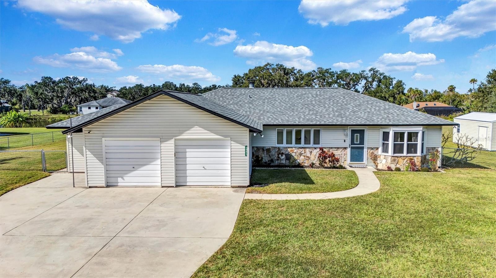 Rare find! Have you been craving an escape from the hustle and bustle of city life and desire to live in the country, but the commute seems a bit too far? Then you just found your dream home, free from HOA living, tucked away in a quiet neighborhood nestled on 1.27 acres of sprawling green lawn in a serene setting overlooking a beautiful pond. Imagine bike rides in the country, while still being 5 min from grocery stores, shopping, restaurants, and I-75 for easy commute. This one story home offers 4 bedrooms, 2 baths, a 2 car garage, plus outside storage shed, and a small bonus room off the garage that could serve as your perfect private office, hobby room, or just extra storage! In the evenings watch as the sky fills with purple, orange, and pink hues on your oversized, screened lanai while taking a dip in your heated pool or spa or throw a football in your fenced in field. Updates include new roof (2022),new septic tank (2023), well pump and well head (2024), wood look tile throughout, epoxy coated garage floor, new bathroom vanity in guest bath, and freshly painted pool deck. Bring your boats, trailers, and pets because there is no HOA and a large fence with wide opening for trailer access. Perfect place for your own garden. Get your slice of paradise while you have the chance. Short drive to both Anna Maria Island or St. Pete beaches. Schedule your showing today!