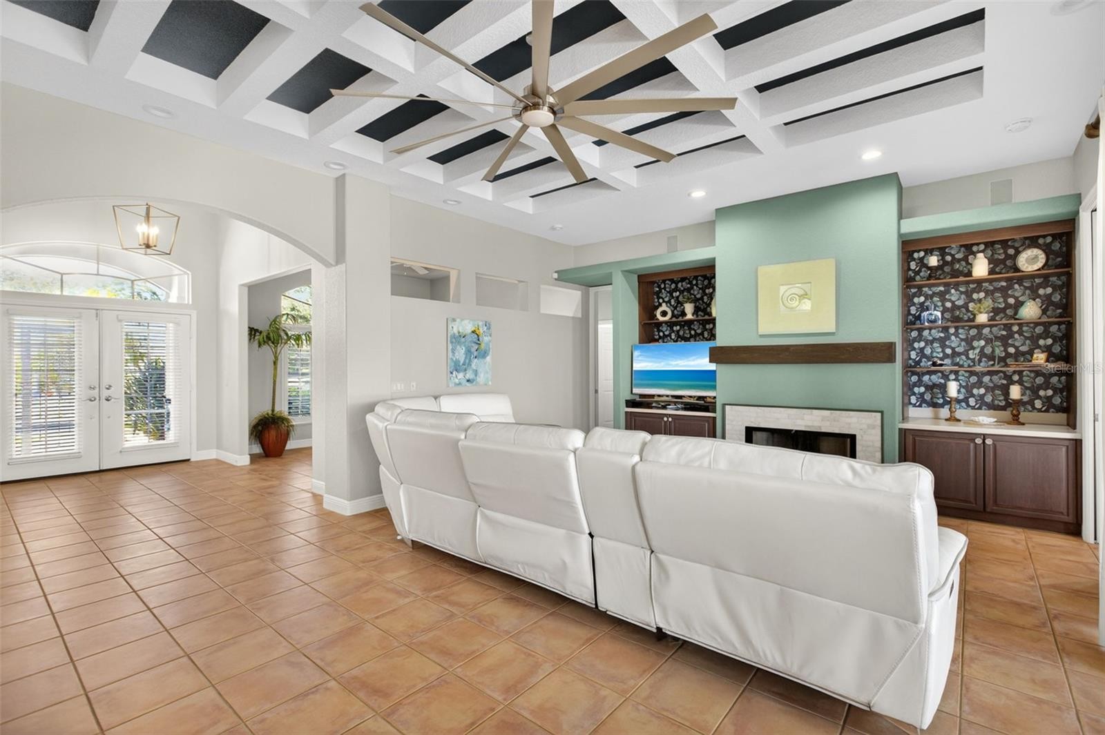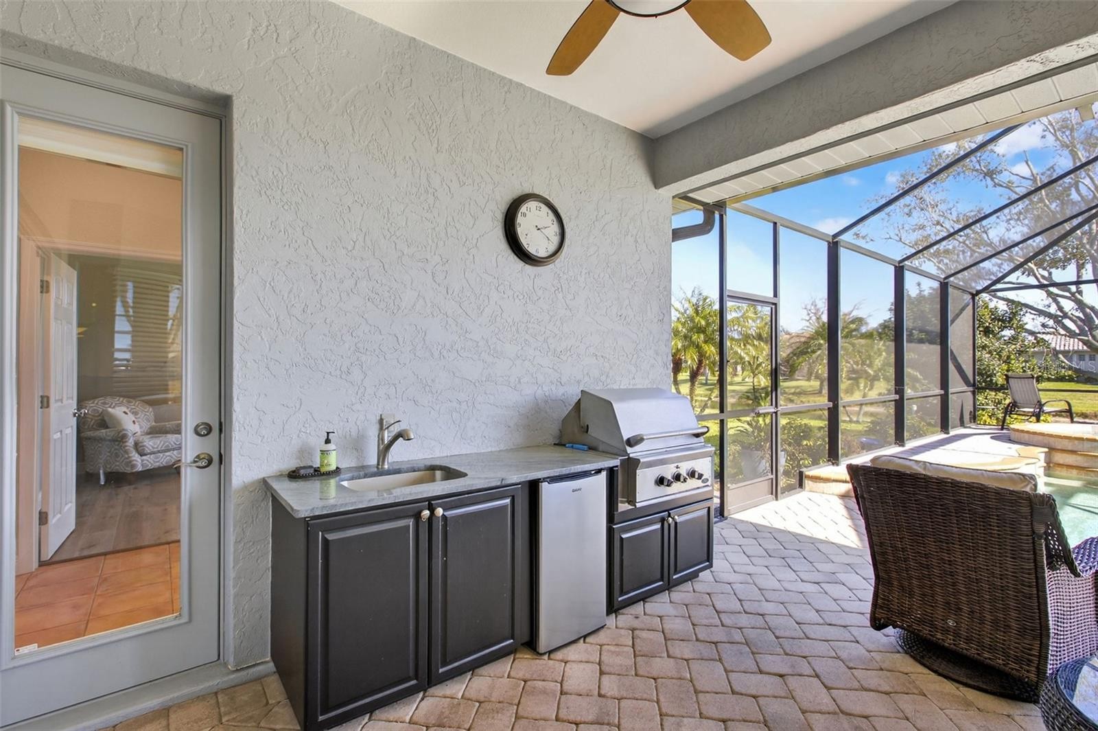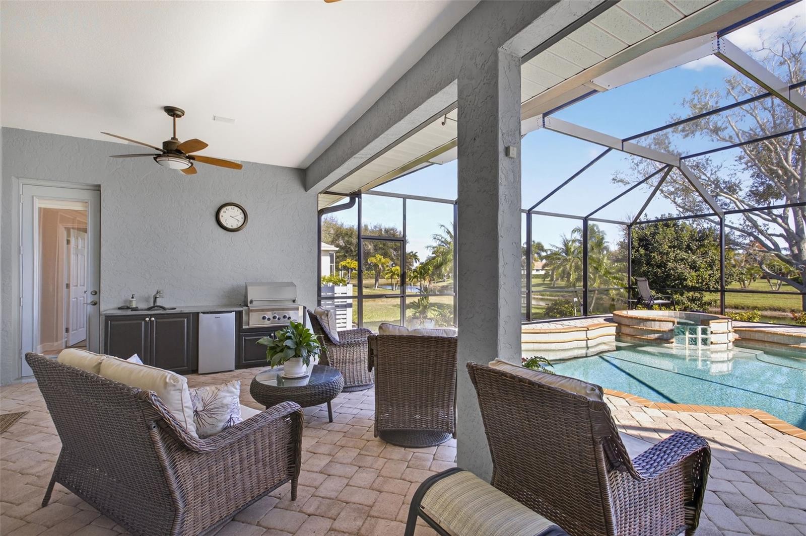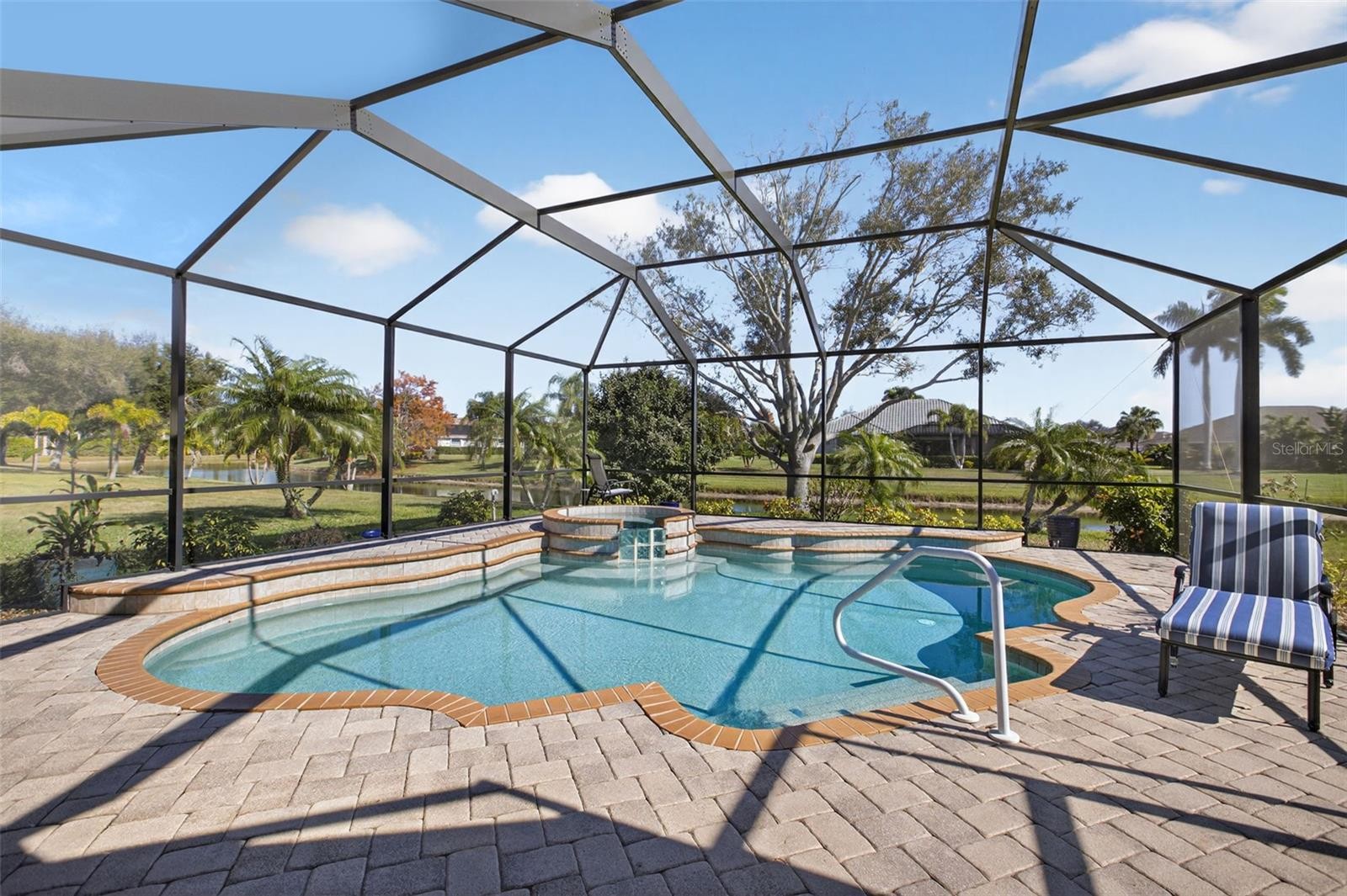 An exceptional opportunity in the gated enclave of Stillwater, this pond-front residence blends timeless design with effortless Florida living. Thoughtful architectural details, serene water views, and refined indoor-outdoor spaces create a home equally suited for everyday comfort and elegant entertaining. From the spa-inspired primary suite to the resort-style pool and lanai, every detail reflects quality, care, and understated luxury living.Formal living and dining rooms with tray ceilings, family room with coffered ceiling, fireplace, and built-ins. Kitchen features white wood cabinetry, granite countertops, stainless steel appliances, walk-in pantry, breakfast bar, and dinette overlooking pool and water views. Spacious primary suite with tray ceiling and updated spa-style bath with quartz dual vanities, soaking tub, separate shower, and private water closet. Three additional bedrooms, two updated guest baths, one with pool access. Caged lanai with covered seating, updated outdoor kitchen, heated pool and spa. .4-acre landscaped lot. Roof 2022, pool cage 2023, updated irrigation, new washer and dryer. Minutes to Dearborn Street, Manasota Key beaches, dining, hospital, and easy access to two major airports.
