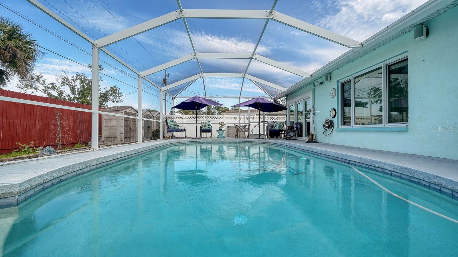 Welcome to this lovely solar-powered home, ideally situated on a spacious double lot on a quiet street in the heart of Venice. Not located in a flood zone and featuring no HOA, this well-maintained property offers peace of mind and exceptional value. The home boasts high-impact windows, a new roof (2021), new septic system, newer solar panels and numerous recent upgrades throughout. Major improvements include a newer water heater, AC, electric pump, and a solar-heated pool that has been recently refinished. The pool area also features a newly redone deck, new screens, cement flooring in the lanai, and a refinished pool cage with new aluminum and screws. A bright skylight fills the living and dining areas with natural Florida sunshine. The 100-foot well includes a new bladder tank, submerged pump, and a large water softener with a charcoal filter. The garage is equally impressive, offering AC, LED lighting, a high-impact garage door, and a convenient pet bath. The expansive double lot provides plenty of room for outdoor living and includes RV hookups with an outlet and pump-out, front and rear gutters, and fencing surrounding the backyard for privacy. The beautifully manicured lawn showcases tangerine and mandarin trees, a koi pond, pergola, sheds, and a double driveway. Located just minutes from beaches, shopping, parks, and Downtown Venice, this home is also close to the local Senior Center, offering social activities such as Bingo, Bridge, and dances. With its spacious layout, private pool, and serene backyard oasis, this property perfectly blends comfort and relaxation—ideal for enjoying Florida living at its best. Don’t miss this amazing opportunity!