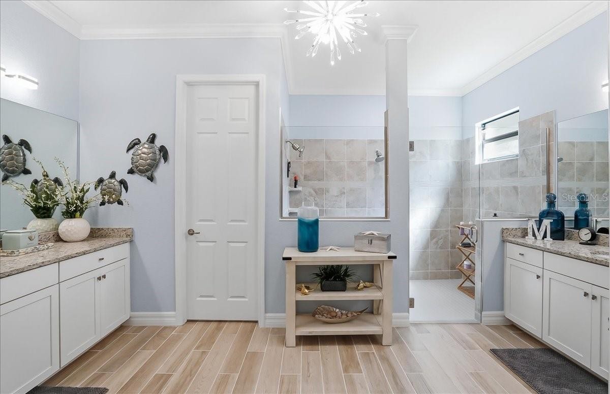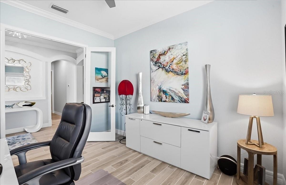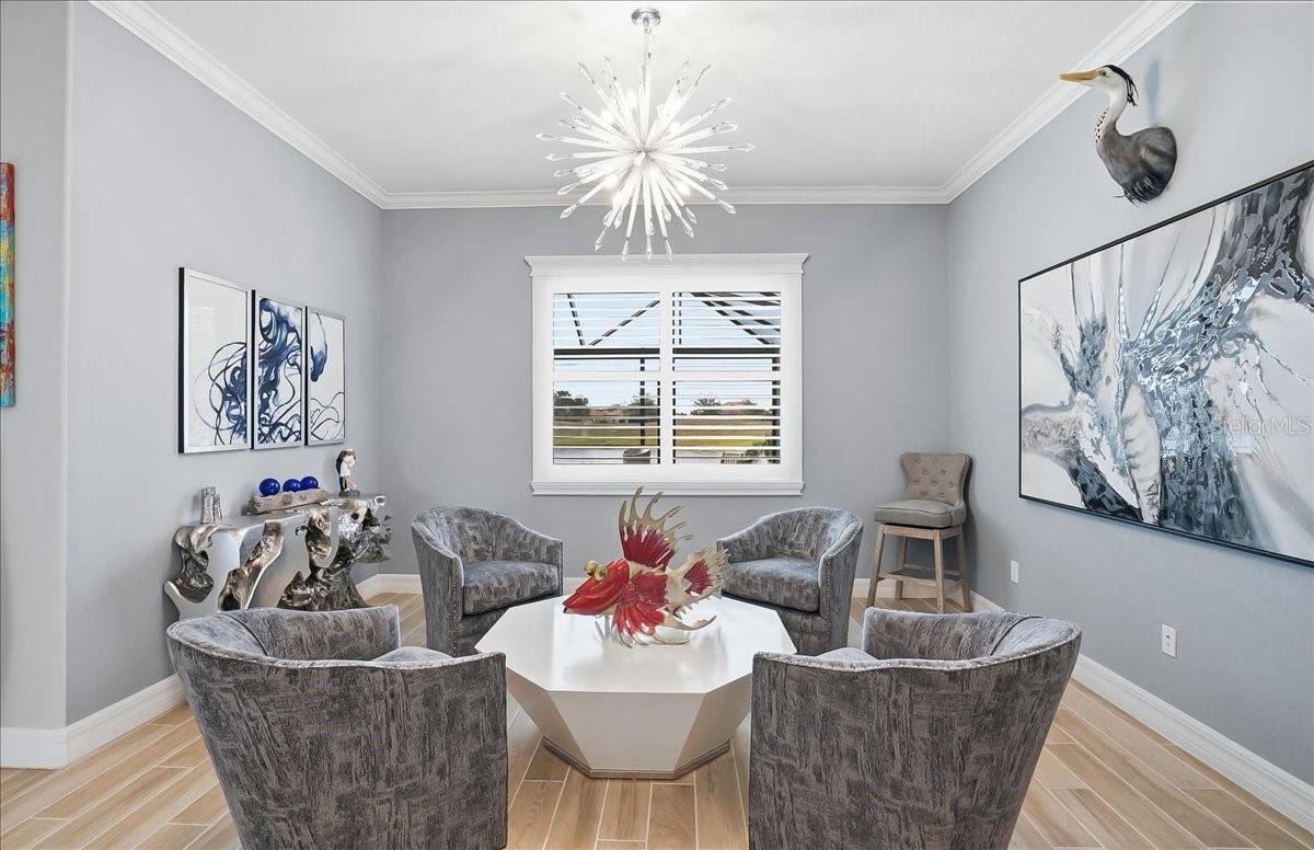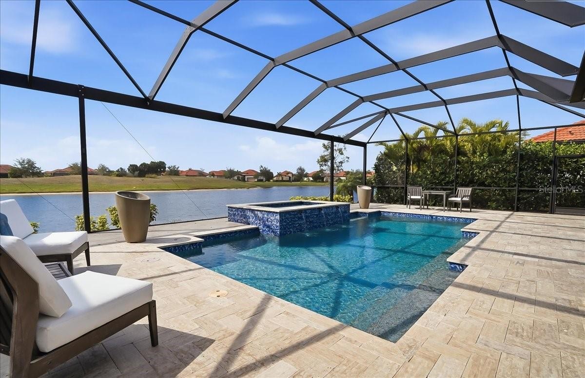 Welcome to a refined waterfront retreat where thoughtful design meets effortless luxury. Perfectly positioned within the highly sought-after Sarasota National — an Audubon International Certified Signature Sanctuary — this exceptional three-bedroom, three-bath residence offers privacy, elegance, and an unparalleled resort lifestyle, with no neighbors across the street and serene water views as your daily backdrop. From the moment you enter, architectural craftsmanship sets the tone. Crown molding, custom wood door arches, and a striking coffered ceiling in the living room create an elegant yet inviting ambiance. Exquisite light fixtures are thoughtfully curated throughout the home, enhancing its polished presentation. A triple-pane sliding glass door seamlessly opens to the outdoor living space, blending indoor and outdoor living in true Florida fashion. The grand gourmet kitchen serves as the heart of the home, appointed with crisp light cabinetry in excellent condition, expansive counter space, and a generous island ideal for casual breakfasts or elegant entertaining. Refined finishes complement the home’s upscale aesthetic, while the kitchen flows effortlessly into the dining and living areas — all oriented toward tranquil waterfront views. The living space features a beautifully designed stone-accented TV wall with an electric fireplace, adding warmth and architectural character. A dedicated den offers flexible space perfectly suited for a private office, media lounge, or additional guest accommodations — ideal for today’s evolving lifestyle. Tile flooring throughout the main living areas delivers timeless sophistication and easy maintenance, while plush carpeting in the bedrooms provides a cozy, luxurious retreat. The primary suite is a sanctuary of its own, highlighted by a tray ceiling, designer accent wall, and generous his-and-hers walk-in closets. The spa-inspired bath elevates daily living with dual vanities and an impressively oversized walk-in shower featuring dual shower heads, creating a true retreat experience. Two additional bedrooms — including a well-appointed in-law suite — ensure comfort and privacy for family and guests alike. The thoughtfully designed laundry room includes a sink and additional hanging cabinetry for everyday convenience. Step outside to your private oasis. A heated pool and spa with water features are framed by a picture-frame pool cage that provides unobstructed, breathtaking water views. The screened lanai invites both intimate evenings and grand entertaining, while motorized hurricane shutters are protective convenience and peace of mind. The three-car garage adds exceptional versatility — ideal for multiple vehicles, additional storage, a home gym, or hobby space — enhancing both lifestyle and practicality. This home includes two golf memberships, granting access to championship golf and the full Sarasota National experience. Residents enjoy the impressive 13,167 sq. ft. Palm Club with restaurant, bar and lounge, coffee room, library, and gathering spaces, along with a state-of-the-art fitness center, tennis, pickleball, bocce, dog park, resort-style zero-entry pool with lap lanes, expansive event lawn, and golf pro shop. Located just minutes from sugar-sand beaches, premier shopping, dining, and cultural experiences, this is more than a residence — it is a statement of refined waterfront living, where luxury, nature, and community exist in perfect harmony.