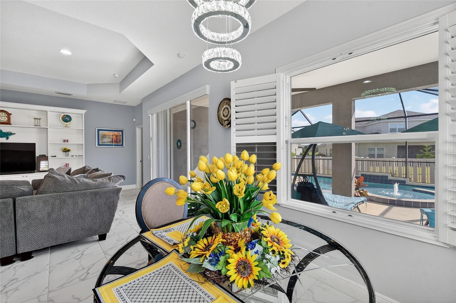 One or more photo(s) has been virtually staged. Welcome to this beautifully upgraded 3-bedroom, 2-bath home with a dedicated office/bonus room in the highly sought-after, gated community of Silverleaf. Built in 2017 and situated on a desirable corner lot, this 1,946 sq ft residence offers an exceptional blend of comfort, function, and Florida lifestyle living. Step inside to an inviting open floor plan filled with natural light, designer fixtures, and tray ceilings. The chef’s kitchen features modern snowwhite cabinetry, granite countertops, stainless steel appliances, a gas range, built-in microwave, walk-in pantry, and a large island with seating that flows effortlessly into the casual dining and family room. A custom built-in entertainment wall with shelving and lower cabinets enhances the living area, while sliding glass doors open fully to the screened outdoor oasis. Enjoy year-round relaxation in your private heated pool and spa—large enough for lap swimming—set within a fully screened enclosure and fenced backyard. The spacious owner’s suite includes a sizable walk-in closet with custom built-ins and an en-suite bathroom featuring dual sinks and a walk-in shower. Additional highlights include laminate flooring in all bedrooms, tile throughout main areas, plantation-style window shutters, custom closets in every bedroom, separate laundry room with washer and dryer, hurricane shutters, irrigation system, and an extended 2-car garage. Silverleaf offers resort-style amenities including a heated pool and spa, poolside kitchen pavilion, clubhouse, fitness center, basketball court, soccer field, playground, picnic areas with grills, two dog parks, and scenic natural trails—all with low CDD fees included in the tax bill. Ideally located near Ellenton Outlet Mall, restaurants, Fort Hamer Park, boat ramps, airports, and Gulf Coast beaches with easy access to I-75 and the Sunshine Skyway. This stunning home is move-in ready and perfectly designed for modern Florida living—schedule your visit today!