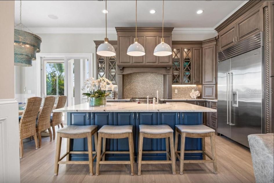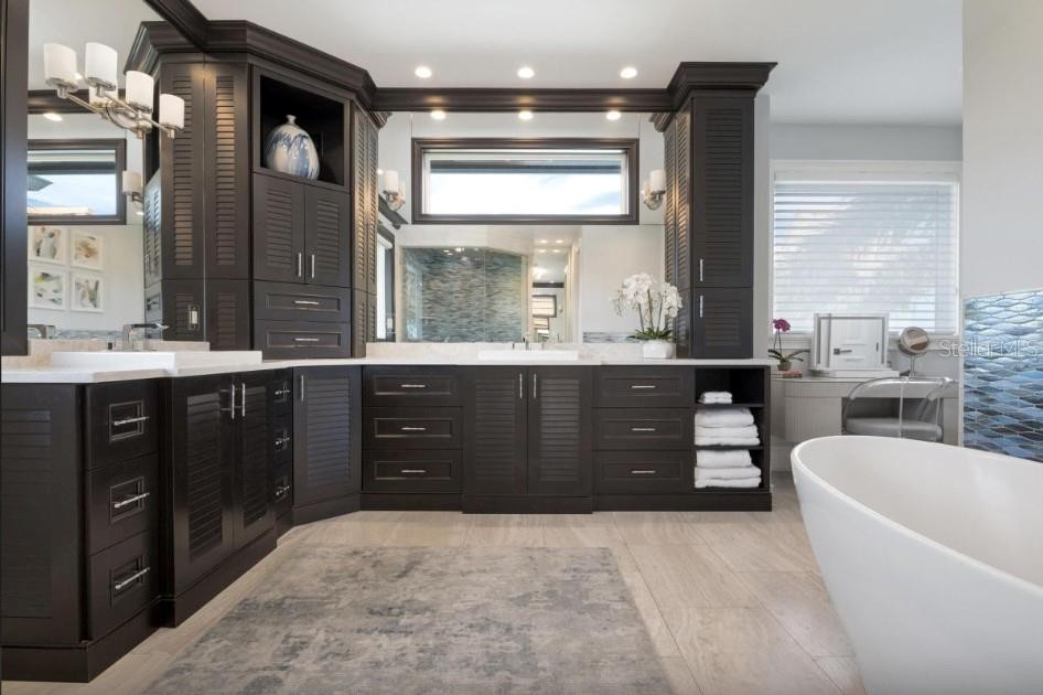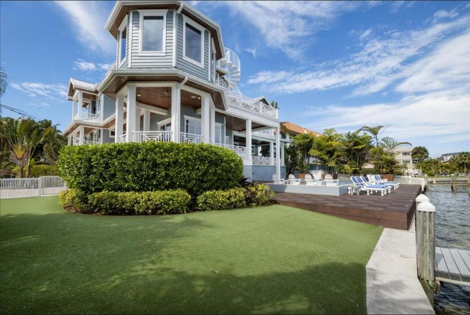 Experience the pinnacle of waterfront living in this extraordinary custom bayfront estate, offered fully turn-key and professionally decorated. Encompassing 6,000 square feet of living space and 8,747 square feet under roof, this architectural masterpiece delivers breathtaking 360-degree panoramic views of the Gulf of Mexico and The Inter Coastal Water Way,through dramatic floor-to-ceiling glass walls. Designed for both grand entertaining and relaxed coastal living, the residence features 7 spacious bedrooms, 5 full bathrooms, and 2 half baths. Two fully equipped gourmet kitchens showcase solid wood custom cabinetry, striking tile backsplashes, oversized marble countertops with expansive islands, and high-end stainless-steel appliances, including gas ranges—perfect for hosting family and guests with ease. The luxurious primary suite offers a serene retreat with an elegant en-suite bath, complete with a soaking tub and walk-in steam shower. Additional highlights include an elevator, private theater room and a game room with pool table, creating exceptional indoor entertainment spaces. Outdoor living is elevated to resort caliber with expansive balconies featuring a built-in outdoor kitchen, bar, and dining area—ideal for sunset gatherings. The spectacular heated pool boasts a waterfall feature, sun shelf, and a spa with custom lighting, all overlooking tranquil bay waters. Boating enthusiasts will appreciate the private dock, two boat lifts, and jet ski lift, while a rooftop deck offers yet another vantage point for unforgettable views and stargazing. Recent upgrades include five new central HVAC systems, new flooring, new garage doors, new poolside tile, fresh interior and exterior paint, designer wallpaper, updated light fixtures, and new washer and dryer—ensuring effortless, worry-free ownership. This property is ideally suited for weekly short-term rentals, offering a rare opportunity to combine luxury ownership with strong income potential. Its premier bayfront location, expansive sleeping capacity, resort style amenities, and turnkey, professionally decorated interiors make it highly desirable for high end vacation rentals and multi-family retreats on Anna Maria Island. This is a rare opportunity to own a one-of-a- kind luxury home with timeless design, modern upgrades, and unparalleled water views converge.
