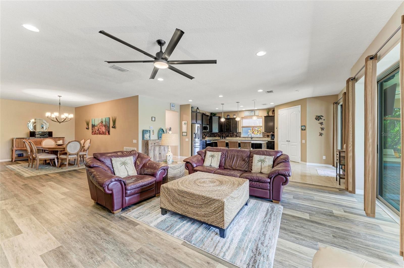 Welcome to your dream home in Harrison Ranch! This beautifully upgraded 3 bedroom, 2.5 bath + office home offers the perfect blend of style, comfort, and functionality. From the moment you arrive, you’ll notice the curb appeal with meticulous landscaping, decorative curbing around the flower beds, a breezeway with screen door, and a custom glass front door. Step inside to an open floor plan with vinyl plank flooring throughout the main living areas. The kitchen features stainless steel appliances, cabinets with crown molding, granite countertops, tile backsplash, a center island with pendant lighting, and a spacious walk-in pantry. It opens seamlessly to the great room and large dining room, making entertaining effortless. The master suite is a true retreat, complete with sliders that open directly to the pool, dual sinks, quartz countertops, a walk-in shower, and a large walk-in closet. The two additional bedrooms and office are located on the opposite side of the home, ensuring privacy for everyone. The large laundry room offers extra cabinets and a sink for added convenience. Step outside to your own private paradise—an inviting heated pool with a sun shelf, built-in table and seating area, brick paver patio, and plenty of space for entertaining. The peaceful pond and preserve views create a serene backdrop to enjoy sunsets over the water, where you can often spot deer in the evenings. The home also boasts a 3-car tandem garage, perfect for larger vehicles, boat storage, or workshop. Additional features include hurricane shutters, landscape lighting, gutters, irrigation system, and more. Living in Harrison Ranch means enjoying resort-style amenities, including a 24-hour fitness center, heated junior Olympic pool, tennis courts, new basketball and pickleball courts, 5.5 miles of nature trails, and an on-site activities director who organizes events for all ages. With easy access to Tampa, St. Pete, and Sarasota—all within 45 minutes, this home offers both tranquility and convenience. Whether you’re enjoying morning coffee by the pool or hosting friends and family, this home truly checks every box for easy Florida living.