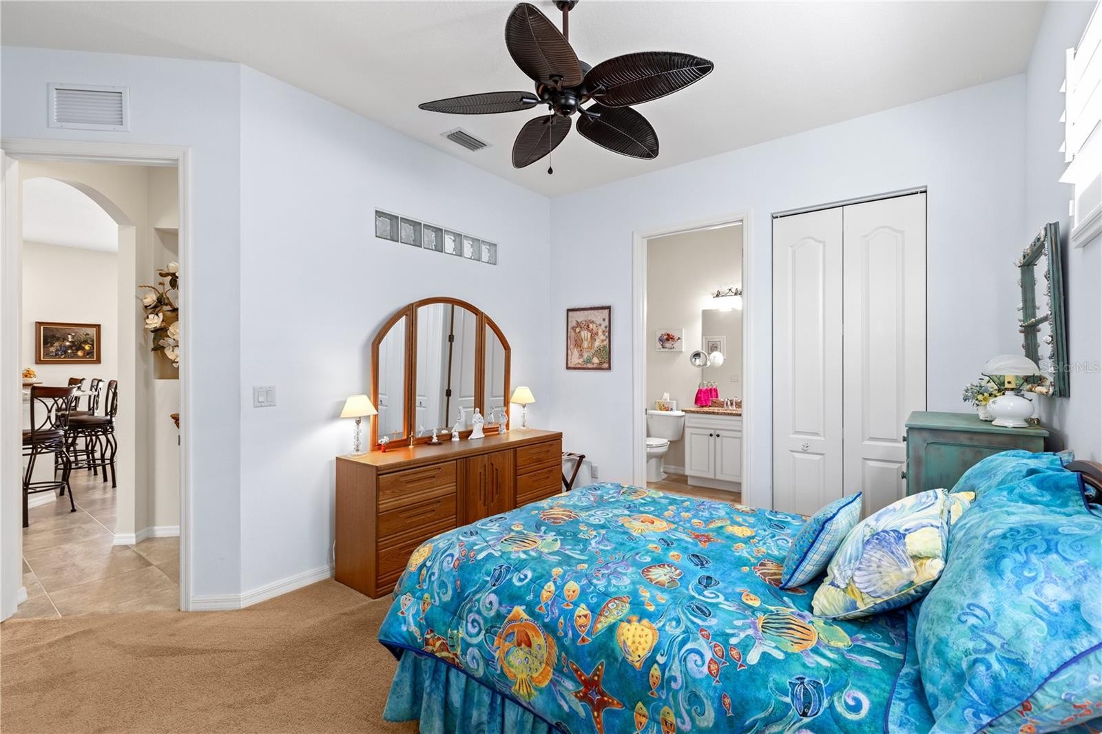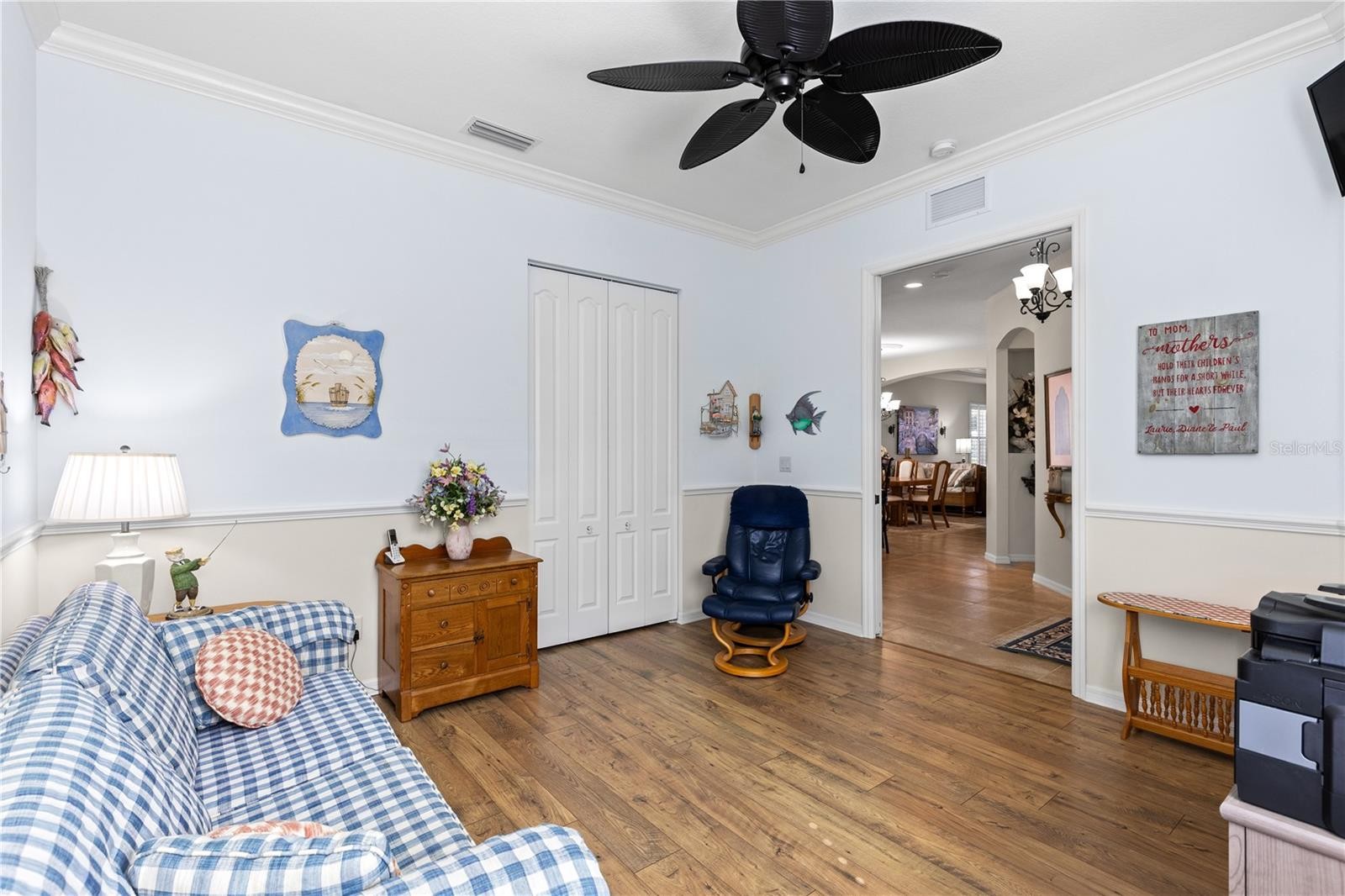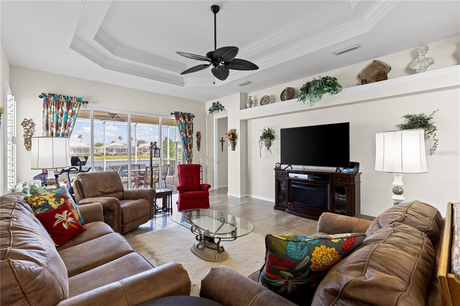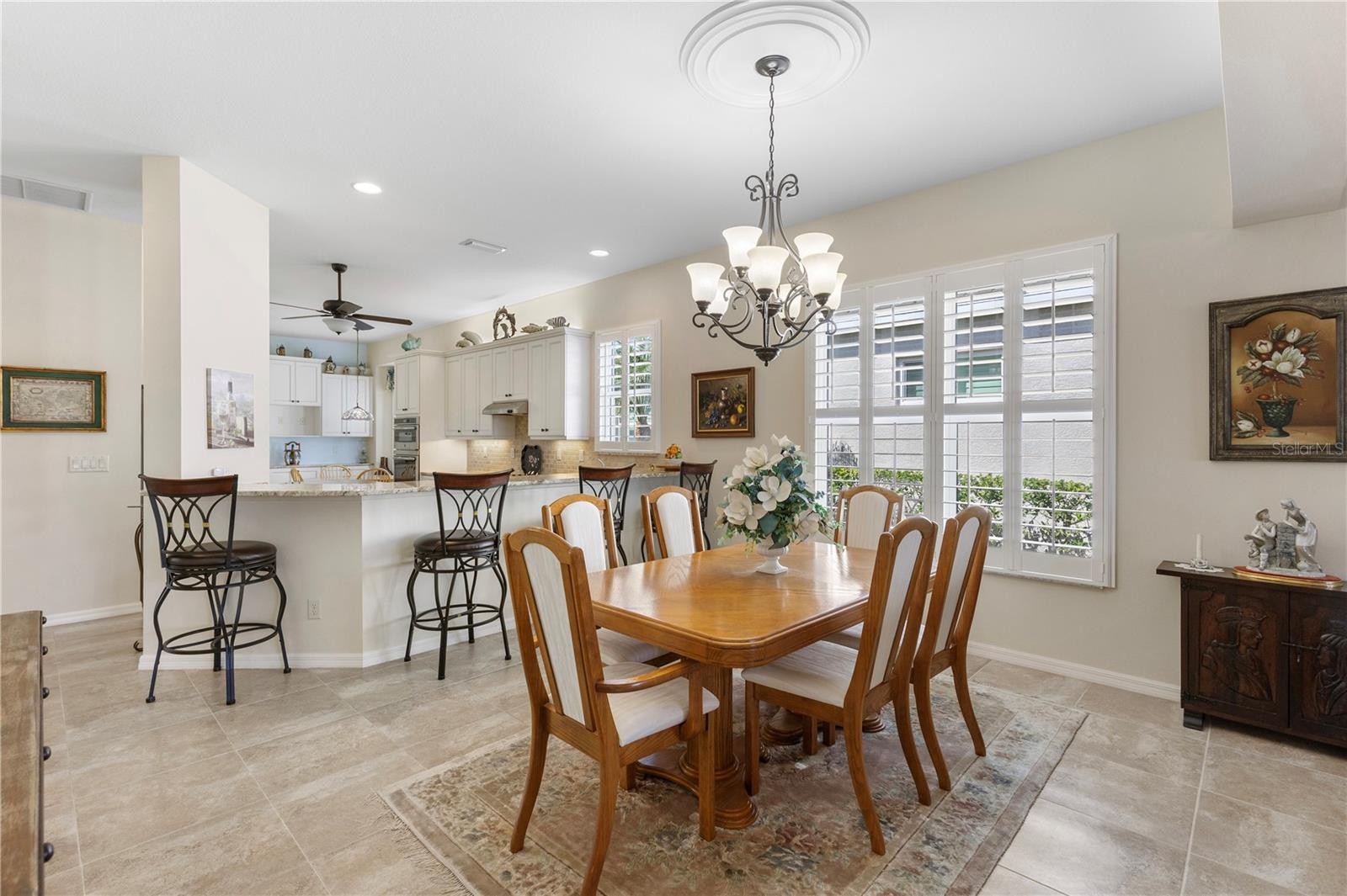 Elegant, Maintenance-Free Living with Stunning Water Views! Wake up to serene lake views and enjoy the best of Florida living in this beautifully maintained detached villa in the highly desirable St. Andrews East at The Plantation Golf & Country Club. This home combines luxury and comfort with the ease of maintenance-free living, and a peaceful extended lanai overlooking the water. Inside, the home features plantation shutters, an architectural arch that defines the living and dining areas, and a double tray ceiling, which adds character to the living space. The tile floors ensure easy maintenance and a clean, cohesive look throughout the main living areas. The kitchen is a showstopper, designed with both beauty and practicality in mind. You'll love the creamy, soft-toned cabinetry, granite countertops, stainless steel appliances (with refrigerator replaced in 2023), wall oven and microwave, center island, pantry, and a bay window that brightens the eat-in area. A breakfast bar adds extra space for casual meals and entertaining. This villa is equipped with impact-rated storm windows and clear Lexan panel shutters for the sliding glass doors, ensuring you're well-prepared for storm season. The primary suite offers a peaceful retreat with two walk-in closets, dual vanities, and a walk-in shower. The split floor plan is ideal for guests, featuring a guest suite with private bath and walk-in closet, plus a third bedroom (currently used as a den) with convenient access to a separate half bath. St. Andrews East residents enjoy access to two community pools, a social clubhouse, and a carefree lifestyle with HOA fees that include: exterior insurance (drywall out), roof reserves, painting, lawn care, high-speed internet, digital TV, pest control, termite prevention, and full community management. Optional membership at The Plantation Golf & Country Club opens the door to two championship golf courses, 13 Har-Tru tennis courts, six pickleball courts, bocce ball, fitness center, Jr. Olympic pool, and fantastic dining and social activities. Located just minutes from Venice’s Gulf beaches, Wellen Park Downtown, the Atlanta Braves Spring Training Stadium, shopping, dining, and easy access to I-75, this lakefront villa offers it all. Don’t miss this rare opportunity to own a waterfront villa in one of Venice’s most sought-after communities—schedule your private showing today!