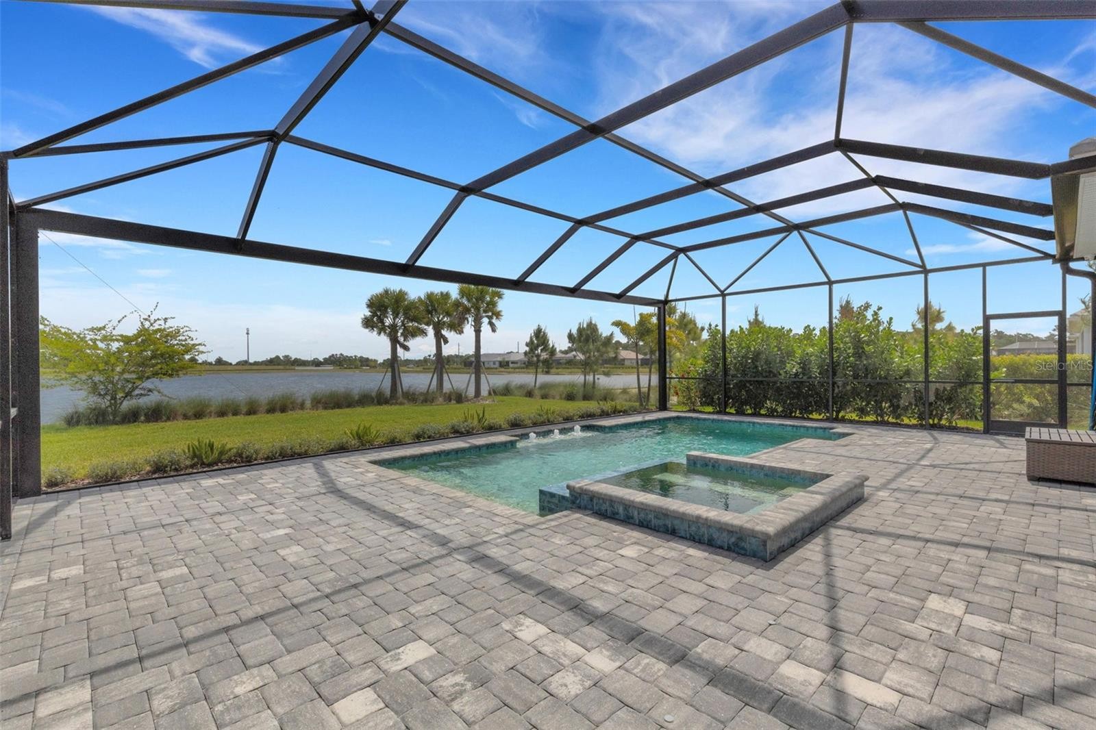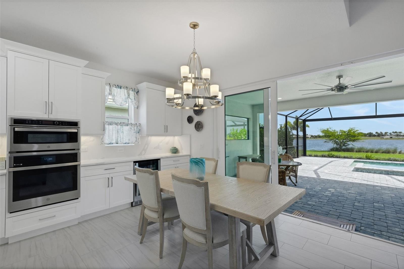 Expansive WATER VIEWS from the spacious lanai set the tone for this beautifully designed home in Lakehouse Cove at Waterside, ideally positioned along the expansive, private setting of Lake Ibis and close to scenic walking trails. From the moment you arrive, the welcoming FRONT PORCH and clean architectural lines create a warm, polished first impression. Inside, natural light fills the home, highlighting MARBLE-LOOK PLANK TILE FLOORING throughout—no carpet anywhere—and creating a seamless, luxurious living environment. The open-concept design offers effortless flow, anchored by a stunning GOURMET KITCHEN featuring upgraded quartz countertops with full-height quartz backsplash, wall oven (convection) and microwave, expanded cabinetry, wine bar area with refrigerator, roll-out shelves in cabients and a spacious walk-in pantry with wood shelving, and a large center island ideal for gathering and entertaining. The living and dining areas are thoughtfully oriented to capture the home’s sweeping water views, enhancing the BRIGHT AND AIRY feel throughout. The primary suite provides a peaceful retreat with a generous walk-in closet and a beautifully appointed bath with dual vanities and a spacious walk-in shower. A well-appointed guest bedroom and a second full bath extends comfort and privacy, while details like wood shelving in all closets and pantry add both quality and function. The large FLEX ROOM WITH GLASS DOORS can be used as a den, office, exercise or hobby room. Most rooms have PLANTATION SHUTTERS and ceiling fans. Step outside and experience true indoor-outdoor living. The screened EAST-FACING lanai showcases a BEAUTIFUL SALT WATER POOL AND SPA set against a backdrop of wide, uninterrupted lake views across Lake Ibis—offering a sense of openness, privacy, and calm that is hard to find. The pre-plumbed area for an outdoor kitchen is ready for you to customize the outdoor space exactly the way you want it. Additional highlights include a spacious laundry room with utility sink and extra cabinetry, security system, along with a highly-valued 3-CAR TANDEM GARAGE (2 car garage with expanded storage area) providing flexibility for storage, hobbies, or a golf cart. HURRICANE IMPACT WINDOWS AND DOORS. Internet access and LAWN AND LANDSCAPE MAINTENANCE included in HOA Fee. Residents of Lakehouse Cove enjoy a lakeside clubhouse, resort-style pool and spa, fitness center, pickleball courts, dog parks, scenic walking trails, and water taxi access to Waterside Place for dining, shopping, and events—all just minutes from UTC, Lakewood Ranch Main Street, Sarasota Polo Club, and the Gulf beaches. Open. Light-filled. Exceptional views. A beautifully designed home centered around space, comfort, and effortless Florida living.