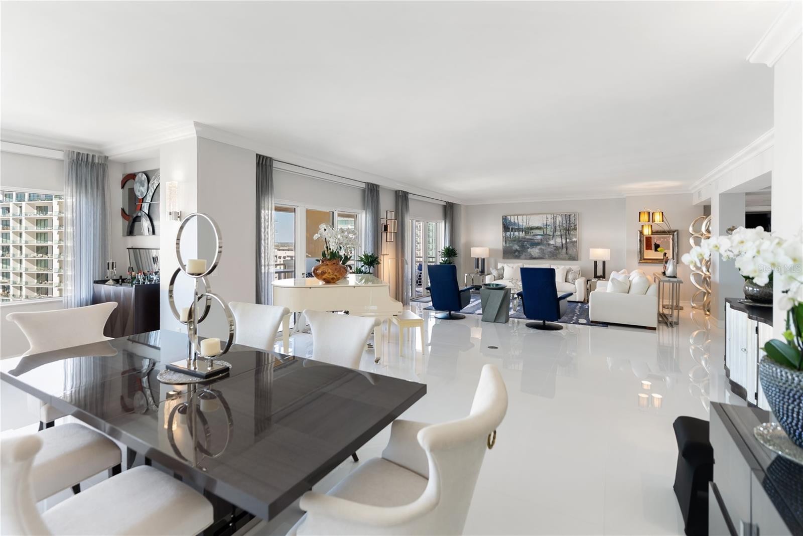 Experience luxury living at the iconic Ritz-Carlton Residences. The most updated unit in the building, this penthouse features top-of-the-line finishes, 24” Portugal tile throughout, water views from every room, and western exposure for stunning Sarasota Bay sunsets. The state-of-the-art kitchen includes bespoke cabinetry, a large island, and premium appliances. Three en-suite bedrooms, a private theater room, and a Sonos sound system complete the interior. Expansive windows frame bay views by day and vibrant western sunsets in the evening. This unit conveys with a Ritz-Carlton Gold Membership, providing access to the Beach Club and Golf Club. Residents enjoy full-service amenities including valet, concierge, in-room dining, on-site restaurants, and a fitness center. Everything you need for refined city living is seamlessly combined in this penthouse. Two premium parking spaces and nearby marina access are included. This penthouse can be purchased turnkey, with panoramic water views, exceptional design, and the service and prestige of the Ritz-Carlton brand.