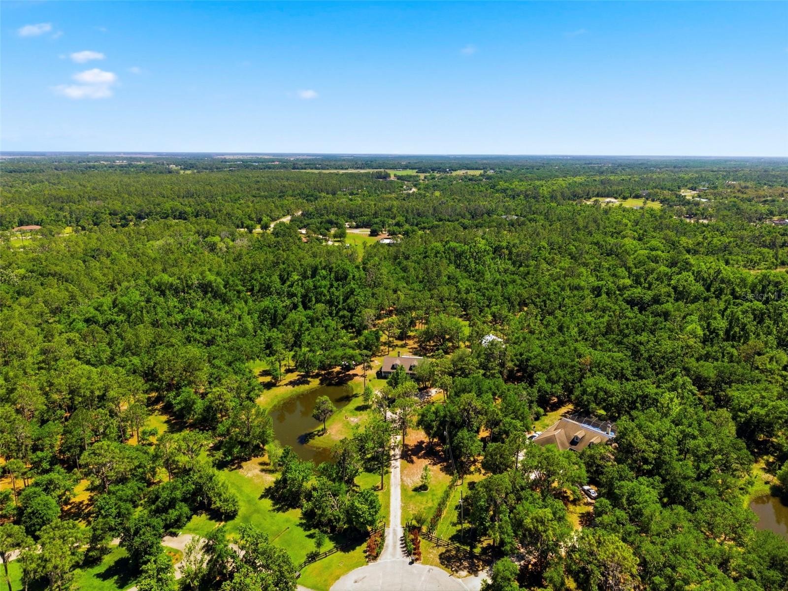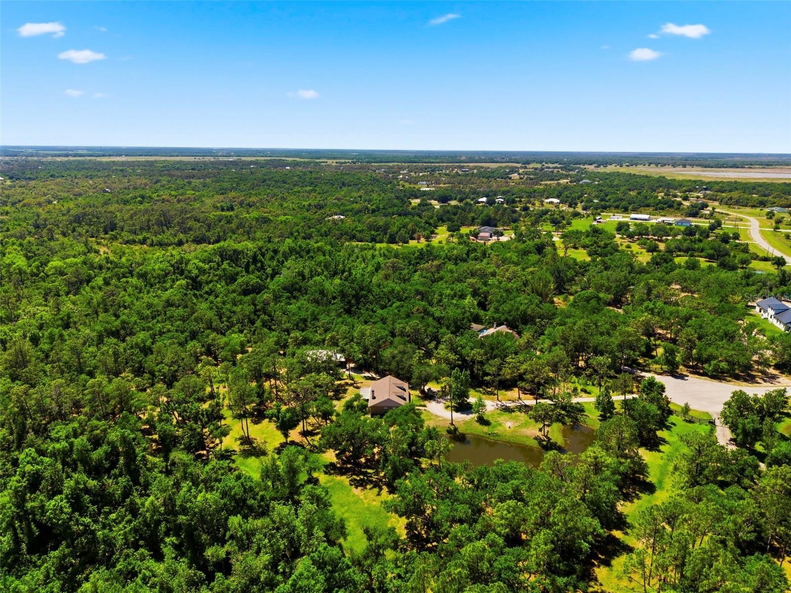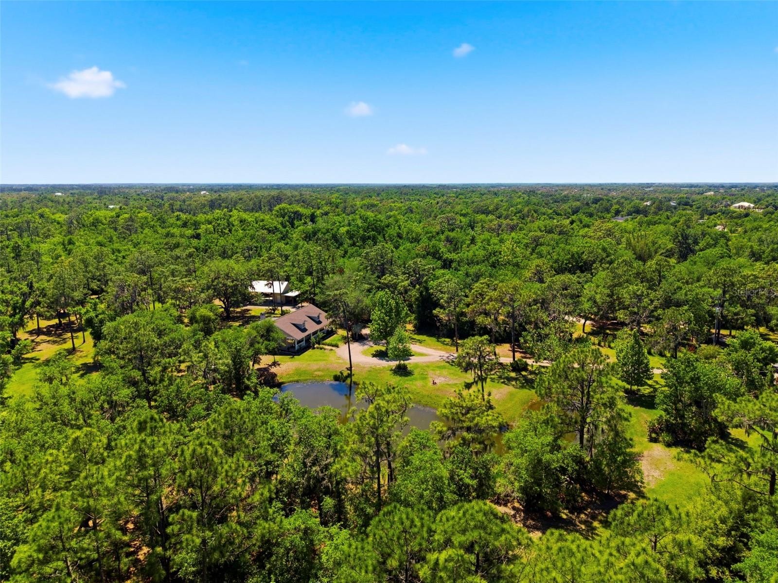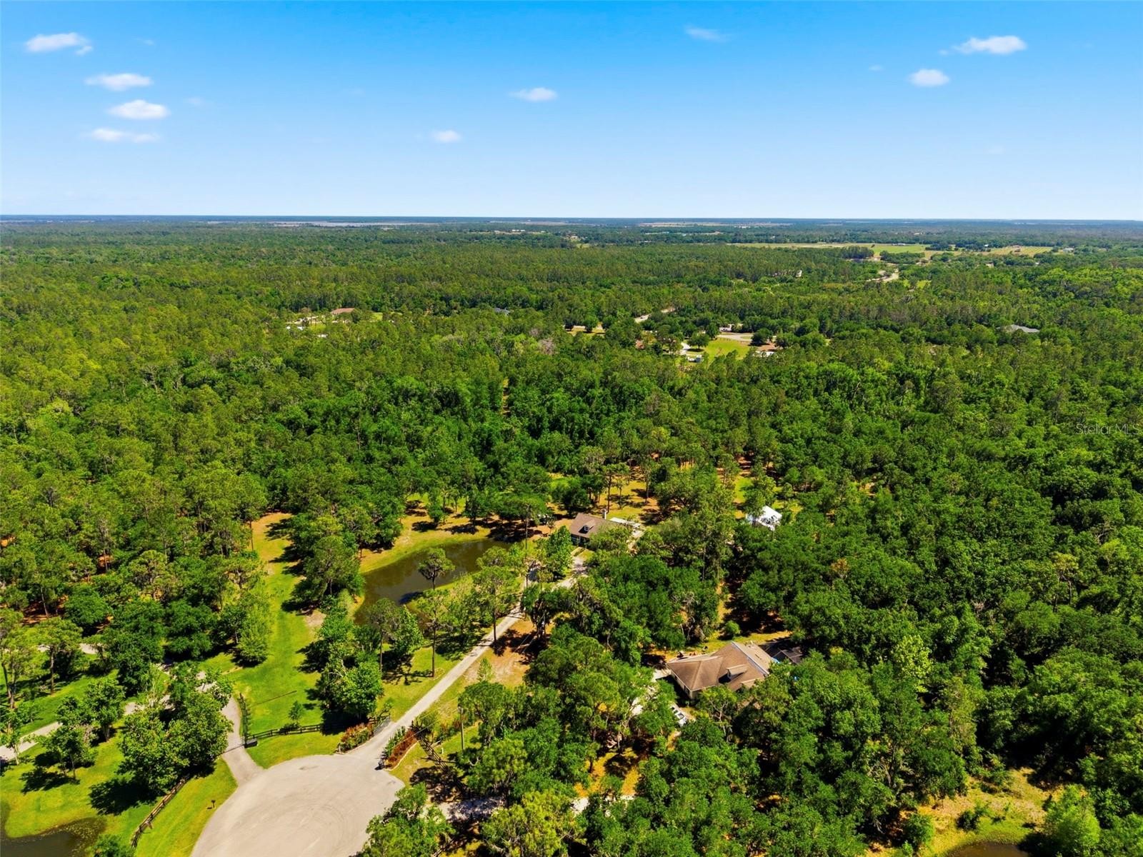 Set on a private, pie-shaped 7.95-acre lot, In Winding Creek, that stretches deep into the lush wooded forest, this partially fenced estate offers a rare combination of usable land, natural beauty, and thoughtful improvements. The grounds feature a private fishable pond, expansive cleared areas for recreation, and wooded sections that create privacy, including a charming enclosed treehouse with deck. The home is complemented by a detached two-story carport offering two oversized covered parking area and two heated and cooled rooms (one upstairs and one downstairs, not included in the published sq/ft), ideal for an air-conditioned workshop, hobby space, or guest overflow. Additional exterior highlights include a well-maintained and covered well system with pump, bladder tank, and filtration, a huge circular driveway, irrigation system, and beautifully manicured front and rear lawns with lush landscaping. Inside, the open floorplan features vaulted ceilings throughout the main living areas, a spacious living room with a wood-burning fireplace, and a kitchen with stainless steel appliances, breakfast bar seating, and a large dining area. The home offers three bedrooms and two fully updated bathrooms, along with an inside laundry room complete with washer, dryer, second refrigerator, and side entry access. Flooring includes hardwood and tile throughout the main living areas, bathrooms, and primary suite, with wood laminate in the secondary bedrooms. Enjoy outdoor living year-round from the 12x24 covered and screened rear patio with double door access from both the living room and primary bedroom. With a new roof in 2024 and a property that balances open space and wooded privacy, this is a truly unique opportunity to own nearly 8 acres with exceptional features and flexibility. Winding Creek is a private, nature-surrounded community featuring an equestrian center and expansive common areas ideal for walking, hiking, biking, and horseback riding, conveniently located approximately 20 minutes east of I-75 off SR 64.