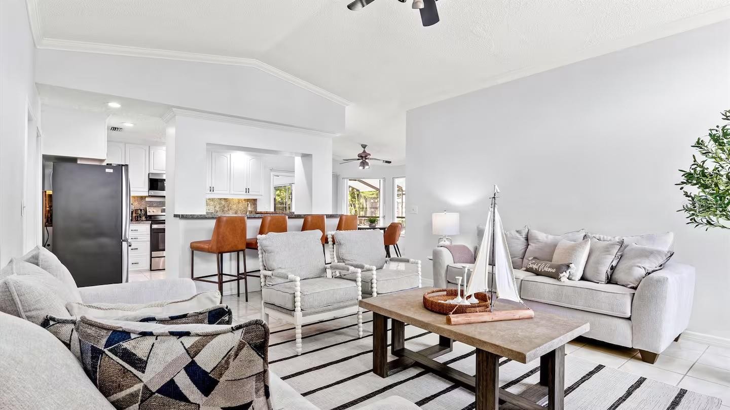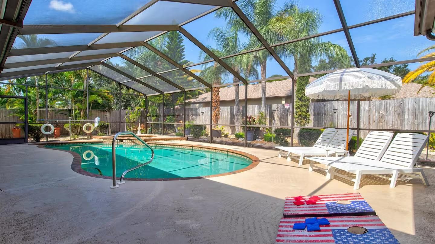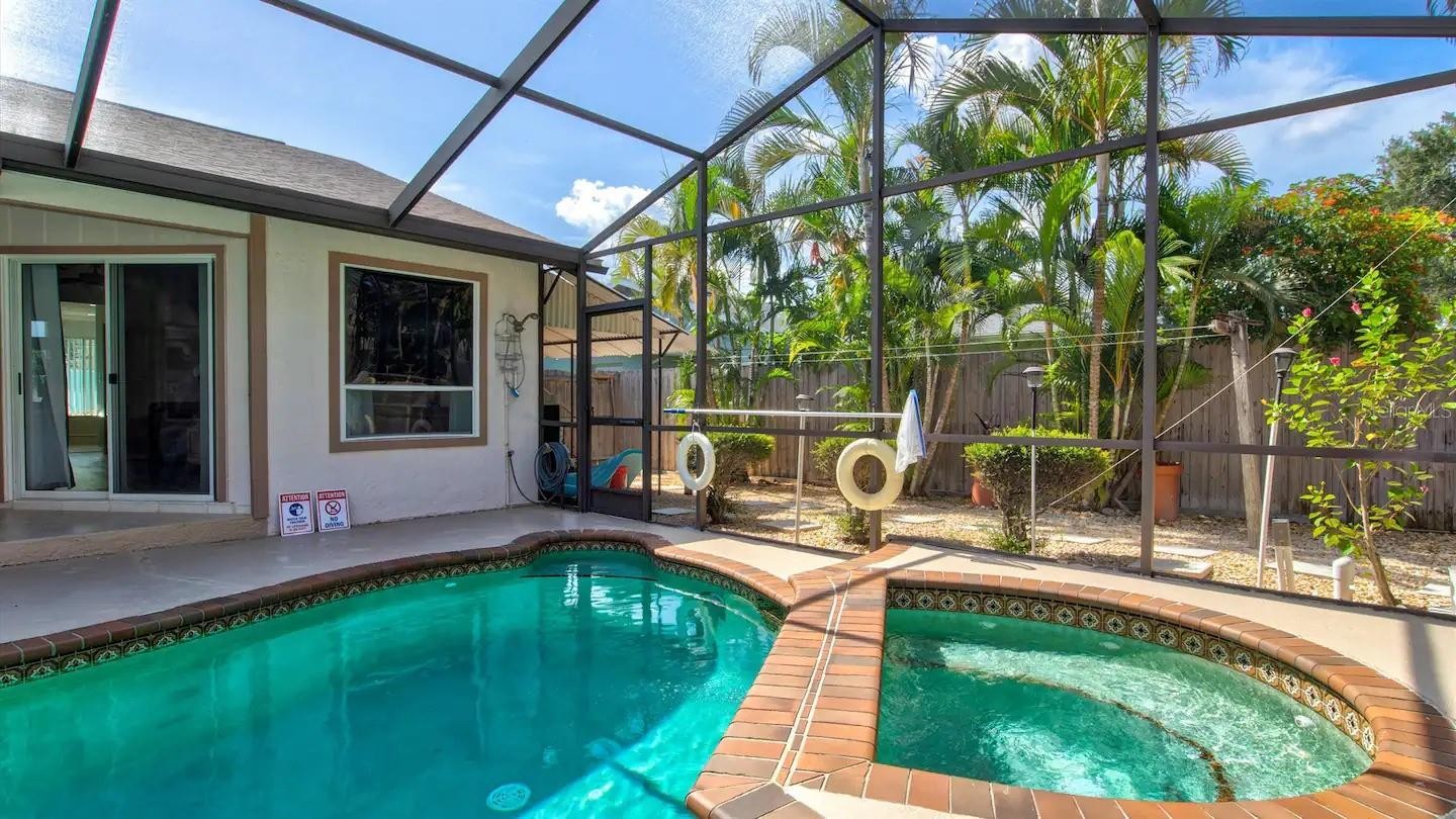 **TURNKEY FURNISHED** Welcome to this absolute must-see home, ideally located in the heart of Northwest Bradenton. Enjoy a prime location within walking distance to Stewart Elementary and King Middle School. This well-appointed residence features four bedrooms, three bathrooms, and a convenient inside laundry room. The spacious primary suite boasts a large walk-in closet with ample storage. Additional highlights include crown molding throughout, a tankless water heater, and a gorgeous wood-burning fireplace. Step outside to beautifully landscaped grounds, a fully fenced backyard, and a stunning screened-in pool and spa, complemented by a large covered patio—perfect for outdoor dining and entertaining. Major updates include a newer roof (2018), Newer AC and the home has been freshly painted inside and out. Conveniently located near Manatee Avenue, offering quick access to Highway 41 and the beaches. Schedule your private showing today—this exceptional home won’t last long!