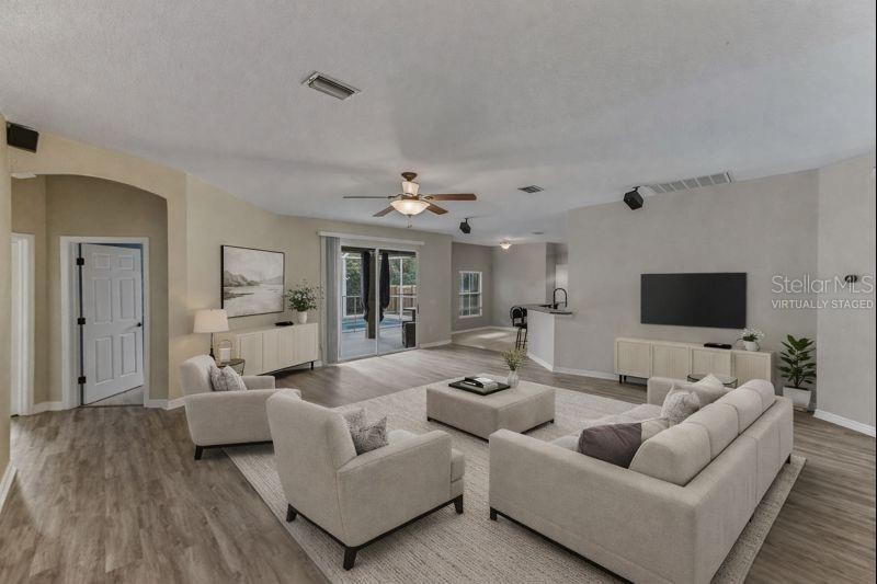 One or more photo(s) has been virtually staged. Welcome to this spacious and well-appointed 4-bedroom, 2-bath home with a versatile BONUS ROOM, ideal for a home office, man cave, or flex space. Featuring an open-concept layout with high ceilings, the main living areas are enhanced by NEW LUXURY VINYL FLOORING, while the bedrooms offer comfort with brand-new carpet. A WHOLE HOUSE Water Softener for added comfort! Step outside to your PRIVATE outdoor retreat — a huge screened lanai overlooking a beautiful IN-GROUND POOL AND SPA combination, complete with a child safety gate and solar pool heater for year-round enjoyment. A FENCED side yard provides the perfect space for pets or play equipment, while a detached storage shed offers additional storage for tools and hobbies. This property includes an EXTRA LOT, offering exceptional privacy and a total LAND SIZE OF APPROXIMATELY 0.64 acres — a rare find. The home is equipped with hurricane shutters for added peace of mind and is NOT LOCATED IN A FLOOD ZONE. With NO HOA and NO CDD, there’s plenty of room to bring your toys, boats, or RVs. Situated in a quiet neighborhood, just a short drive to local Gulf beaches, and conveniently close to shopping, dining, and medical facilities, this home offers the perfect balance of space, freedom, and location. SCHEDULE YOUR APPOINTMENT TODAY!!