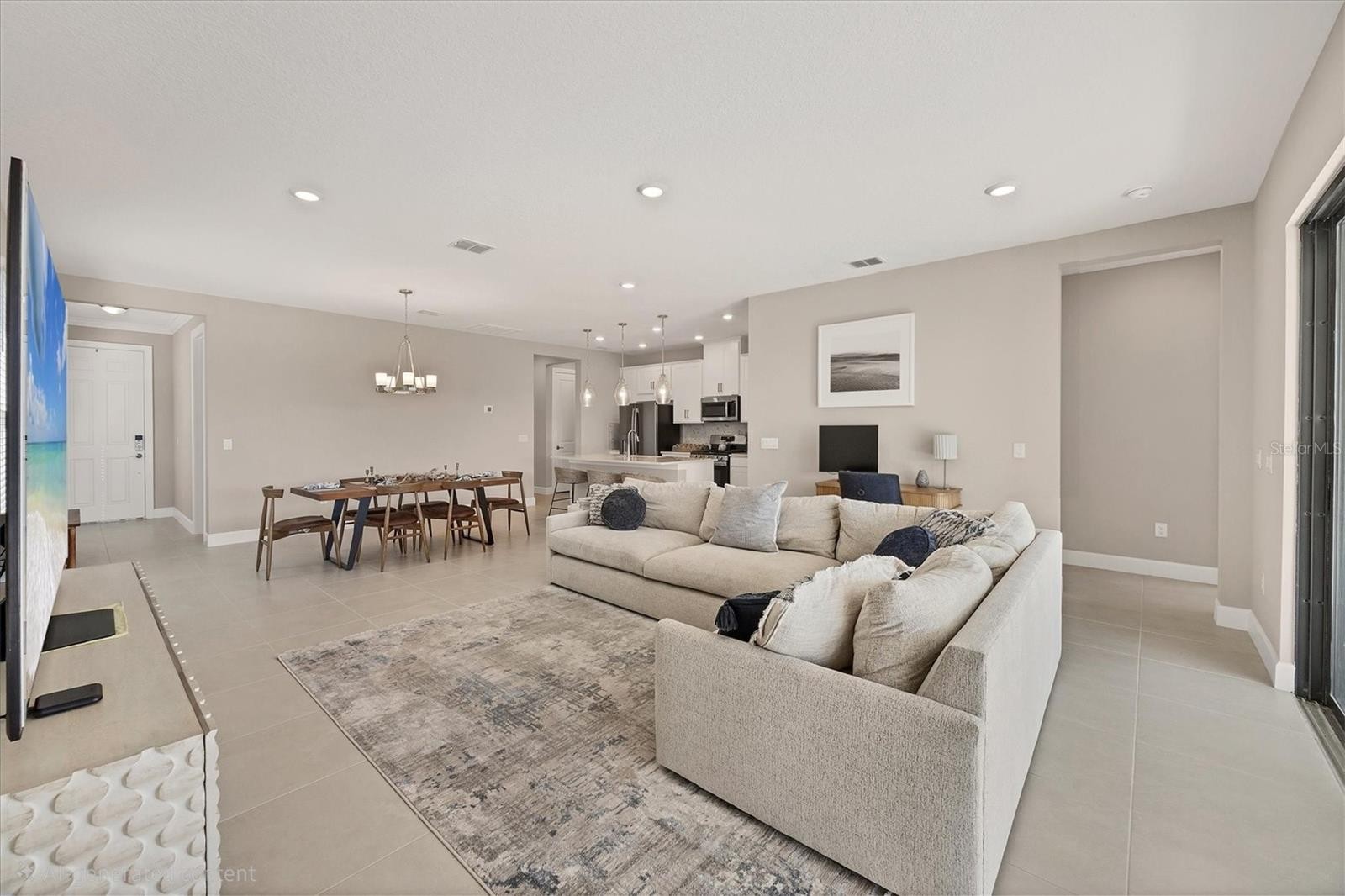 Lightly lived in and like new, this Matera floor plan at Esplanade at Artisan Lakes has been occupied for only a few months, offering the feel of new construction without the wait. The open-concept main living area features an open kitchen, café dining, and family room with views to the covered, extended lanai. The kitchen includes a large center island and step-in pantry. The owner’s suite offers dual sinks, a large shower, private water closet, and a spacious walk-in closet with direct access to the laundry room. Two additional bedrooms are conveniently located near a full bath, ideal for guests. Structural options include a covered extended lanai, 4' garage extension, 8' interior door openings, and outdoor kitchen rough-in.
