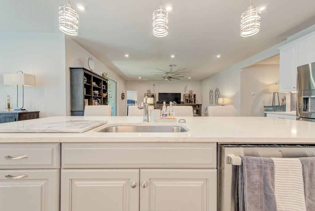 From the moment you arrive, the upgraded stone-accent elevation, elegant glass front door, and professionally designed landscaping create an impressive first impression. Inside, a grand foyer with soaring ceilings, crown molding, upgraded trim, and wide-plank luxury vinyl flooring sets the tone for this beautifully upgraded 4-bedroom plus den home. Designed for both everyday living and entertaining, the thoughtful split-bedroom floorplan includes a private guest suite at the front of the home, ideal for visitors, teens, or multigenerational living, along with a separate enclosed den perfect for a home office, reading room, or media space. The heart of the home is the expansive open-concept living area, where the great room, dining space, and chef’s kitchen flow seamlessly together. The upgraded kitchen features white solid-wood cabinetry, quartz countertops, crown molding, designer backsplash, under-cabinet lighting, pendant lighting, a large center island, built-in cooktop, and double wall ovens. Natural light fills the living space and draws your eye through the sliding glass doors to the oversized screened lanai, creating the perfect indoor-outdoor lifestyle for enjoying morning coffee, evening sunsets, or gathering with family and friends. Privately tucked away at the rear of the home, the spacious primary suite offers a tray ceiling, spa-inspired bath with oversized walk-in shower and dual vanities, and a generous walk-in closet with custom cabinetry. Additional upgrades include luxury vinyl flooring throughout nearly the entire home, a 3-car garage with utility sink, hurricane shutters, smart thermostat, Wi-Fi-enabled garage door opener, upgraded lighting and electrical, TV and internet prewiring, irrigation system, 14 SEER A/C, and 150 MPH wind-load construction. Located in The Retreat at Lexington North, residents enjoy a low-HOA, no-CDD community with resort-style amenities including a pool with cabanas, playground, dog park, basketball and pickleball courts, sidewalks, and scenic walking trails. Ideally situated just off US-301 with quick access to I-75, the home is only minutes from shopping, dining, and everyday conveniences, while downtown Bradenton, Lakewood Ranch, Sarasota, Tampa, St. Petersburg, and the beaches of Anna Maria Island and Siesta Key are all within an easy drive.