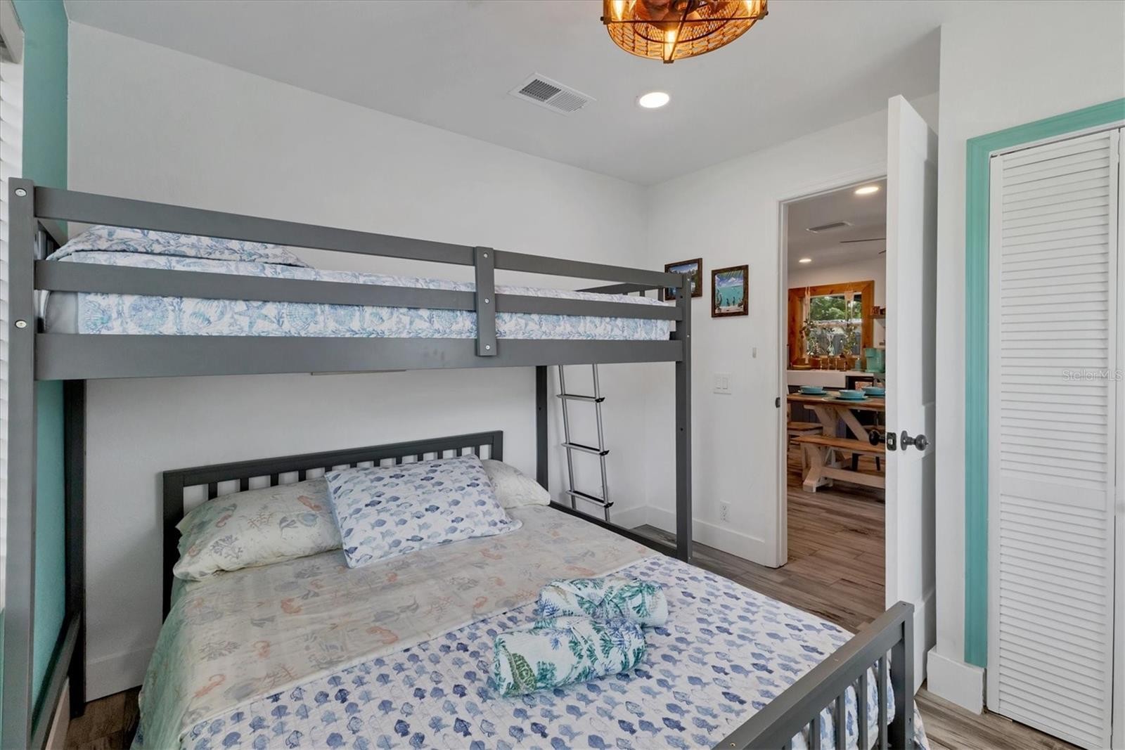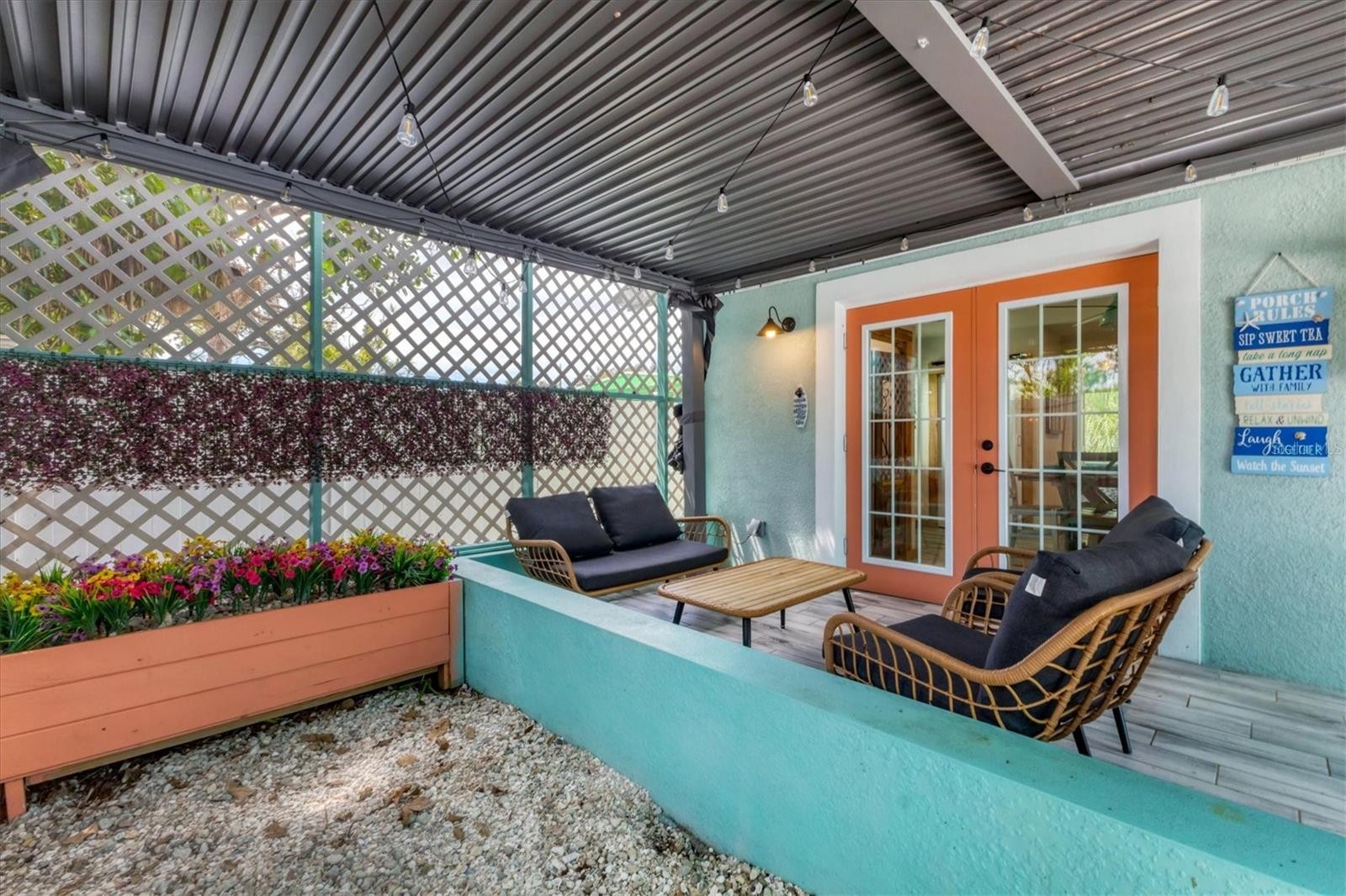 LOCATION, LOCATION, LOCATION! Welcome to your 3 bedroom, 2 full bath COASTAL PARADISE — sold mostly furnished! This home puts you right in the heart of Englewood’s charm, just steps to Historic Dearborn Street with shops, dining, entertainment, and local events. Partial view from your front yard of the bay. No detail has been spared! Updates include a METAL ROOF, new A/C, fully filled concrete block walls with filled reinforced headers, HURRICANE-RATED WINDOWS & DOORS, and closed-cell foam insulation. The kitchen and 3rd bedroom feature RAISED FLOORS, while the wood-look tile floors flow throughout. The kitchen is a SHOWPIECE — two-tone cabinets, stainless steel appliances, farmhouse sink, open shelving with wood accents, and custom trim details. Interior laundry with stack washer dryer and featuring a walk in PANTRY with customer shelves and SALOON style doors. Both baths are fully renovated — one with a WALK-IN SHOWER accented by blue tile, a wood ceiling, and a built-in shampoo niche; the other with a rustic tile tub surround and sleek vanity. Bedrooms are set for comfort — queen suite, twin room, and a bunk room with a full bed below. Closets feature CUSTOM BUILT-INS and shelving. Outside, relax on the COVERED REAR PORCH WITH PAVERS, enjoy the shady pergola with string lights, or swing in your hammock. A DETACHED CARPORT WITH METAL ROOF adds extra storage and protection. And yes — you can KEEP YOUR BOAT IN YOUR YARD with Indian Mound Park and Lemon Bay just blocks away, offering a public boat ramp, kayak launch, and those jaw-dropping sunsets. Nearby, explore Lemon Bay Park & Nature Center (210 acres of trails and boardwalks) or reflect at Veterans Memorial Park. Perfect for FULL-TIME LIVING, SEASONAL ESCAPE, OR TURN-KEY INCOME PROPERTY with proven rental history. Just bring your flip-flops — this one is ready for you!