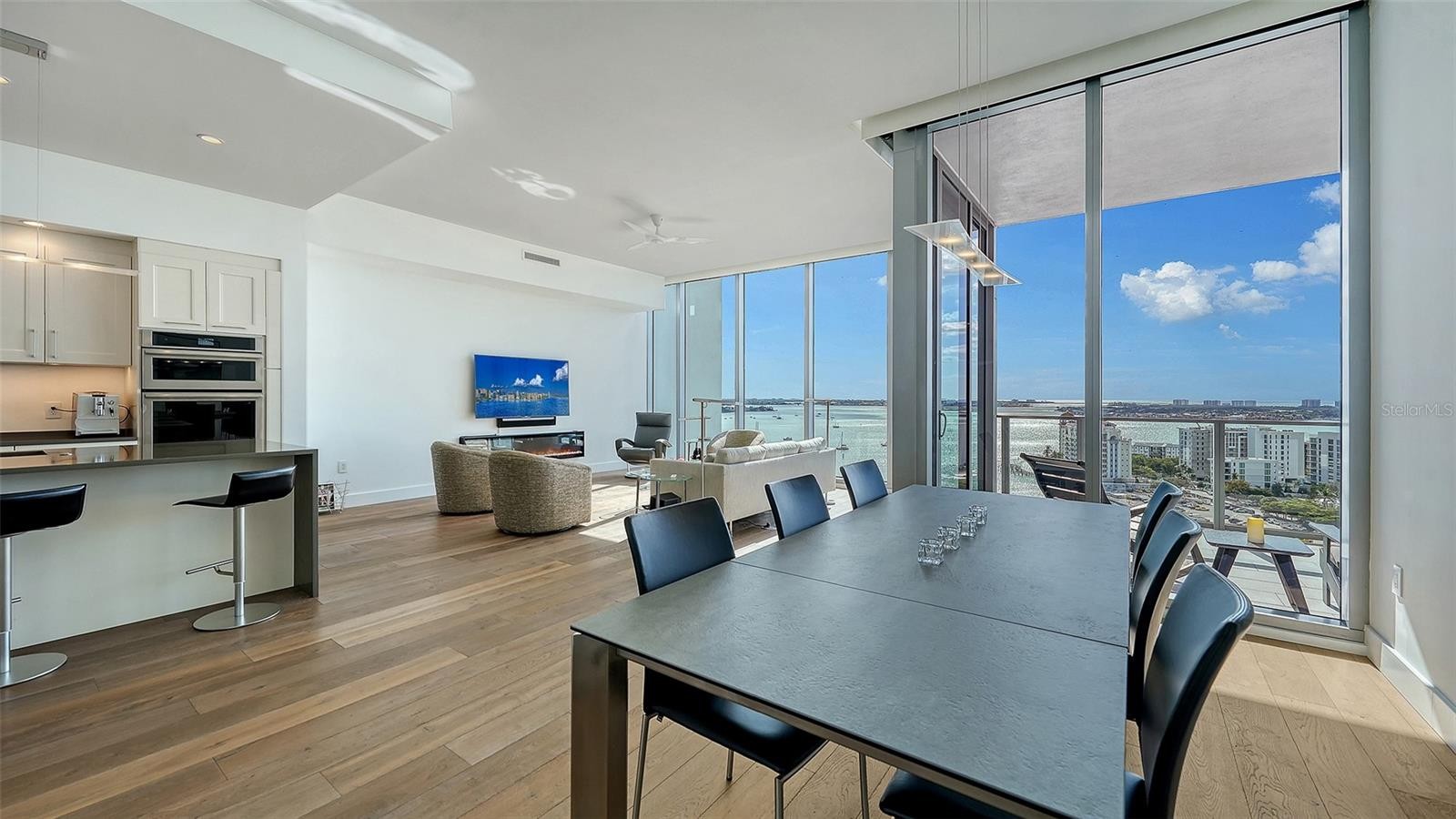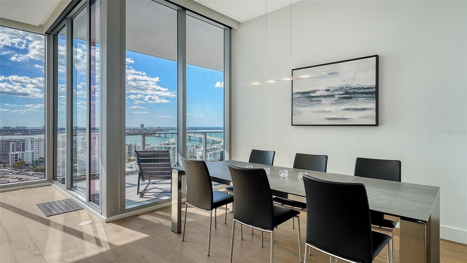 Perfectly positioned on the 17th floor at The Vue with the most captivating unobstructed water views and spectacular sunsets in downtown Sarasota, this stunning condominium is designed for urban living and effortless enjoyment. Welcome home from a private-access elevator that opens directly into your foyer. This unit features 11 foot ceilings and is filled with natural light from a dramatic floor-to-ceiling impact glass wall and sliders flowing to a private covered balcony with southern exposure, a refined living space with 2 en-suite bedrooms, a den/office, 2.5 baths, and beautiful engineered wood floors throughout. The spacious kitchen is equipped with high end appliances, an induction cooktop, an expansive island accommodating extra sitting, quartz countertops, custom white cabinetry, lots of storage, and custom LED lighting. The well-appointed great room takes advantage of the magnificent 180 degree view of Sarasota Bay, the marina, the Ringling bridge, and Gulf of Mexico. A private balcony enclosed on 3 sides is the ideal place to enjoy the outdoor and watch the gorgeous sunsets. In addition to the beautiful city lights at night, a lovely fireplace helps create a fantastic atmosphere. The primary bedroom features 2 sets of shades, blackout and see through for daytime, a huge walk-in closet, and an elegant primary bathroom with 2 sinks, and walk-in shower. The second en-suite bedroom provides a soaking tub & shower. A separate den can be used as a third bedroom or office. Also included are 2 parking spaces located under the building, and a large climate control storage. The residents enjoy 24-hour concierge service, exclusive amenities including valet parking, sparkling lap pool & spa, an outdoor kitchen with 2 gas grills and bar, fitness center, a gorgeous club room, and a dog park with grooming station. Surrounded by restaurants, shops, theaters, the Ritz Carlton, the Westin Hotel, and the bayfront, makes The Vue the finest place to live downtown Sarasota.