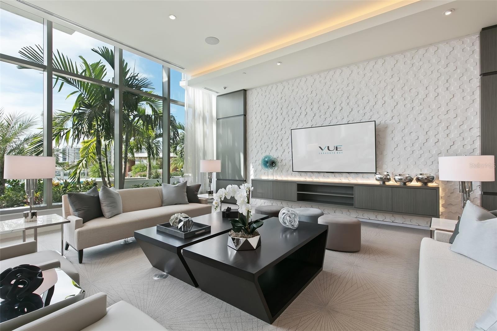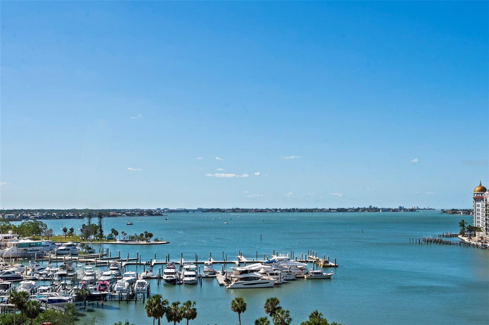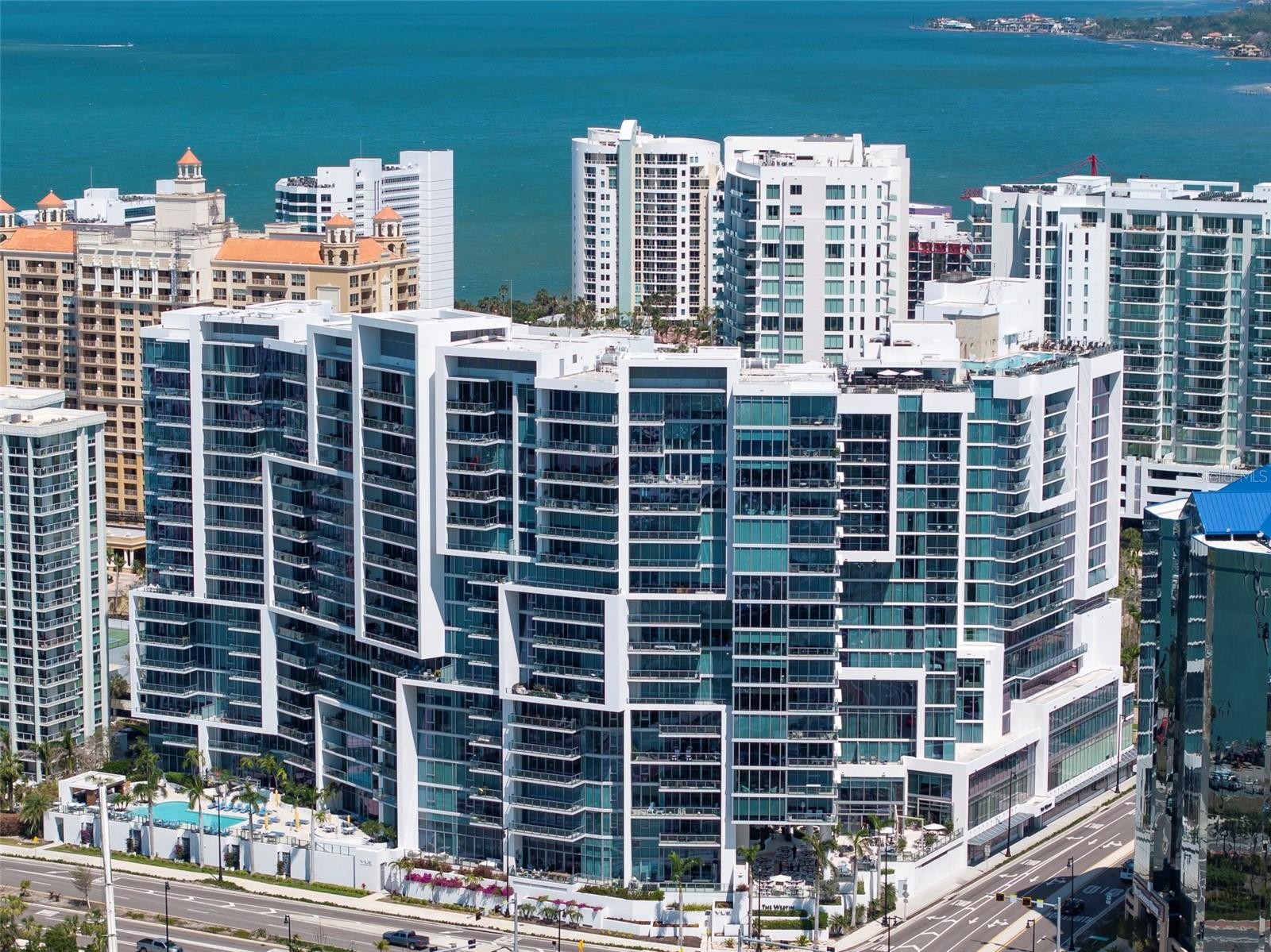 Perfectly positioned to embrace both sunrise and sunset over Sarasota Bay, Golden Gate Point, and the Keys, this exquisite two-bedroom plus den residence offers one of the most breathtaking views in all of Downtown Sarasota and a lifestyle that is second to none. From the moment you step into your private entry foyer, you’re welcomed into a space defined by elevated taste—where custom finishes and sophisticated upgrades create a truly distinctive home. Towering 10-foot floor-to-ceiling windows invite sweeping panoramic views and bathe the open-concept living areas in natural light. From your private terrace you will enjoy a front-row seat to the dynamic beauty of the Bay and marina—where the sights shift with the tides, and your own boat could rest within view. Designed for both culinary inspiration and effortless entertaining, the chef’s kitchen features premium appliances including an induction cooktop, sleek Nolte cabinetry, and a striking Quartz waterfall island. The primary suite has a spectacular view and is your private sanctuary, complete with automated window treatments, custom-designed closets, and a spa-style bathroom that exudes serenity. The guest suite offers equal comfort and privacy with a spacious en-suite bath and walk-in closet, while the convenient den/office and well-appointed laundry room add thoughtful functionality. Beautiful Calcutta Luxor marble in all rooms other than the primary bath with Nuetra white porcelain tile and the guest room with high end carpet. Additional features include two parking spaces and a climate-controlled storage unit. Designer furnishings available under a separate agreement. Life at the VUE Sarasota means luxury at every turn—with 24-hour concierge and valet services, a residents’ club room and conference space, a state-of-the-art fitness center, a resort-style heated pool and spa, an expansive dog park, and an elegant outdoor lounge area. Ideally located just minutes from the Ritz-Carlton, the Westin, Sarasota’s best dining, shopping, the opera house, and world-class cultural venues, this is truly downtown living at its finest. Come experience why this remarkable address is called the VUE.