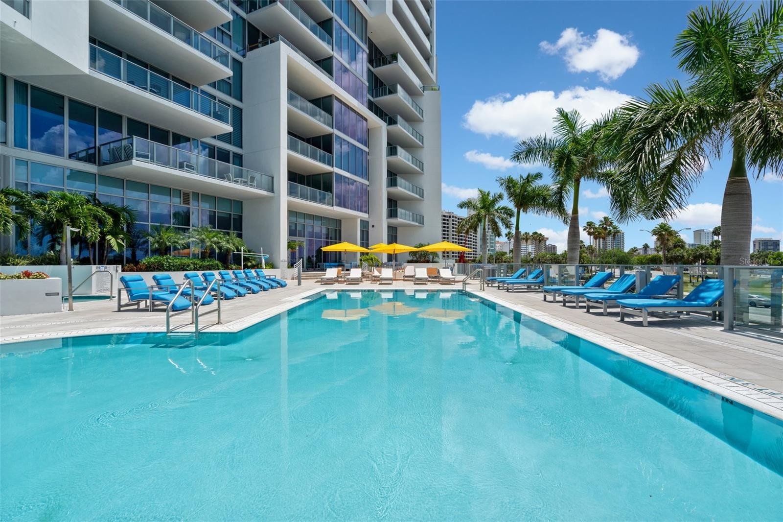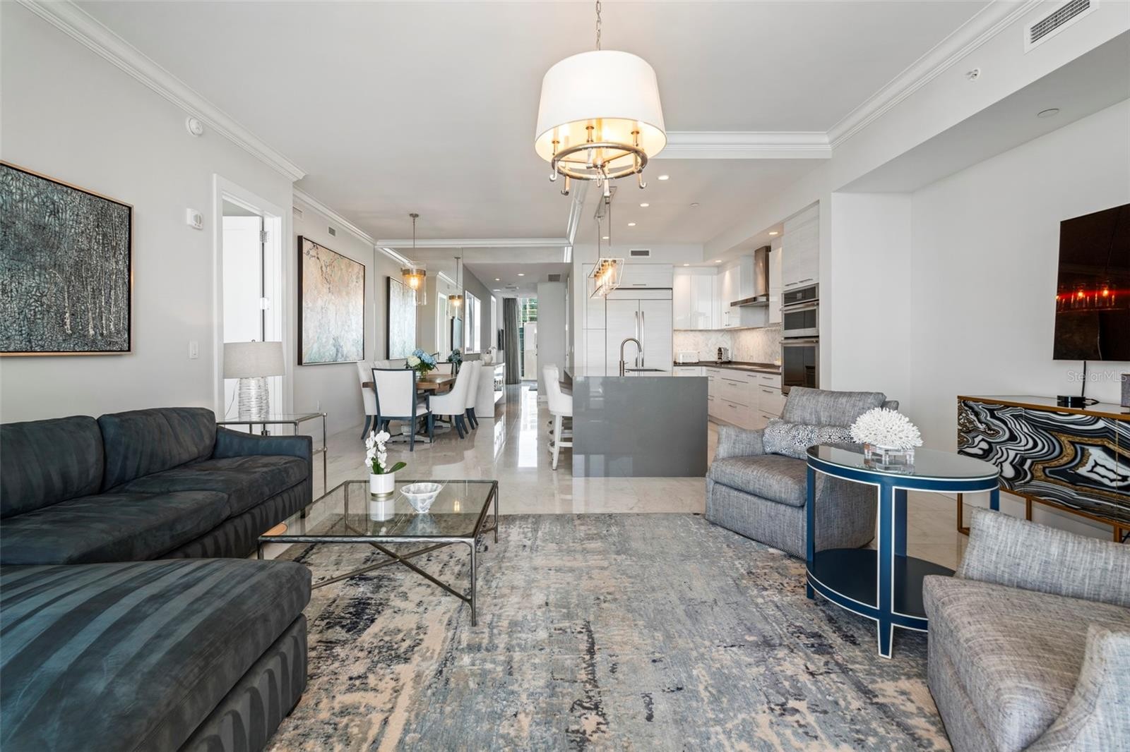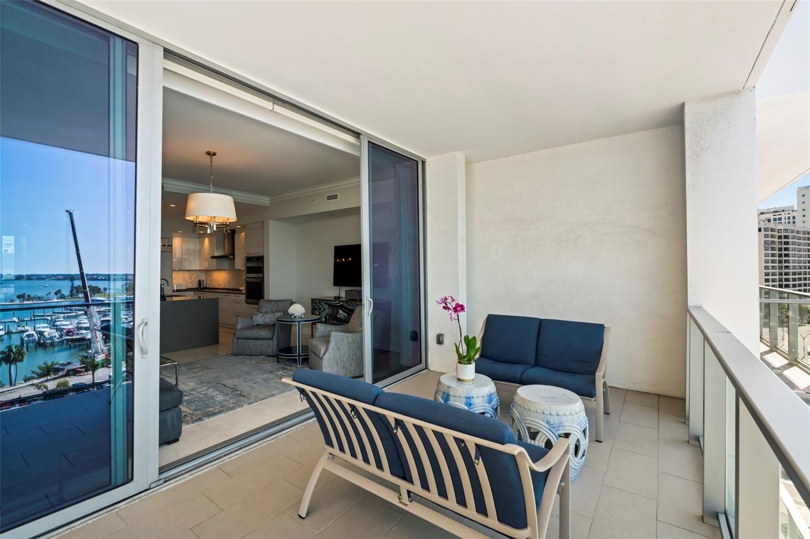 Perfectly positioned to embrace both sunrise and sunset over Sarasota Bay, Golden Gate Point, and the Keys, this exquisite two-bedroom plus den residence offers one of the most breathtaking views in all of Downtown Sarasota and a lifestyle that is second to none. From the moment you step into your private entry foyer, you’re welcomed into a space defined by elevated taste—where custom finishes and sophisticated upgrades create a truly distinctive home. Towering 10-foot floor-to-ceiling windows invite sweeping panoramic views and bathe the open-concept living areas in natural light. From your private terrace you will enjoy a front-row seat to the dynamic beauty of the Bay and marina—where the sights shift with the tides, and your own boat could rest within view. Designed for both culinary inspiration and effortless entertaining, the chef’s kitchen features premium appliances including an induction cooktop, sleek Nolte cabinetry, and a striking Quartz waterfall island. The primary suite has a spectacular view and is your private sanctuary, complete with automated window treatments, custom-designed closets, and a spa-style bathroom that exudes serenity. The guest suite offers equal comfort and privacy with a spacious en-suite bath and walk-in closet, while the convenient den/office and well-appointed laundry room add thoughtful functionality. Beautiful Calcutta Luxor marble in all rooms other than the primary bath with Nuetra white porcelain tile and the guest room with high end carpet. Additional features include two parking spaces and a climate-controlled storage unit. Designer furnishings available under a separate agreement. Life at the VUE Sarasota means luxury at every turn—with 24-hour concierge and valet services, a residents’ club room and conference space, a state-of-the-art fitness center, a resort-style heated pool and spa, an expansive dog park, and an elegant outdoor lounge area. Ideally located just minutes from the Ritz-Carlton, the Westin, Sarasota’s best dining, shopping, the opera house, and world-class cultural venues, this is truly downtown living at its finest. Come experience why this remarkable address is called the VUE.