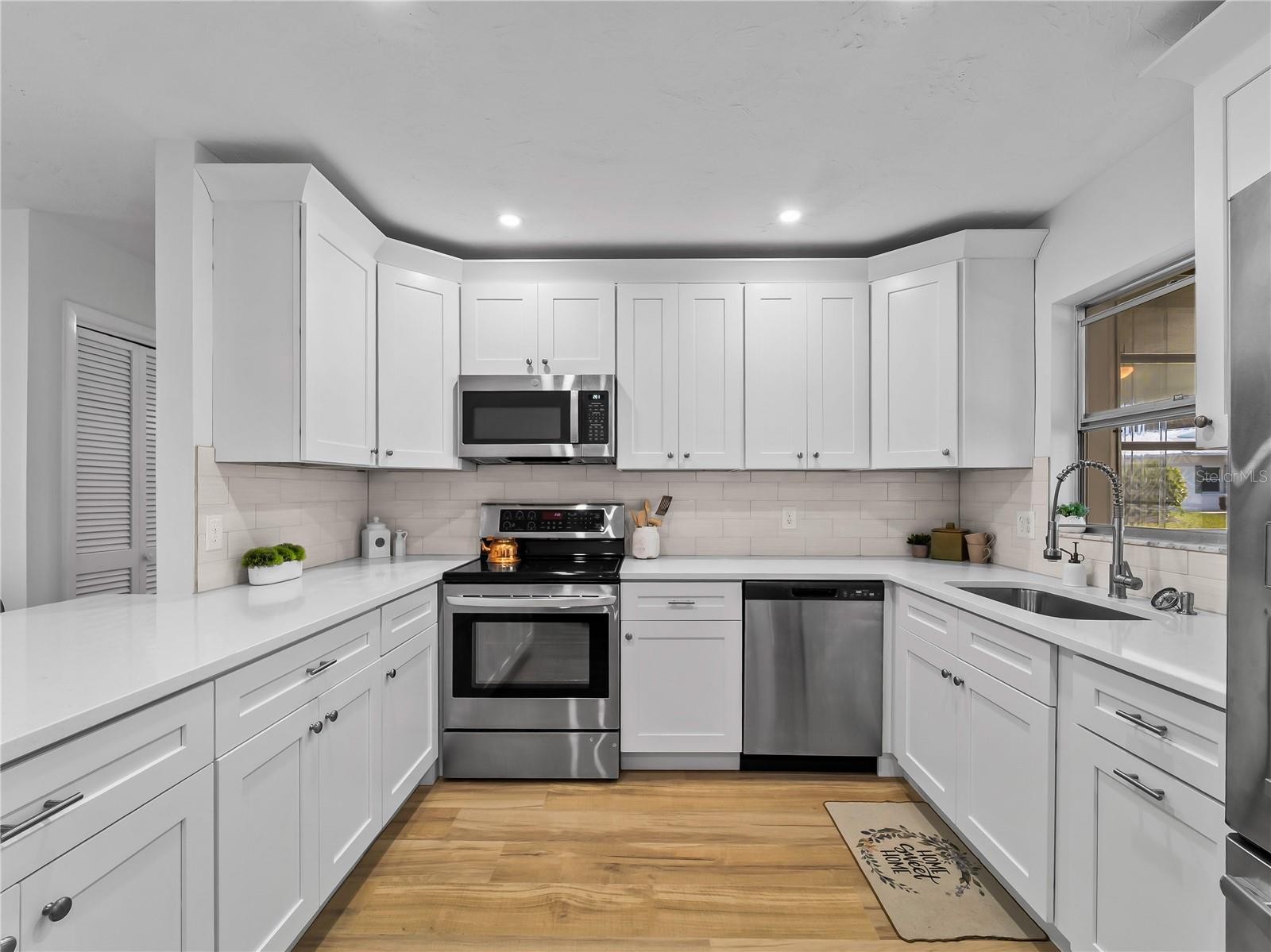 Beautiful, Completely remolded as of January 23rd and new to the market in its current condition. Corner villa unit on the Island of Venice. All Luxury vinyl floors throughout, nice open plan with large kitchen that features all new wood cabinets with soft close draws and doors. Stainless steel appliances. Breakfast bar and Quartz countertops. New Plumbing fixtures and sink. All cooper has been replaced. New Tile shower. This unit has plenty of storage with large walk in closet plus a large walk in hall closet. Freshly painted interior. Easy to see. Small friendly complex featuring a community pool in walking distance along with a clubhouse and shuffleboard.