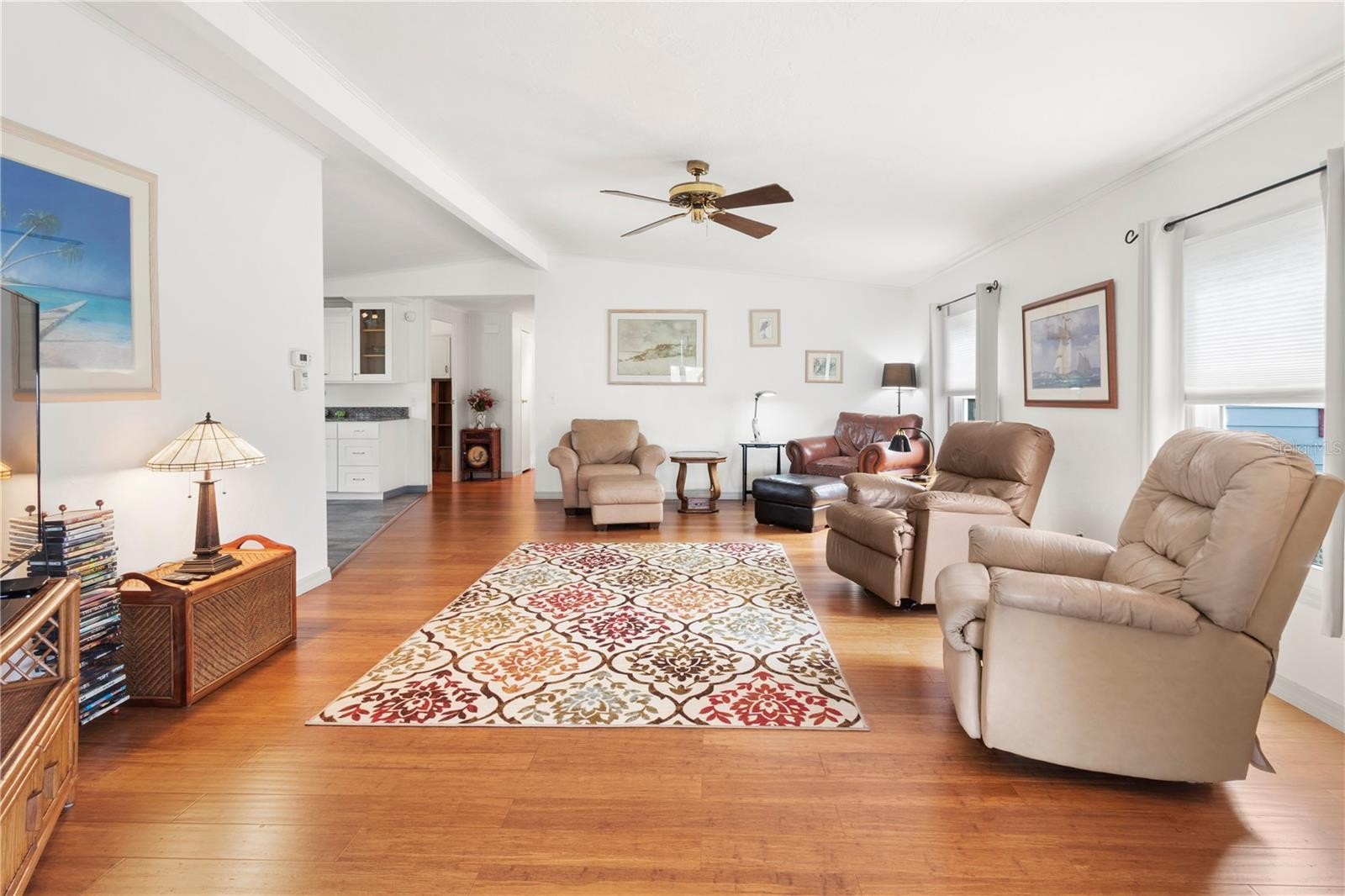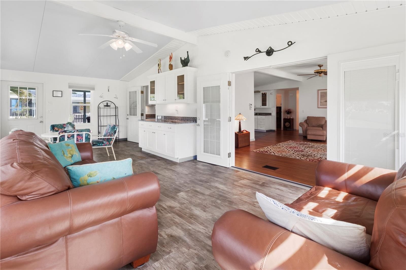 EXCEPTIONAL, LAND OWNED – Turn Key Furnished, beautifully remodeled, 2bd/2ba home located in the 55+ community of Ridgewood Meadows. This home is on a very large landscaped lot, on a quiet cul-de-sac, a widened driveway and a newly built garage in 2014. You will enjoy your morning coffee on the huge front porch, featuring Trex decking & deluxe railing that allows for multiple chairs and lounges for your family and friends. Under the home there are newly added tie down anchors in (2014), a ground vapor barrier (2017) and a new belly band vapor barrier was installed in 2023. A water heater was installed in 2015 with a new roof and AC unit in 2019. This home is a dream inside with a new kitchen featuring stainless appliances, new sink, garbage disposal, solid surface counter tops and plenty of kitchen cabinets. Gorgeous flooring throughout the home features bamboo, luxury vinyl and the bedrooms have new carpeting. The owners have remodeled the lanai to create year-round living space with new widows, AC/heat, drywall walls, luxury vinyl flooring, custom blinds and measures the full width of the home 26’x12’! Both bathrooms have been remodeled and feature new showers installed by Bath Fitter. This home also features a separate room for an office or craft room. This is a very rare home with too many features to list. Come and enjoy the Ridgewood community with gated 24-hour security, pool, clubhouse, tennis courts, pickleball courts, outdoor gym, great fishing and lots of activities. Golf cart and small pet friendly. Close to all shopping, Ellenton Outlet mall, restaurants, I-75 and the gulf beaches.