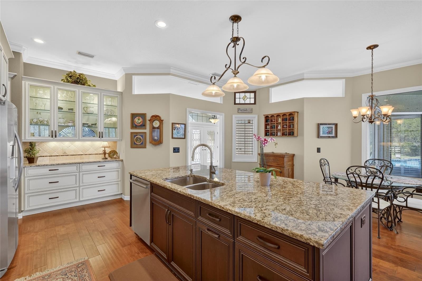 Tucked away on a picturesque lot in gated River Wilderness, this beautifully maintained home offers serene lake and wooded views with the kind of serenity that’s hard to find. Soaring 10' ceilings throughout, paired with neutral décor and updated engineered hardwood flooring, create a bright, open, and timeless feel, while the thoughtful split floor plan places guest bedrooms privately apart from the primary suite—along with a den/office and big laundry room. Important systems/structure dates include: A/C 2022, Roof 2025, Water Heater 2018. The expansive great room and standout kitchen are designed to take full advantage of the setting, featuring a large center island, glass-front cabinetry, abundant storage, and effortless flow for everyday living or entertaining. Sliding doors open to a show-stopping lanai with pool and panoramic screen, delivering sweeping, unobstructed views of the lake and surrounding woods—perfect for morning coffee or sunset evenings. Located in River Wilderness, residents enjoy a gated, sidewalk-lined community known for its mature landscaping and peaceful atmosphere. Optional club membership provides access to championship golf, tennis, pickleball, fitness facilities, dining, and a full calendar of social events. Ideally positioned in Parrish, with convenient access to Lakewood Ranch, Sarasota, St. Petersburg, Tampa, and major highways, this home offers a rare blend of privacy, views, and lifestyle.