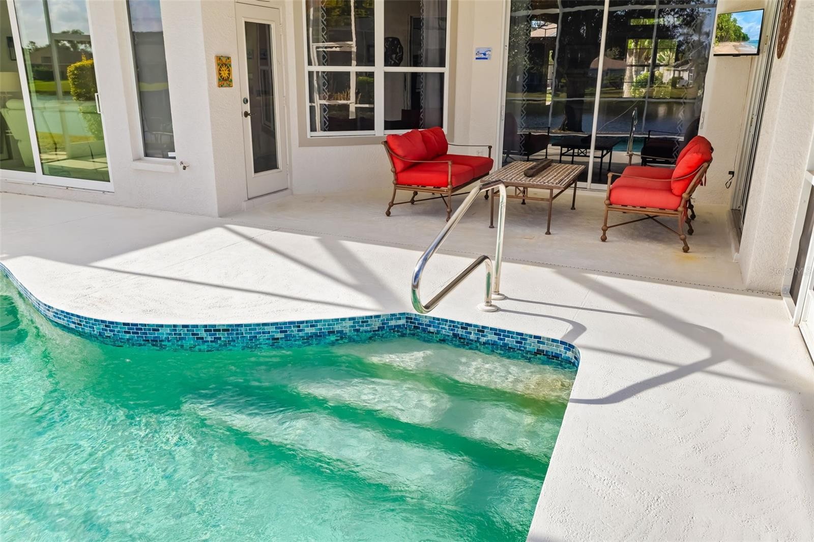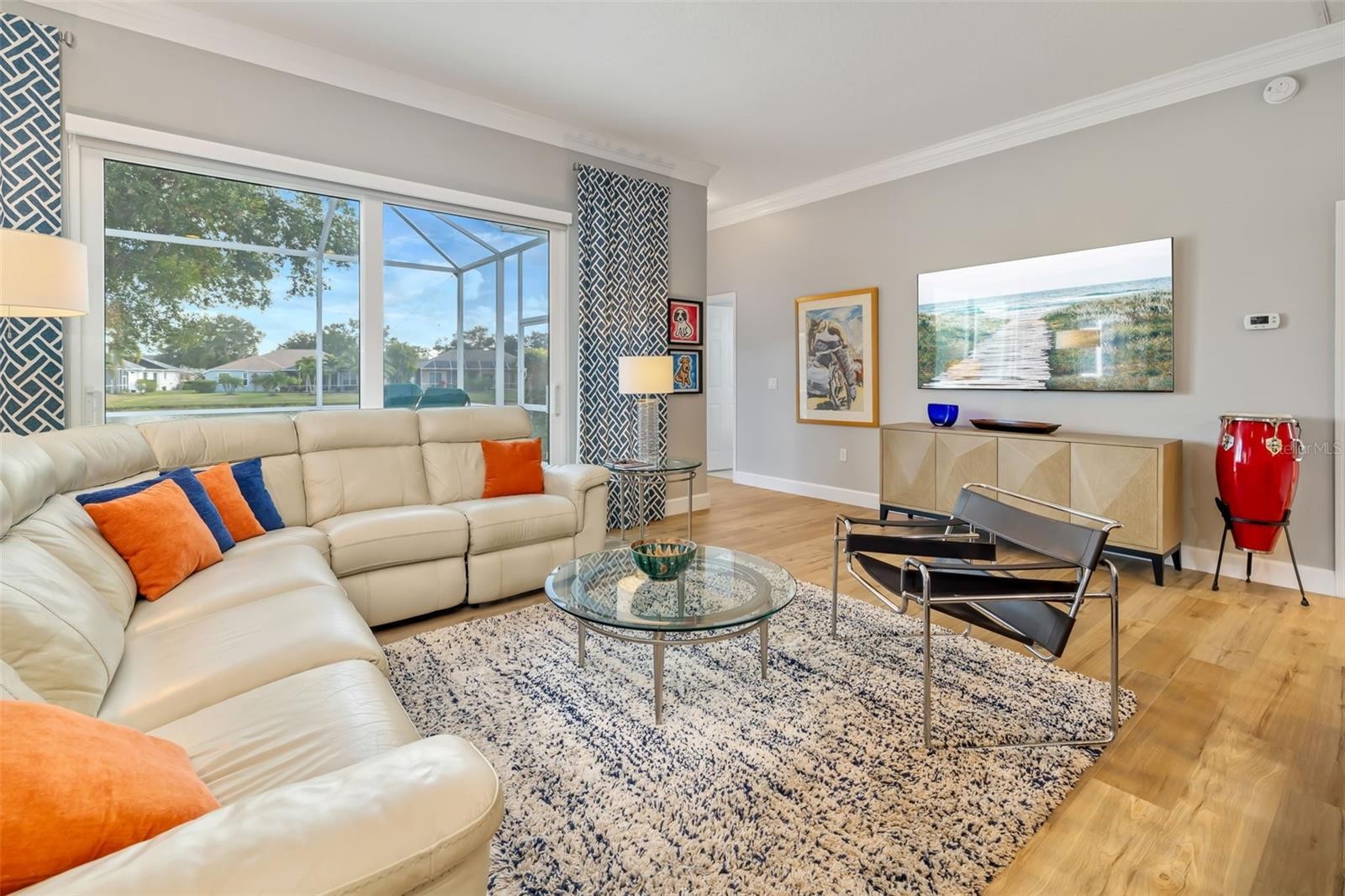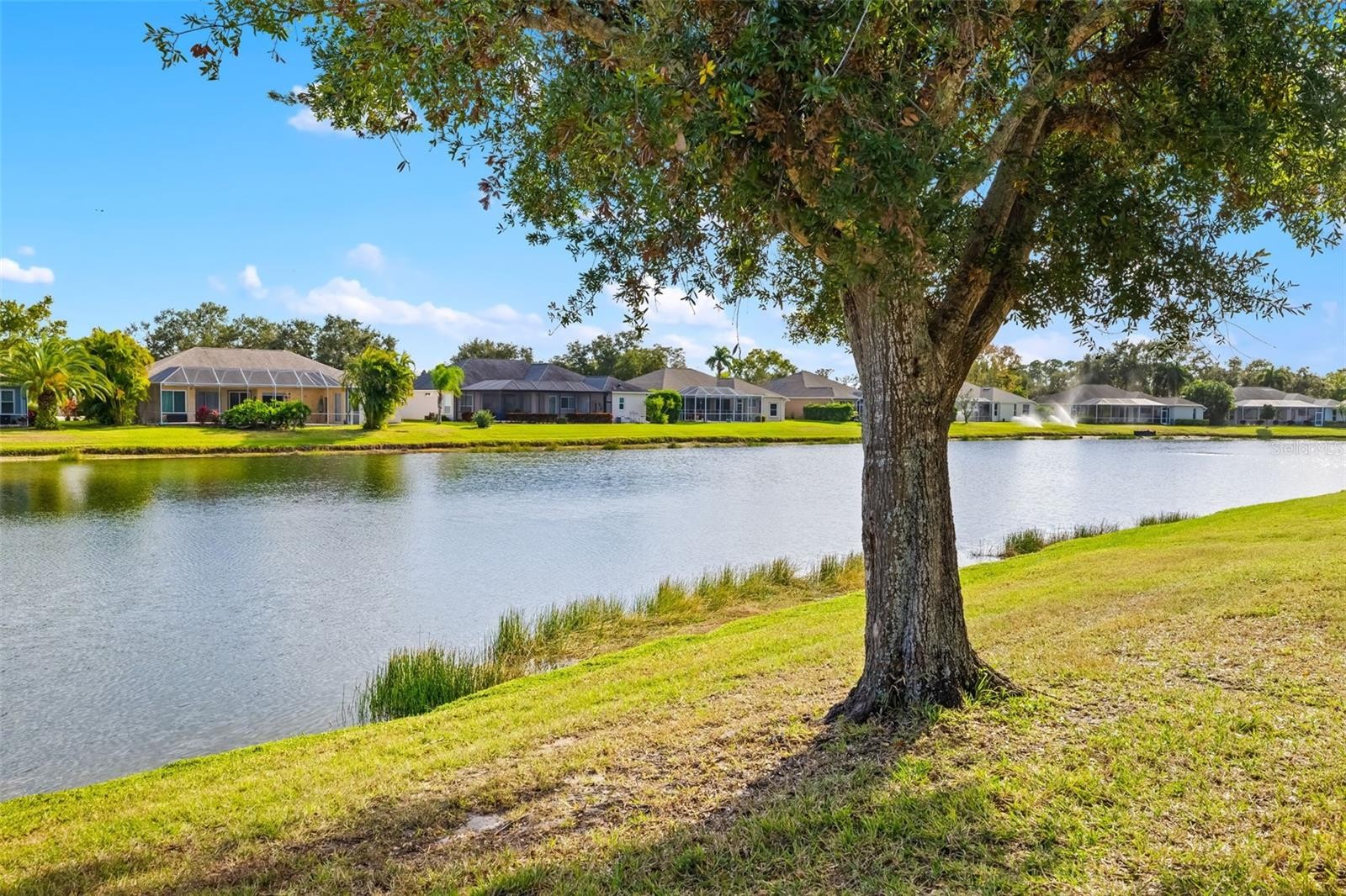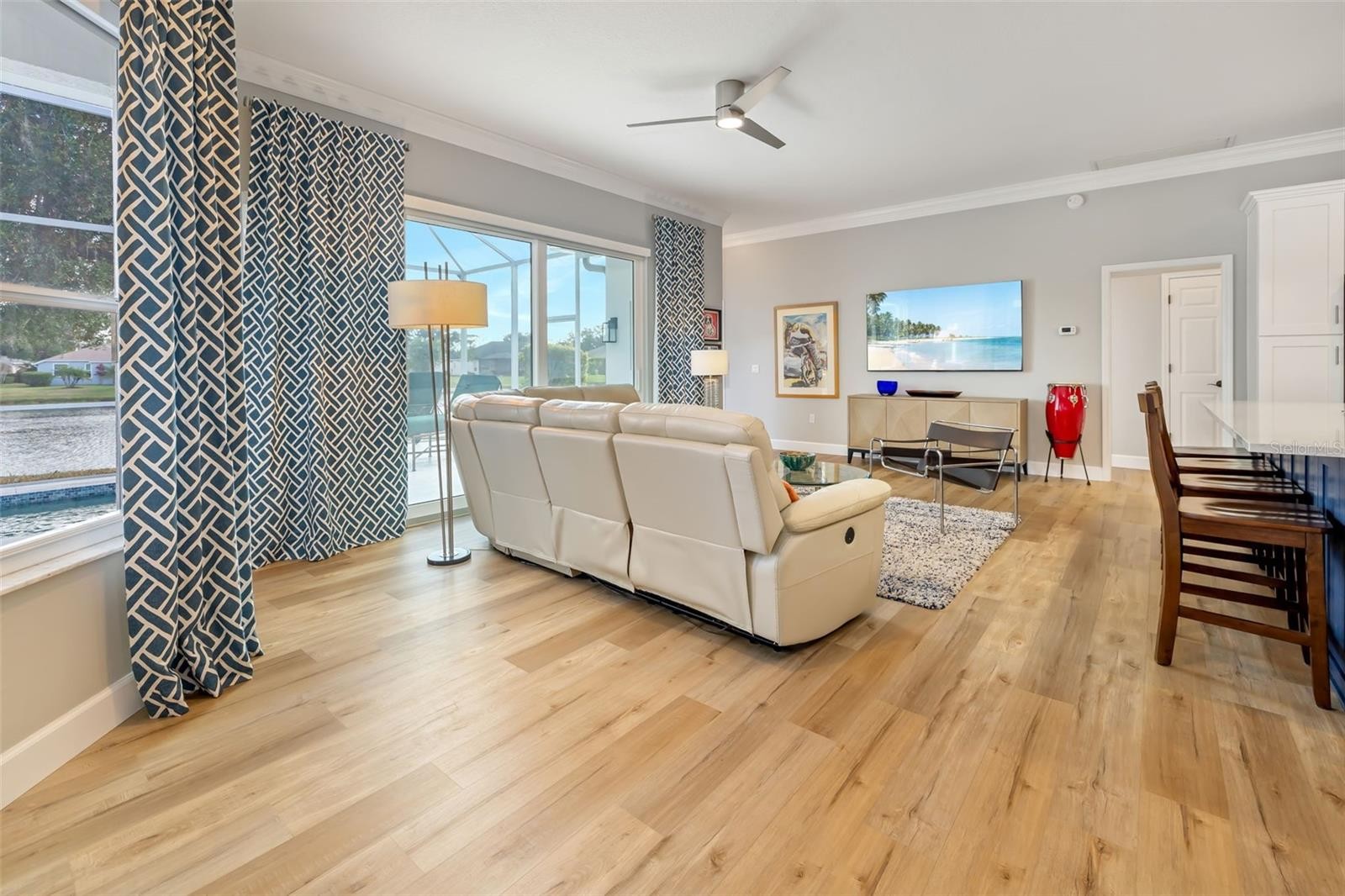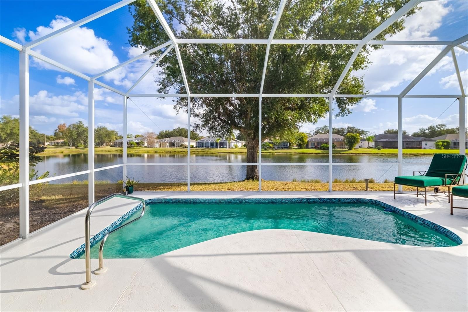 Experience sweeping lake views from nearly every room in this renovated three-bedroom, three-bath residence in centrally located Summerfield Glades. Designed for modern living, the interior was reimagined by removing walls to create a seamless living space. Center stage is a new kitchen with quartz countertops, center island, gas, soft-close, undermount lighting, built-in pantry, coffee bar and a serene view of the lake through a new sliding glass door in the family room. Other recent updates include a new roof, new HVAC, luxury vinyl plank flooring and freshly painted exterior. A new pool cage covers the lakefront pool. The home also features a front office, dining room with a dry bar, and living room. Automatic screens on the back sliders offer privacy with press of a button. Epoxy floor in garage. Most rooms enjoy sweeping views of the wide lake. Split floor plan places guest suites opposite the main bedroom. Summerfield Glades offers low HOA fees and direct trail access to Greenbrook, Adventure Park and top-rated schools. Residents enjoy walkability to parks, sports fields, dog runs, community gardens and playgrounds. Summerfield is near shopping, dining, major highways and University Town Center Mall. Furnishings are optional.