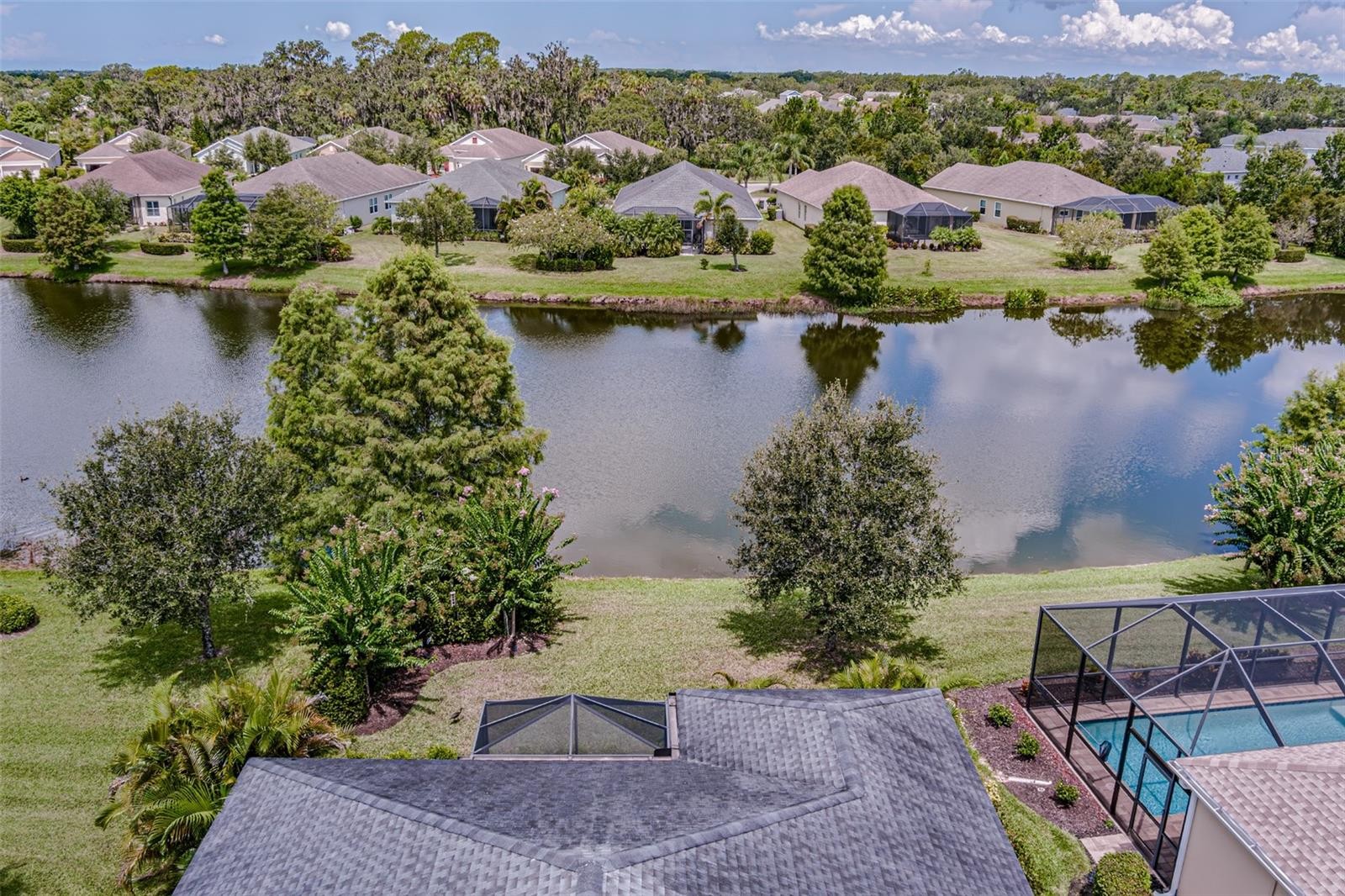 Located in the gated community of Forest Creek, this beautifully maintained 3 bedroom, 2.5 bathroom home with a dedicated den/office offers a thoughtful layout, quality upgrades, and peaceful pond views. With its coastal-inspired feel and functional design, this home stands out for buyers looking for both comfort and style. Inside, you’ll find an open and inviting floor plan with upgrades that add character throughout, including plantation shutters, tray ceilings, trim details, chandeliers, and updated light fixtures. The den or office provides great flexibility for working from home, a hobby space, or an additional sitting area. The kitchen offers plenty of cabinet and counter space, along with one of the home’s most practical features, a large walk-in pantry that leads into an oversized walk-through laundry room. This setup provides excellent storage and convenience, something buyers will definitely appreciate. The extended lanai is a standout feature of the home, offering a spacious outdoor living area with room to relax, dine, or entertain while enjoying the peaceful pond view. It creates a private and tranquil setting that truly adds to the overall appeal of the property and gives you that indoor-outdoor Florida lifestyle buyers love. Forest Creek offers a great lineup of amenities including a pool and spa, fitness center, playground, dog park, scenic walking trails, and a community dock overlooking the 18-acre lake where residents can fish, kayak, and canoe. Beautifully landscaped and thoughtfully designed, this gated community offers a peaceful setting with plenty to enjoy. If you’ve been looking for a home with a flexible floor plan, quality finishes, and a really special outdoor space, this one is worth a look.