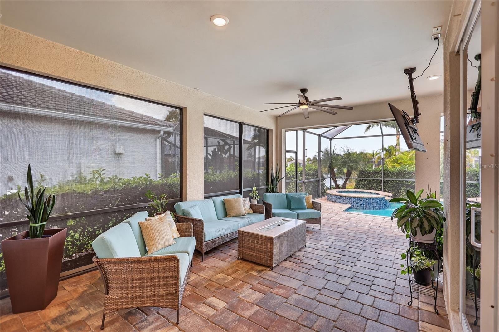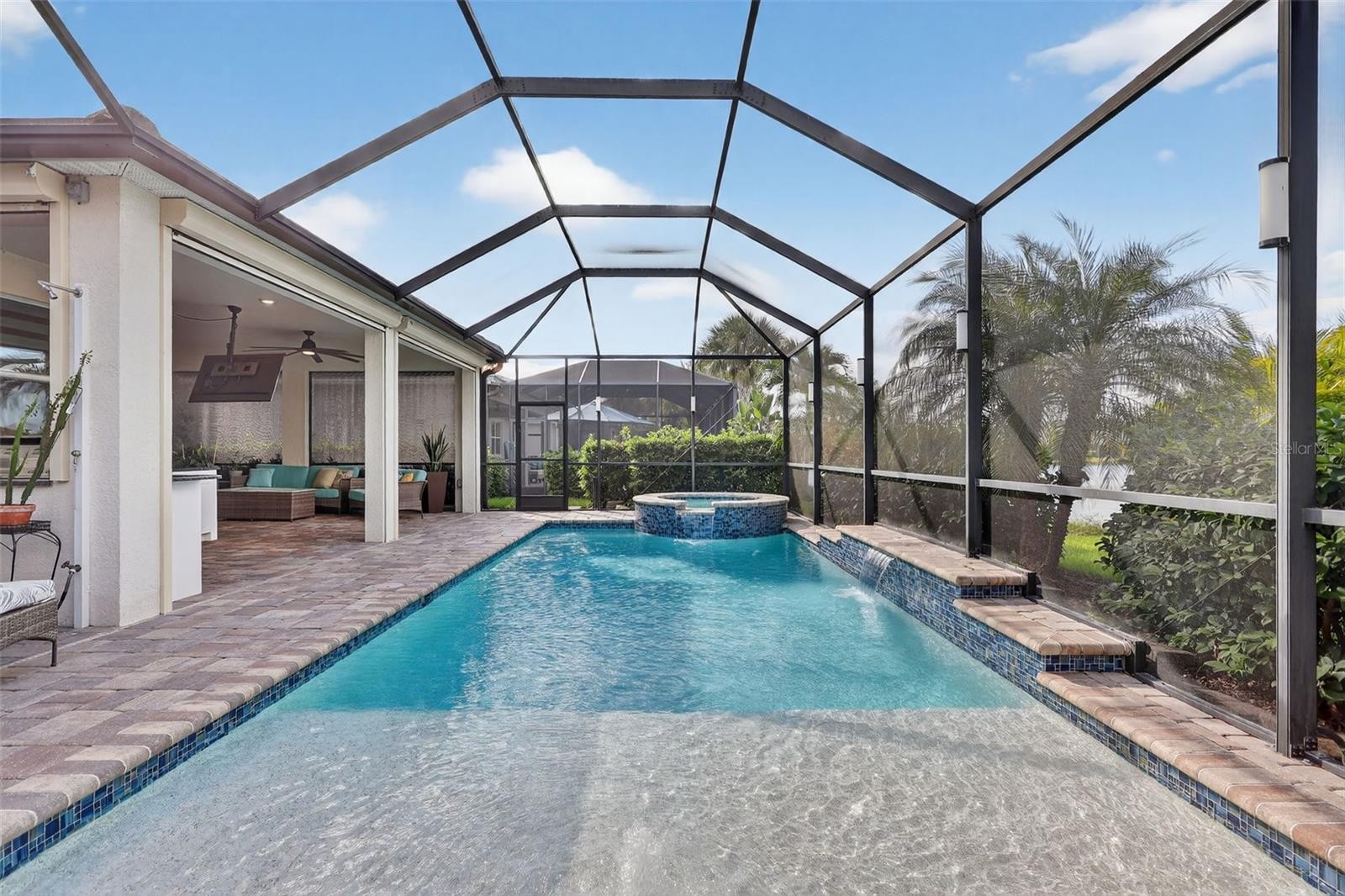 Introducing one special home in the sought after Mallory Park. Known for its amenities, central location, Position with top schools and well-built homes within a true meaning of community. A fantastic three-bedroom, two-bathroom single story home with custom blinds and plantation shutters. Superb curb appeal with the stone trim front and tile driveway. The home has wood like plank tile through the main living areas, open floor plan with a glorious kitchen with gas stove, tile backsplash, granite counter tops and a large island. Kinetico whole house water filtration system, water softener and reverse osmosis along with a full house generator. The office/flex room has double doored entry, tile plank flooring and built in cabinets and counter offering storage and display. The two wonderful bedrooms are carpeted and full bathroom with tile from tub to ceiling. The master bedroom is spacious, has a tray ceiling, double sink bathroom and long counter, walk-in shower tile floor to ceiling and a walk-in closet. Entering the lanai from the dining room in a corner slider which pockets on one side. The utility/laundry room has additional cabinets and sink with counter The paver lanai has a solid covered area with built-in outdoor kitchen with long counters, grill, sink and refrigerator. The pool and spa are heated and have a salt cell. Electronic hurricane lanai screens and additional electronic shades. Lot has an easement to the rear of the home offering additional distance from the neighbors. Pond view with great directional on sunlight, Mallory Park has amazing amenities like pool, exercise, pickle ball, basketball, BBQ area and a fire pit to gather with friends and family. Close to Sarasota Downtown and St. Pete to the north. Anna Maria Island is the direct beach, shopping, restaurants, parks, walking trails, biking trails, Costco center and UTC, Tampa an hour north and some of the best beaches on the Gulf Coast of Florida. This is a must-see property, so be the first.