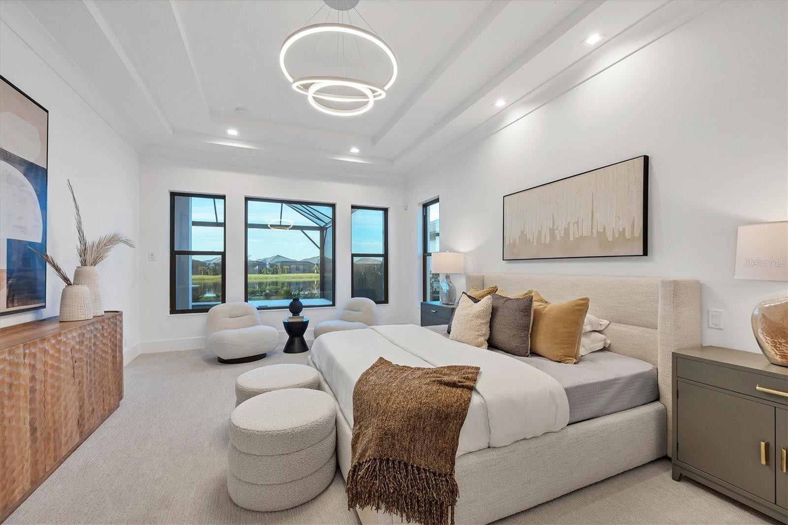 Welcome to this stunning, newly constructed 3,219-square-foot Rutenberg Talise model home, offering breathtaking water views in the Wild Blue at Waterside community. This luxurious residence features three spacious bedrooms, three and a half beautifully appointed baths, a den and a versatile bonus room. At the heart of the home is a breathtaking chef’s kitchen, complete with Thermador appliances, sleek quartz countertops and beautiful wood cabinets. This space opens seamlessly to the great room and dining areas, creating an ideal setting for entertaining and everyday living in the home’s open layout. Architectural details, including crown molding and tray ceilings, combined with beautiful wood floors enhance the warmth and elegance throughout the home. The professionally designed office boasts beautiful wood floors and is enclosed by elegant glass-insert sliding doors, offering both privacy and style. Whether you work from home or need a quiet space to focus, this office combines functionality with sophisticated design. The oversized bonus room is a flexible space that can be used as a second entertainment room, game room or additional living area. With 11-foot ceilings and plenty of natural light, it offers a spacious, airy feel. The bonus room is conveniently near a powder room, which also doubles as a pool bath, providing easy access from the outdoor living area. For the ultimate indoor-outdoor living experience, corner sliders open to the lanai, inviting you to step outside and enjoy Florida’s year-round sunshine in your private outdoor oasis. The backyard features a pool, relaxing spa and a spacious lanai including an outdoor kitchen with a grill, making this outdoor area a perfect place for relaxing or hosting guests. The luxurious owner’s suite offers a peaceful retreat with dual walk-in closets and a spa-like bath, complete with a soaking tub, walk-in shower and dual vanities. Two additional guest bedrooms, each with their own en-suite baths, provide comfort and privacy for family and visitors. A three-car garage offers ample storage and convenience. In the prestigious Lakewood Ranch area, Waterside is the pinnacle of luxury lakefront living. This planned community surrounds you with natural beauty, featuring sparkling lakes, lush landscapes and thoughtfully designed neighborhoods. With landscaping maintenance included, you’ll have more time to enjoy the resort-style amenities, including parks, walking trails, a village spa, tennis and pickleball courts, dog parks, playgrounds, golf and clubhouses. The vibrant town center offers boutique shopping, dining and entertainment just minutes away. Don’t miss the opportunity to make this extraordinary home yours and experience the best of luxury living at Wild Blue at Waterside.