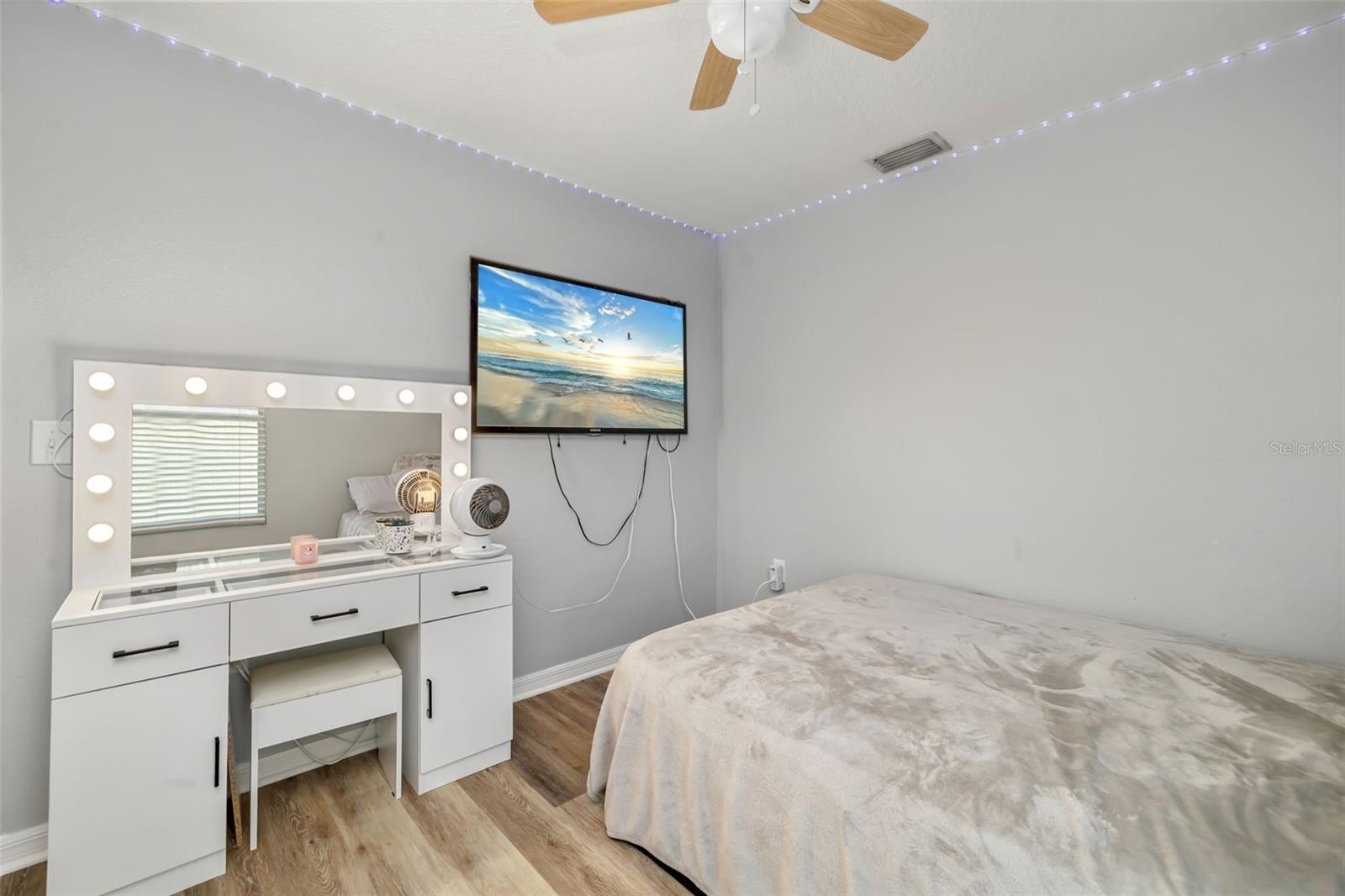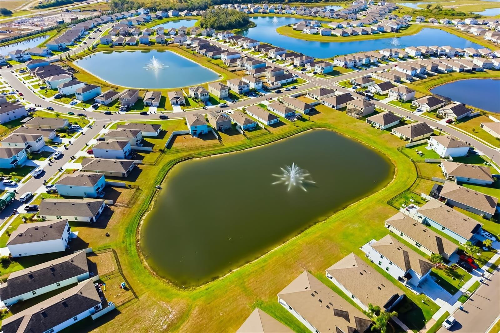 Come see this MOVE-IN READY UPDATED 4 bedrooms, 2 baths, little over 1,400 sqft with a relaxing BIG BACKYARD OVERLOOKING THE POND! NO REAR NEIGHBORS! This lovely open floor plan home has extended tile throughout the living and wet areas. NO CARPET! Luxury Vinyl flooring in ALL Bedrooms. As you enter the home there is an extended foyer, on the right 2 bedrooms and a shared bathroom. On the left is another bedroom. This home can be a 5 BEDROOM HOME!! Sellers converted HALF of the garage into a 5th BEDROOM, installed a mini-split AC unit and still have storage in the front half! Garage still works and opens. New Owners can either keep as a bedroom, make an office, play room, a game area with pool and bar area, OR garage can be converted back with AC! The potential is endless! The laundry room is beautifully updated with a decorative backsplash, two wall-mounted shelves, a folding shelf, and wall paneling. The washer and dryer STAY with the home! Large spacious kitchen, upgraded Espresso color cabinetry, granite kitchen countertops, sellers installed an upgraded kitchen backsplash, and added under and above cabinet kitchen lighting, providing consistent ambient lighting. Stainless Steel Appliances. Eat-In kitchen area. The bedrooms are split floor plan. The 3/4 bedrooms are up front and the master is in the back! The spacious master bedroom has a WALK- IN CUSTOM BUILT CLOSET. En suite bathroom with a walk in shower. As you enter the beautiful backyard with a extended 20x30 paver patio, a 10x12 pergola with adjustable/opening roof slats to enjoy the amazing sunset views overlooking the pond views and watching your favorite football team on a installed TV setup with a protected TV case that STAYS with the home. NO MORE HANGING CHRISTMAS LIGHTS!! Sellers installed PERMANENT EXTERIOR LIGHTING around the WHOLE outside of the home. This home boasts front irrigation system, hurricane shutters and plenty of natural light in the home!! NO FLOOD ZONE!! VERY LOW CDD!! CDD IS IN THE TAXES! VERY LOW HOA! The location is conveniently located near stores, ZONED FOR A-RATED SCHOOLS, great restaurants and more to come. Location is the key! Near Fort Hamer Bridge so a quick commute to Lakewood Ranch, easy access to I-75/275, 30 mins to St Pete, 15 mins to Riverview, Wimauma, Sun City, or Ruskin, 45 mins to Tampa. Close to surrounding beaches, St Pete, Anna Maria Island, and Siesta Key! Don't miss out on this fantastic opportunity to own this beautiful home. Schedule your showing today!!! **ELIGIBLE FOR $0 DOWN PAYMENT USDA FINANCING!** MOTIVATED SELLER!!