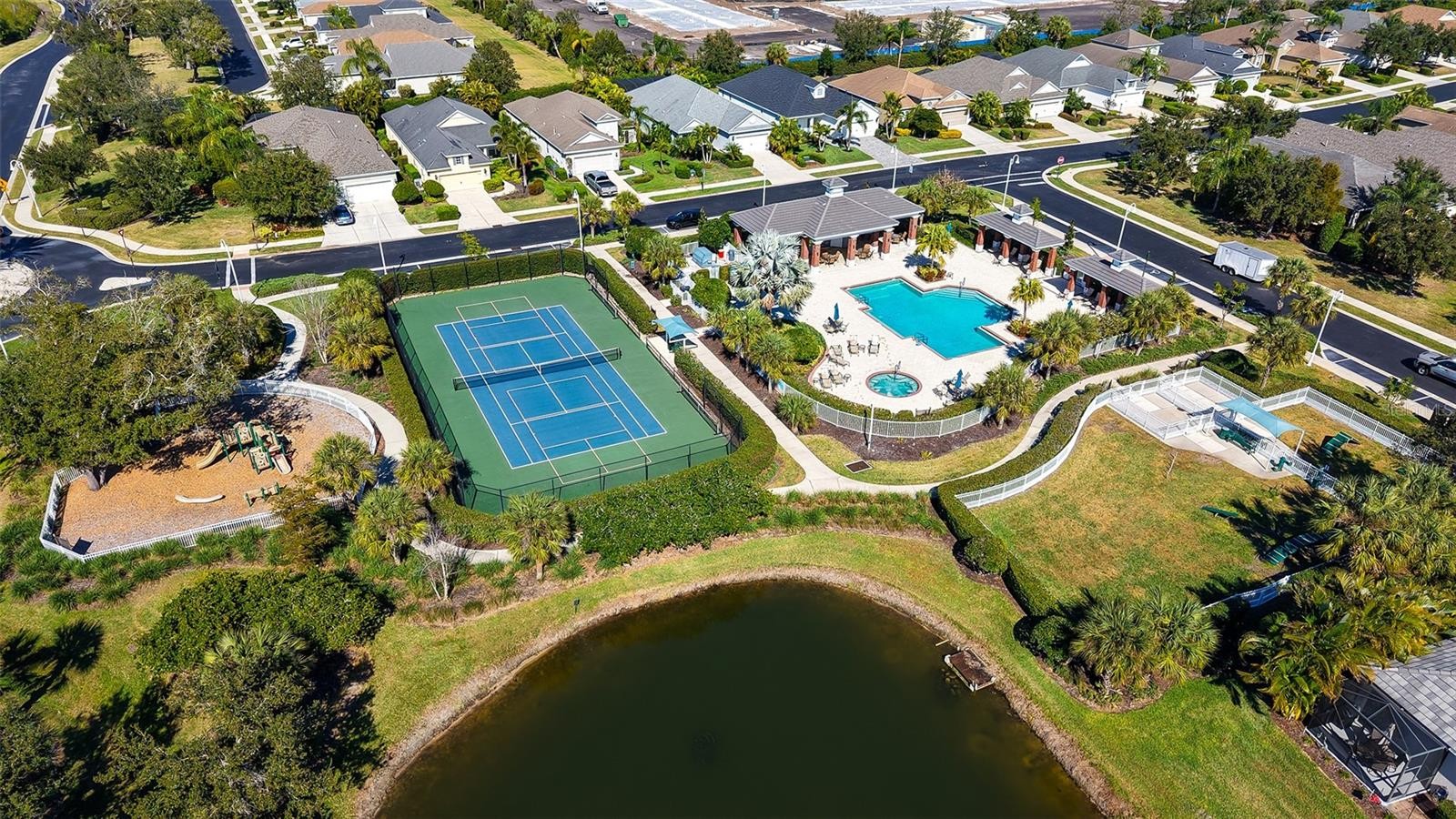 The beauty of this spacious home strikes you the moment you enter! The custom color scheme is accentuated with expansive high ceilings, crown molding, and beautiful wood flooring throughout the living area. Enjoy the large den with double doors just off the entry, perfect for an office space or private retreat. The foyer seamlessly blends into the unique and desirable gallery; an area perfect for showcasing works of art, library shelves, or other prized decor. This sought after Starlight model built by Neal Communities embodies the Florida lifestyle with its open living area combined with the huge, deluxe kitchen complete with a substantial kitchen island creating a focal point for sharing and entertaining. The kitchen boasts an abundance of cabinetry and beautiful quartz countertops, custom tile backsplash, and seating at the kitchen island, as well as in the gorgeously appointed adjoining dining room complete with custom wall paper, matching window treatments, and a stunning designer chandelier. The primary suite is a place of serenity, with newer plush carpeting, calming colors, and a beautiful view of the pond and surrounding trees. In addition, there are his and hers closets and a sunny ensuite bath with dual sinks and walk-in shower. This home has a split bedroom plan, with 2 bedrooms and a full bath just off of the gallery, as well as a roomy interior laundry featuring upgraded cabinetry and closet storage. The private half bath off the gallery hallway is outfitted with stunning custom wallpaper and filled with natural sunlight from the accent window. Just off the living area, through sliding glass doors, is an extended rear patio with natural gas already plumbed for a grill or summer kitchen. Enjoy relaxing outside while soaking up the beauty of the forest trees and mature hedge surrounding the tranquil pond where birds often visit. Also relax knowing the A/C system was replaced in 2025, and there are builder provided hurricane shutters in the garage. This lovely home is located in Eagle Trace, a gem of a community on the northern end of Lakewood Ranch. The community is gated and prides itself on its small, friendly, neighborhood feel. Plus, the neighborhood amenities are well-maintained, fun, and inviting! Residents and guests can relax and grill by the refreshing community pool, enjoy a game of pickleball at the tennis courts, or take their furry friend for a run in the dog park. In addition, the community provides lawn maintenance services to all owners. No need to bring the mower! Conveniently located minutes from shopping, dining, I-75, Lakewood Ranch, and the UTC Mall area, this home and community embody the Florida lifestyle!
