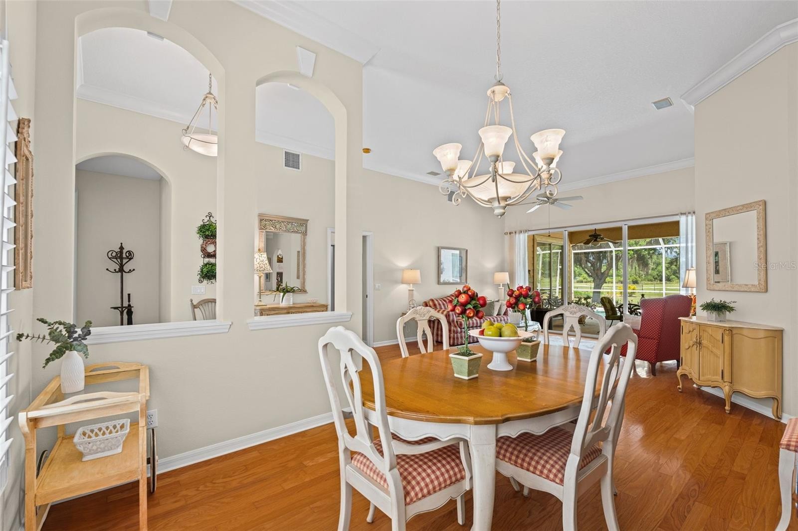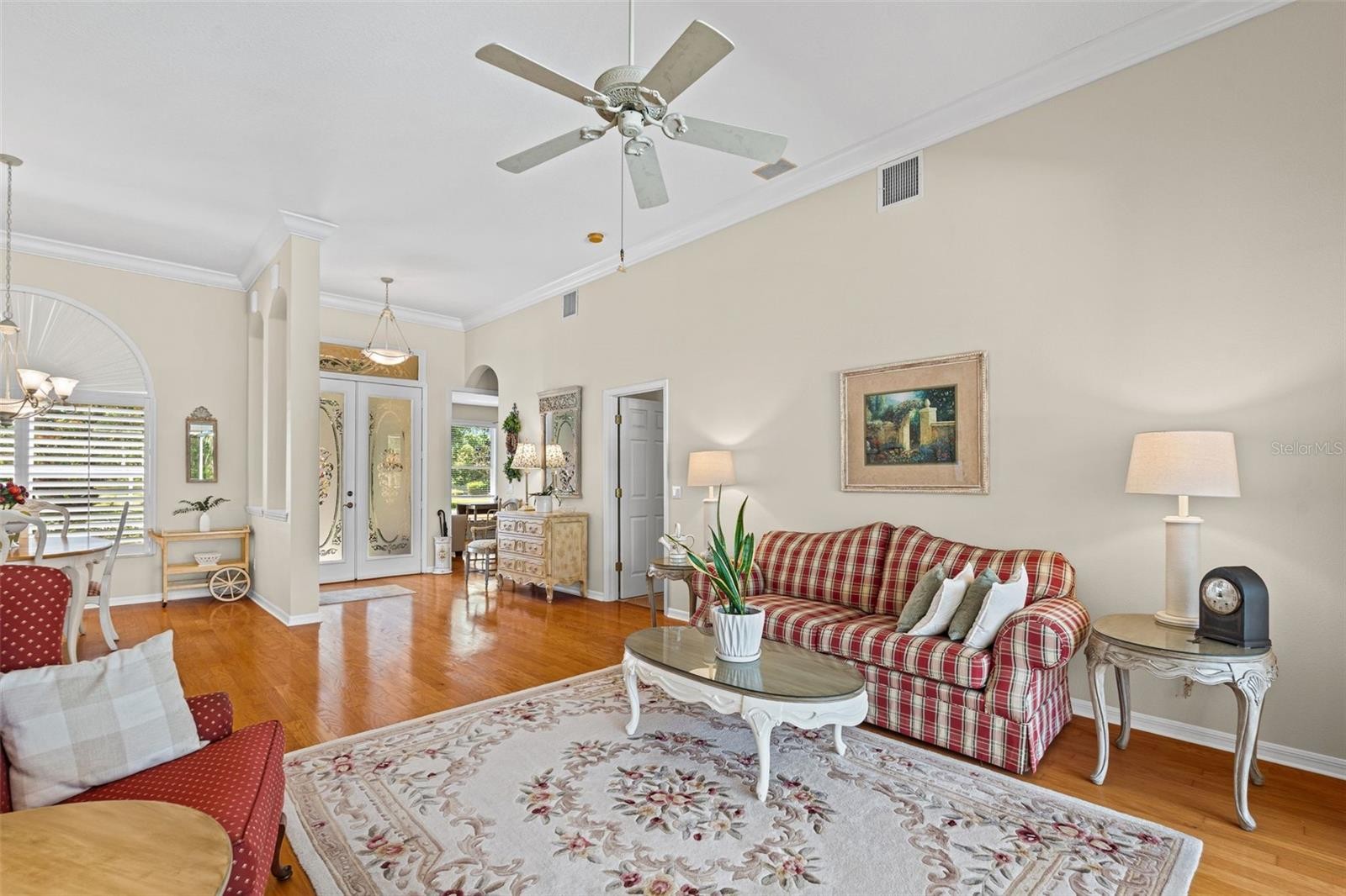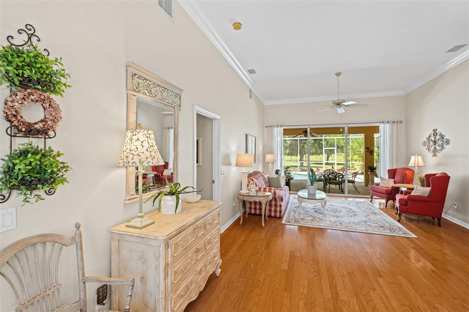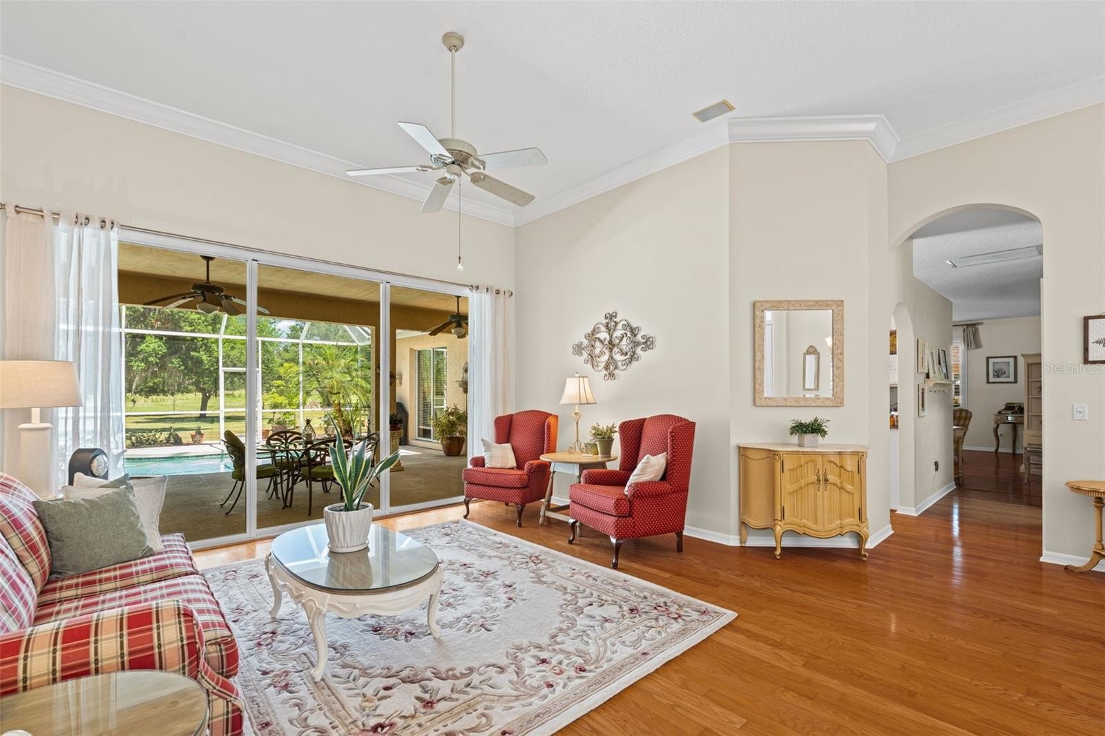 “Country Charm with Everyday Convenience” FANTASTIC PRICE REDUCTION! Nestled on over an acre of beautifully manicured and mature landscaping, this custom-built Augusta model, featuring 3 bedrooms, 2 baths, and a den, offers a rare combination of elegance & comfort. The beautiful double glass front entry with matching transom windows sets the tone, opening to soaring 12-foot ceilings, refined crown molding, and an abundance of natural light. The Family room is anchored by a lovely wood-burning fireplace, while the den features Bay Window with custom built-in seating, blending functionality with architectural charm. The gourmet kitchen is the heart of the home, showcasing a granite-topped island, premium finishes, and seamless flow for both intimate gatherings and grand entertaining. The expansive master suite is a private sanctuary, complete with large walk-in closet En-suite bathroom boasting double sink vanity, frameless glass shower, roman tub, and bidet. Sliding doors allow easy access to pool deck and lots of light. Practical touches such as a well-appointed laundry room with cabinetry and a utility tub access the spacious 3 car garage equipped with workbench and extra storage. Outdoors, the property embraces Florida living at its finest. A tranquil pond, shared with a neighboring property, provides the perfect setting for fishing and quiet reflection. At the same time, the surrounding grounds attract deer, turkeys, and other wildlife, not to mention abundant butterflies in the garden, creating a private nature retreat. Golf cart accessibility enhances the lifestyle, and additional features such as New Roof installed (2021), Well Pump (2025), Hot Water Heater (2022), solar film on south facing windows, a water softener all add both efficiency and convenience. Located just 30 min. from downtown Sarasota, 20 min. to Waterside LWR, Only 11 miles from I-75, shopping & Restaurants. Convenient to both Siesta and Lido’s beautiful beaches and 15 min. from the Majestic Myakka State Park. With timeless design and serene surroundings, this home is a refined retreat where luxury meets tranquility. Schedule you showing today!