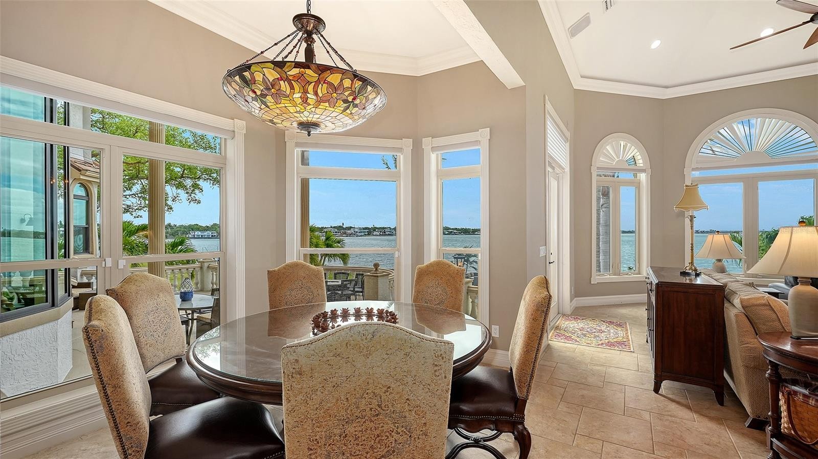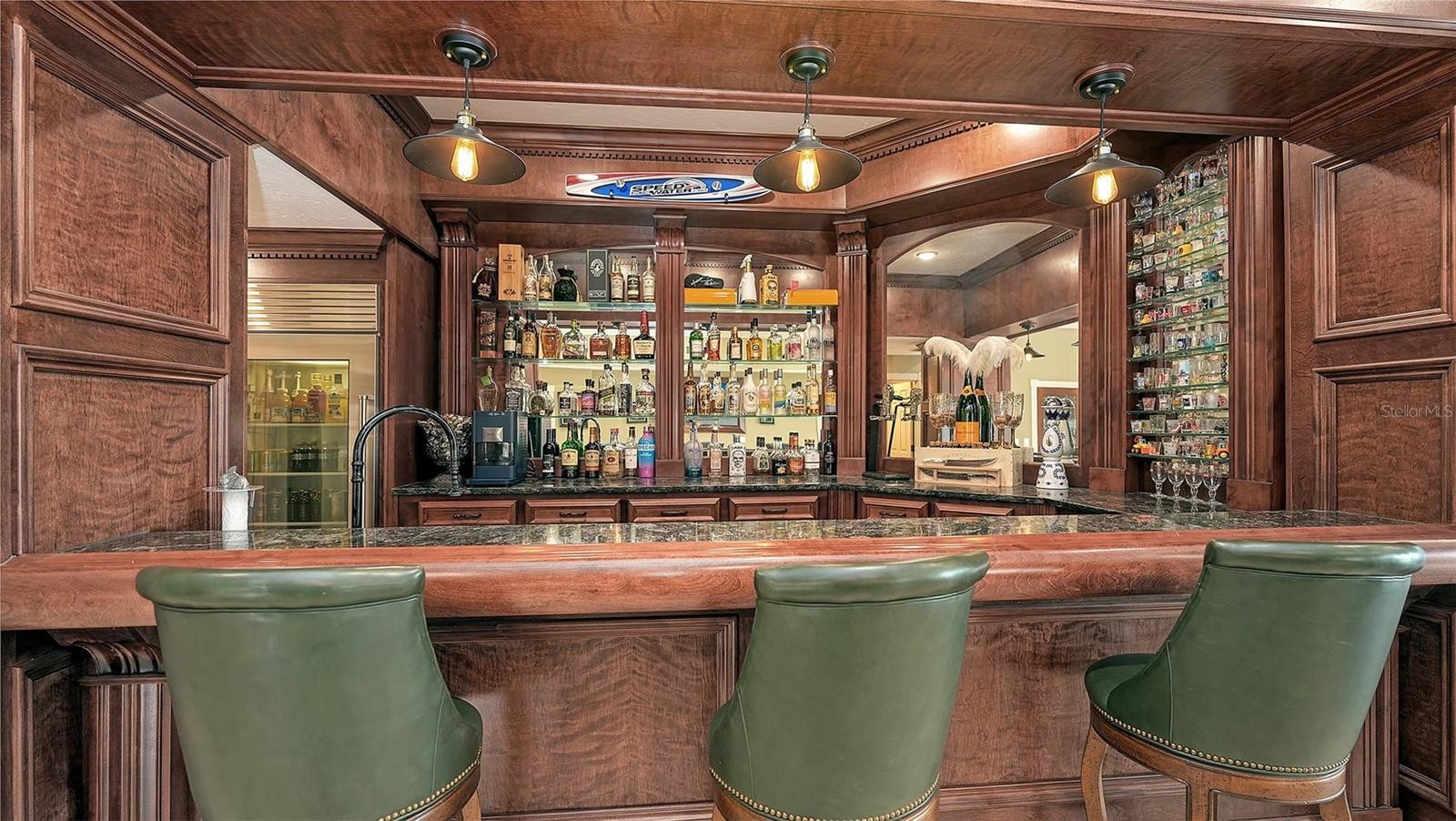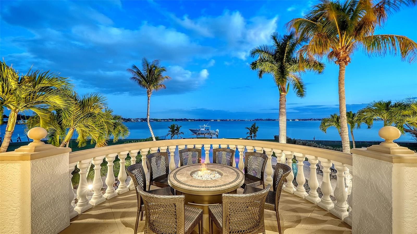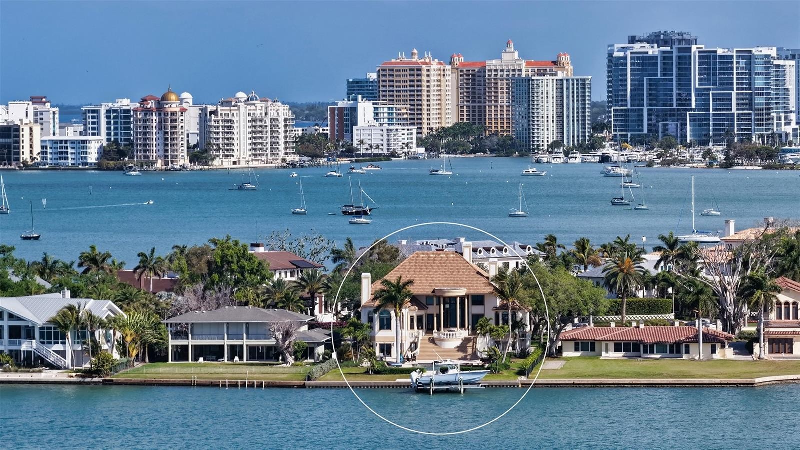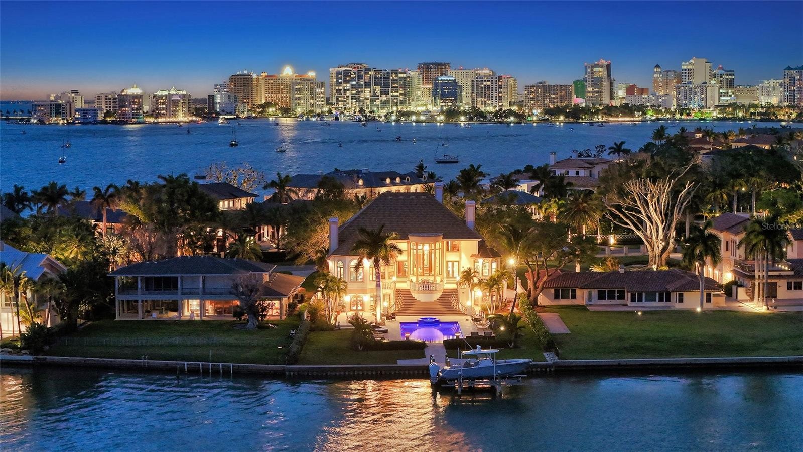 Introducing “Gatsby Manor,” set along Hillview Drive, one of Sarasota’s most coveted bayfront addresses, often compared to Port Royal for its exclusivity and waterfront lifestyle, this rare Harbor Acres estate property spans nearly three-quarters of an acre on deep, boatable water with sweeping, unobstructed Sarasota Bay views stretching south toward Siesta Key and the Gulf of Mexico, representing one of the neighborhood’s most distinguished open-bay offerings where only a select few residences achieve true estate scale. Encompassing more than 8,000 square feet of air-conditioned space with four bedrooms and three-and-a-half baths. The residence is complemented by a grand motor court accommodating 15+ vehicles beneath a canopy of majestic grand oaks. Privately approached through wrought-iron gates and a sweeping circular drive anchored by a multi-tiered fountain, the home opens to a dramatic two-story foyer framing the water beyond. Interiors are defined by soaring ceilings up to 22 ft. in height, exceptional millwork, multiple fireplaces, a striking two-story wood-paneled library, formal dining with 12-foot ceilings, and a wetbar—perfectly blending elegant entertaining with comfortable daily living. The chef’s kitchen is designed to support both everyday living and large-scale gatherings, featuring double 36-inch Sub-Zero refrigerators with dual freezer drawers, two dishwashers, and a 60-inch Wolf gas range with six burners and infrared dual griddle. The owner’s suite occupies the entire east wing of the main living level, creating a private waterfront retreat complete with a gas fireplace, sitting area overlooking the pool and bay, dual walk-in closets, and a spa-inspired bath highlighted by a sculptural copper soaking tub, dual vanities, and a dedicated luxury makeup area. Upstairs, a second primary-style suite and two additional guest bedrooms are accessed via the grand staircase or three-stop elevator, offering privacy and flexibility for family and guests. The 3,800+ square-foot ground-level bonus area serves as the home’s ultimate entertaining environment, featuring a remarkable speakeasy lounge and an impressive 700+ bottle wine room. This expansive space functions as a true extension of the residence’s living experience—ideal for hosting gatherings, intimate evenings, or celebrations on a grand scale. Outdoor living is equally exceptional, centered around an expansive marble terrace surrounding the 25’ × 60’ heated saltwater pool with integrated sun shelf and spa. A brand new deep-water dock with a 20,000 lb. boat lift and seawall replaced in 2017 further enhance the property’s boating capabilities and long-term value. Additional highlights include hurricane-rated garage doors, elevator access to all three levels, a drive-through three-car garage, and extensive storage throughout. Perfectly positioned just a short stroll to Southside Village’s restaurants and boutiques, minutes from downtown Sarasota’s celebrated arts and cultural district, and only four blocks from Sarasota Memorial Hospital. Gatsby Manor offers a truly rare opportunity to enjoy estate-scale open-bay living with deep water, privacy, and exceptional walkability in one of Sarasota’s most prestigious waterfront neighborhoods.