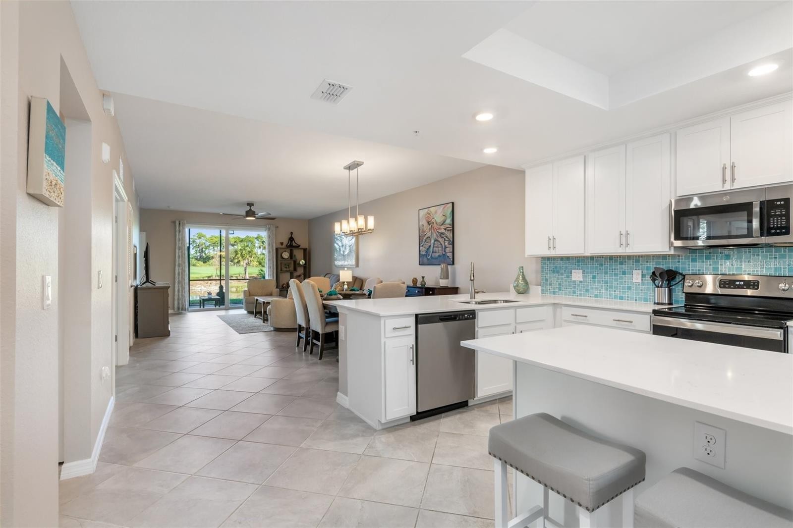 GOLF MEMBERSHIP INCLUDED in this Arabella Model END UNIT condo with a front row seat to a shimmering pond and gorgeous view of the 11th fairway. These veranda condos offer both a front and rear lanai, giving you 2 separate zones for relaxing, dining or entertaining your family and friends. Step inside to a smart and welcoming layout, featuring an open main living/dining/kitchen area, split bedrooms for privacy, and a true den that’s spacious enough to function as an office, media space, or even an overflow guest room. The end units are noticeably roomier, boasting 200 extra sq. ft. than the inner units, and bringing in more natural light from the additional side windows. This unit comes with a 1-car garage, perfect for your car, golf cart, workshop or storage. There are plenty of other parking spots available for your guests. A bundled golf membership grants immediate access to one of the region’s premier courses, an exceptional privilege for those who value both luxury and leisure. The community’s curated amenities include a resort-style pool and spa, tiki bar, tennis, pickleball, bocce, a state-of-the-art fitness center, aerobics studio, professional-grade pro shop, and a dedicated dog park. Our new club house is expected to be finished by late 2026 and is sure to impress! Every detail is designed to elevate daily life into something exceptional. All of this sits in the heart of Wellen Park, one of the fastest-growing master-planned communities in the country, surrounded by multiple beaches, boating options, waterfront dining, boutique shopping, and everything that makes Southwest Florida the lifestyle people dream about. If you’ve been waiting for a home that delivers views, comfort, and the full resort experience, this one checks every box.