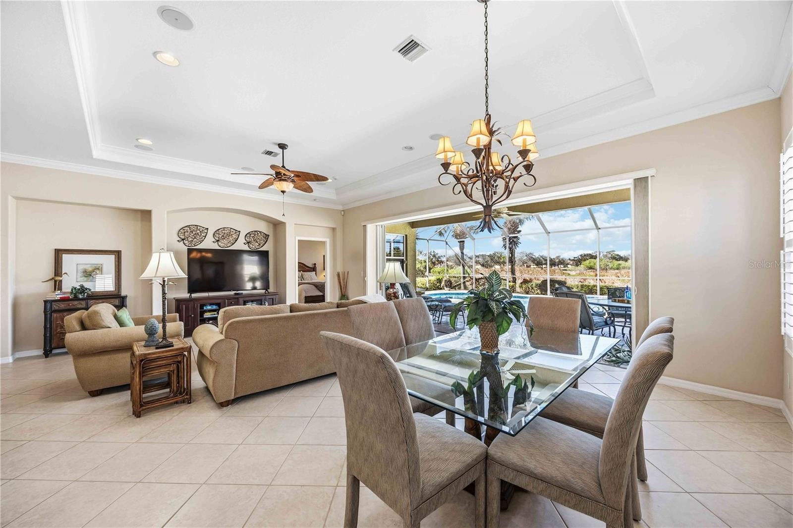 Welcome to resort-style living in the highly sought-after Venetian Golf & River Club. Step through the front door of this beautiful move-in-ready, fully furnished 2-bedroom, 2-bath home with den, where light-filled spaces, thoughtful design, and seamless indoor-outdoor living come together. A new A/C add comfort to for the new owner of this home. The bright, open-concept floor plan immediately draws your eye to stunning views of the heated pool and spa and expansive lanai overlooking a vast natural green space. Open the impressive 20’ wall of sliding glass doors to let the outdoors in, enjoying tranquil views from early morning light to breathtaking sunsets—perfect for both quiet evenings and entertaining. The lanai is truly a private retreat, featuring a 25’ covered area, custom paver pool deck, and ample space to relax in the shade or enjoy meals outdoors. Prefer the sun? Lounge poolside or unwind in the custom-tiled saltwater pool or hot tub, all while overlooking the expansive green backdrop with gently swaying landscaping. Inside, the home showcases high ceilings, tray ceilings, double crown molding, neutral finishes, and abundant natural light. The kitchen is designed for both function and entertaining, offering granite countertops, a center island, breakfast bar, eat-in nook, ample cabinetry, and under-cabinet lighting, all open to the dining and living areas. The primary suite, privately located at the rear of the home, features serene views of the green space, pool, and lanai. The ensuite bathroom includes a large walk-in closet, walk-in shower, jetted tub, dual granite vanities, linen closet, and private water closet. Guests enjoy privacy at the front of the home with a nearby second bathroom featuring a granite vanity and tub/shower combination. The den, accessed through French doors, is ideal for a home office, study, or additional guest space. This home offers the perfect blend of space, privacy, and Florida lifestyle living—highlighted by peaceful views, a heated pool and spa, and exceptional indoor-outdoor living. Community amenities include restaurant, resort-style pool with tiki bar, lap pool, fitness center, tennis and pickleball courts, scenic river walk trails along the Myakka River, and a gated, guard-attended entrance. Residents may join the Venetian Golf Club for an additional membership fee. Ideally located approximately 3 miles to I-75 and Sarasota Memorial Hospital–Venice, 9 miles to Nokomis Beach and Historic Downtown Venice, 11 miles to Wellen Park, and just 20 minutes to Sarasota.