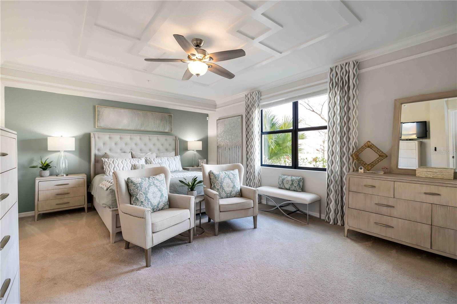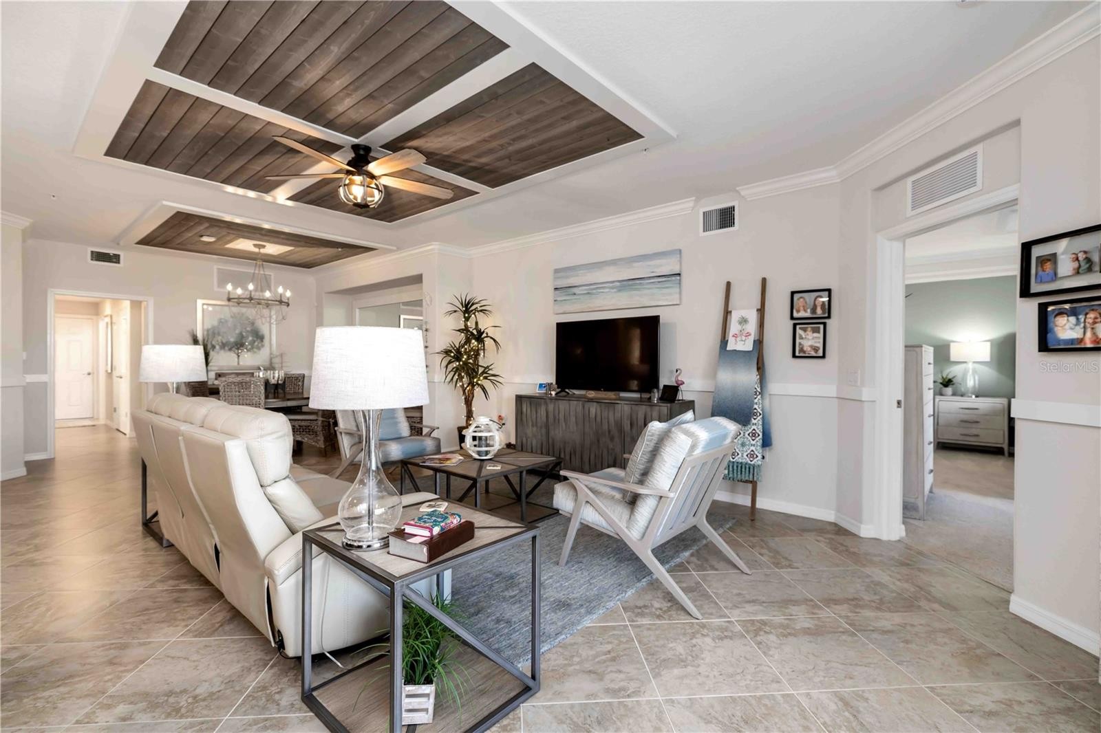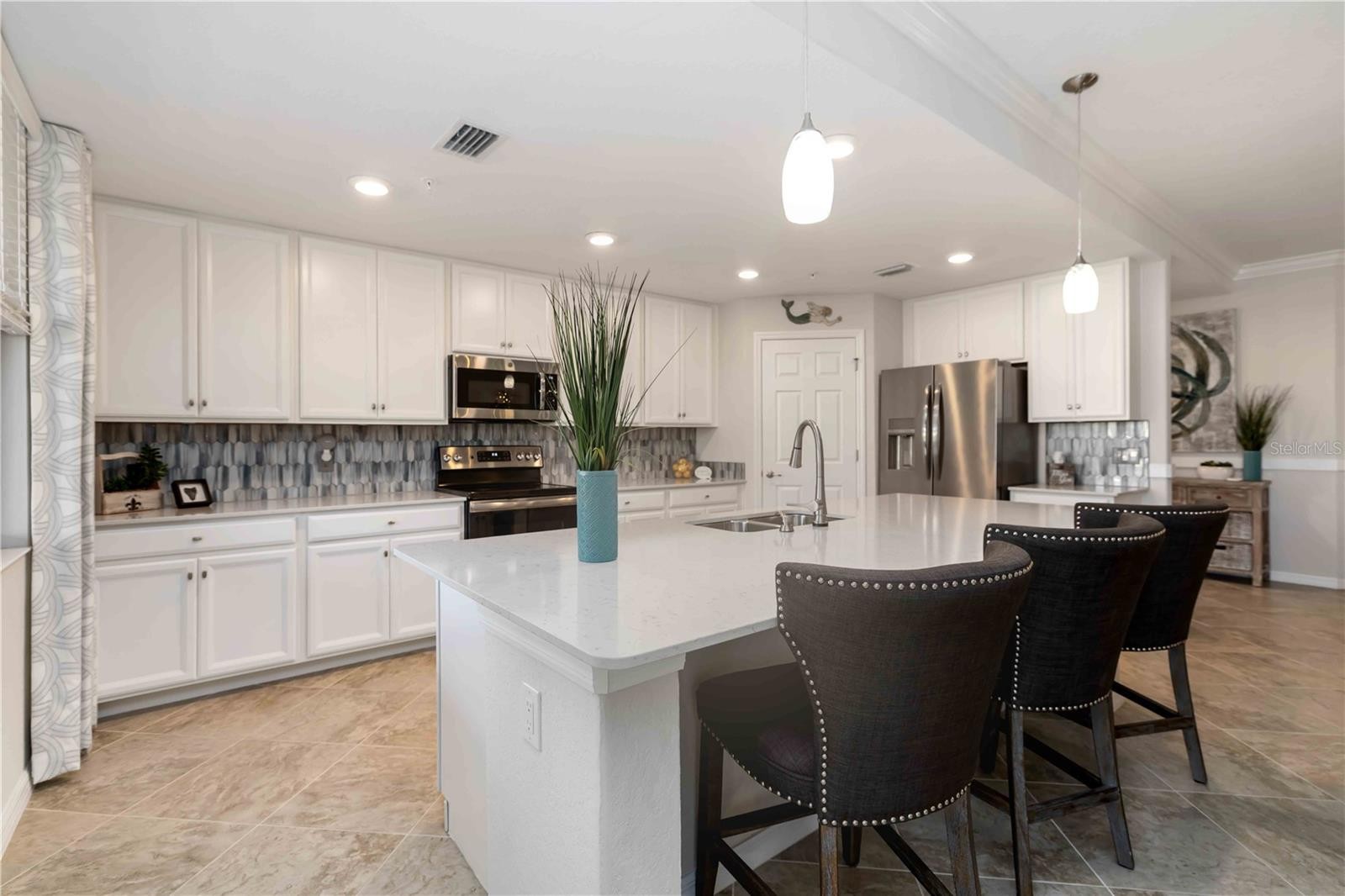 Welcome to your maintenance-free slice of paradise! Perfectly situated in the heart of amenity rich Gran Paradiso—peacefully tucked away from future development sites—this stunning 3-bedroom, 2-bathroom former Model home offers the ultimate Florida resort lifestyle. From the moment you step through the screened front entry, you will be captivated by the home’s sophisticated yet relaxed beachy feel. Brimming with high-end designer touches, the interior showcases exquisite decorative walls, striking ceiling details, elegant crown molding, and classic chair railing throughout. The heart of the home is a beautifully appointed, upgraded kitchen. It features gleaming quartz countertops (found seamlessly throughout every bathroom as well), 46-inch upper cabinets, a custom backsplash, and a brand-new refrigerator. Designed for both entertaining and everyday convenience, you’ll also love the large walk-in corner pantry, touch faucet, and the cleverly hidden roll-out trash can. Retreat to the extra-large master suite, which boasts ample space for a private seating area, two generous walk-in closets, and direct sliding-door access to the lanai. The spa-like master bathroom is a true oasis, featuring his and hers vanities and a massive oversized shower with a seamless glass surround. Your guests will feel equally pampered in the private guest bedroom wing, which utilizes a pocket door to create a secluded en-suite experience with its own spacious bathroom. Seamless indoor-outdoor living awaits on your expansive, shaded lanai. Complete with two ceiling fans and convenient roll-down sun shades across the entire rear, it is the absolute perfect vantage point for taking in tranquil lake views and breathtaking Florida sunsets thanks to the highly desirable western exposure. This home is as practical as it is beautiful, offering total peace of mind. It sits high and dry in Flood Zone X (no flood insurance required!) and is fully equipped with impact glass windows and sliders. Additional thoughtful upgrades include a whole house water softener, HVAC system with integrated UV light air purification system, an insulated garage door with keyless entry, a brand-new hot water heater, a built-in fire protection sprinkler system, dimmer switches throughout, custom fans and lighting, and an included newer washer and dryer. Beyond your front door, you are just a stone's throw from the vibrant dining, shopping, and entertainment of the brand-new Downtown Wellen Park, and only a short, breezy drive to the pristine sands of Gulf Coast beaches. Pack your bags and start enjoying all that Gran Paradiso has to offer, including: resort style pool, spa, fitness center, pickleball, tennis, miles of walking trails, and an active social calendar! Your HOA fees include: internet, cable tv, pest control, common area taxes, insurance, all yard care and exterior maintenance. Welcome home!