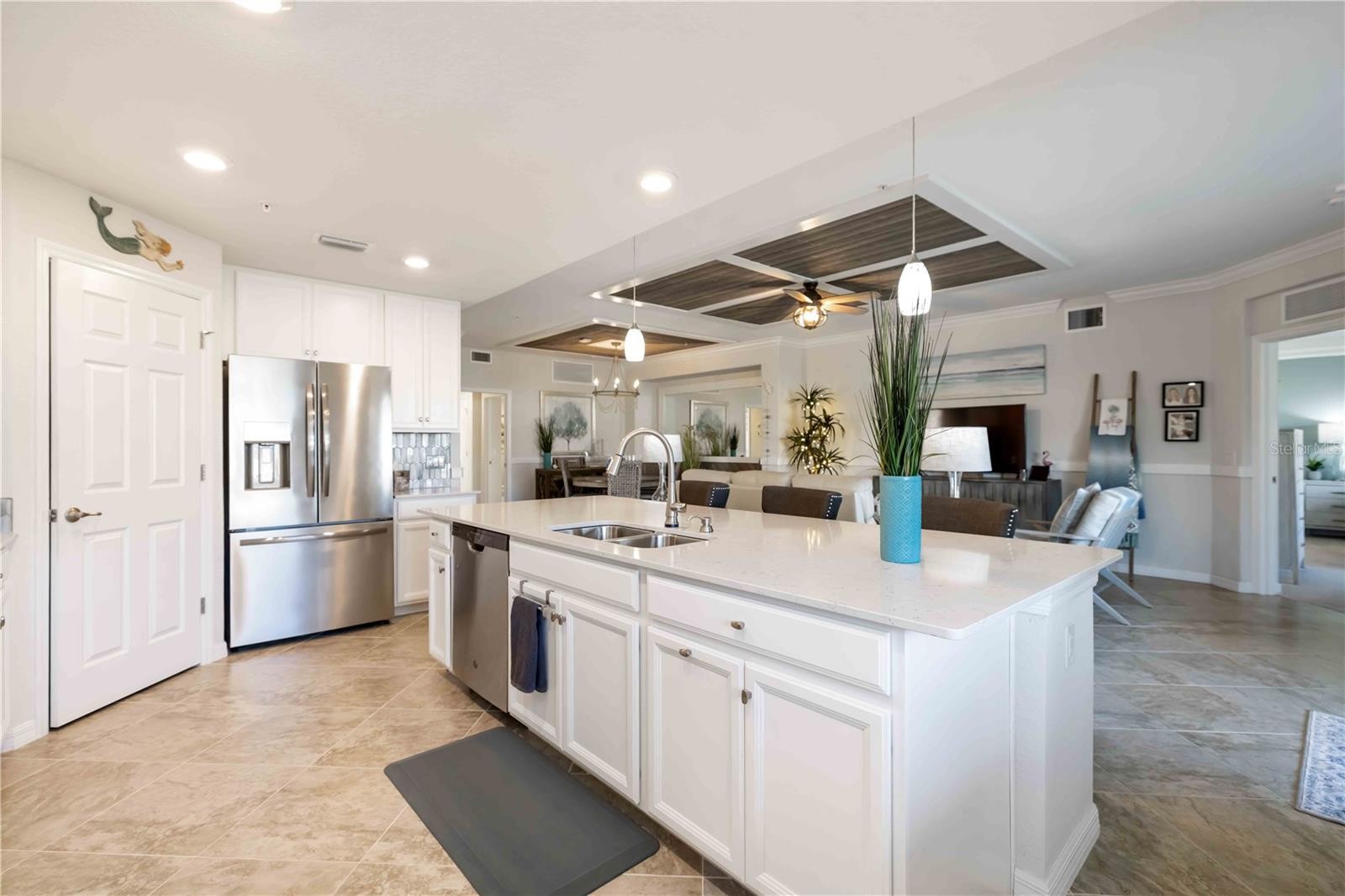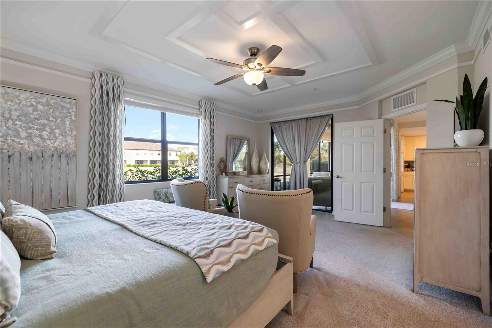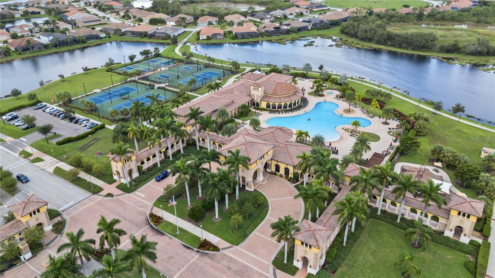 Welcome to your maintenance-free slice of paradise! Perfectly situated in the heart of amenity rich Gran Paradiso—peacefully tucked away from future development sites—this stunning 3-bedroom, 2-bathroom former Model home offers the ultimate Florida resort lifestyle. From the moment you step through the screened front entry, you will be captivated by the home’s sophisticated yet relaxed beachy feel. Brimming with high-end designer touches, the interior showcases exquisite decorative walls, striking ceiling details, elegant crown molding, and classic chair railing throughout. The heart of the home is a beautifully appointed, upgraded kitchen. It features gleaming quartz countertops (found seamlessly throughout every bathroom as well), 46-inch upper cabinets, a custom backsplash, and a brand-new refrigerator. Designed for both entertaining and everyday convenience, you’ll also love the large walk-in corner pantry, touch faucet, and the cleverly hidden roll-out trash can. Retreat to the extra-large master suite, which boasts ample space for a private seating area, two generous walk-in closets, and direct sliding-door access to the lanai. The spa-like master bathroom is a true oasis, featuring his and hers vanities and a massive oversized shower with a seamless glass surround. Your guests will feel equally pampered in the private guest bedroom wing, which utilizes a pocket door to create a secluded en-suite experience with its own spacious bathroom. Seamless indoor-outdoor living awaits on your expansive, shaded lanai. Complete with two ceiling fans and convenient roll-down sun shades across the entire rear, it is the absolute perfect vantage point for taking in tranquil lake views and breathtaking Florida sunsets thanks to the highly desirable western exposure. This home is as practical as it is beautiful, offering total peace of mind. It sits high and dry in Flood Zone X (no flood insurance required!) and is fully equipped with impact glass windows and sliders. Additional thoughtful upgrades include a whole house water softener, HVAC system with integrated UV light air purification system, an insulated garage door with keyless entry, a brand-new hot water heater, a built-in fire protection sprinkler system, dimmer switches throughout, custom fans and lighting, and an included newer washer and dryer. Beyond your front door, you are just a stone's throw from the vibrant dining, shopping, and entertainment of the brand-new Downtown Wellen Park, and only a short, breezy drive to the pristine sands of Gulf Coast beaches. Pack your bags and start enjoying all that Gran Paradiso has to offer, including: resort style pool, spa, fitness center, pickleball, tennis, miles of walking trails, and an active social calendar! Your HOA fees include: internet, cable tv, pest control, common area taxes, insurance, all yard care and exterior maintenance. Welcome home!