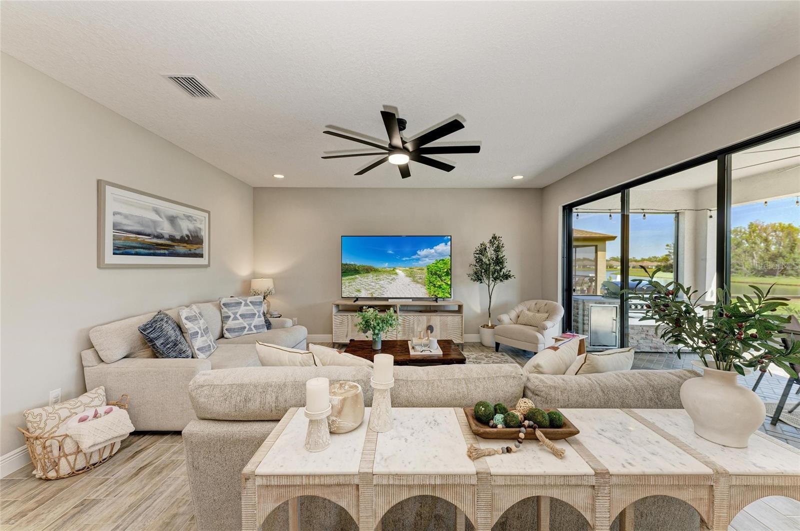 Welcome to Your Dream Home—A 2022 Luxury Masterpiece with Lake and Conservation Views Experience the perfect blend of comfort, style, and sophistication in this beautifully crafted 5-bedroom, 3-bathroom home, offering 3,419 sq. ft. of thoughtfully designed living space. Located in the desirable Crosswind Point community, this home is a true haven, thoughtfully designed for both elegance and everyday living. The spacious layout features five inviting bedrooms, including a serene owner’s retreat with a cozy sitting area, a generously sized walk-in closet, and an ensuite bath designed for relaxation—complete with a custom vanity, walk-in shower, and separate water closet. The open-concept living area creates a seamless flow between the grand living room, dining space, and the chef-inspired kitchen, all with easy access to the outdoor lanai, perfect for casual lounging or entertaining. Warm, rich plank tile flooring extends through the main living areas, adding a touch of elegance and making the space feel both inviting and refined. The kitchen is a true showstopper, with 42” cabinets, built-in features, soft-close drawers, and crown molding, paired with sleek Quartz countertops, a subway tile backsplash, and premium appliances—including a gas range and a large walk-in pantry. For those who love to entertain or need extra storage, the Butler’s pantry is truly one of a kind. It’s equipped with custom cabinetry, a beverage fridge, a work station, and even a stylish cherry-red fridge, alongside a dedicated prep countertop—perfect for both big gatherings and quiet nights in. The practical touches don’t stop there. Adjacent to the oversized (20’ x 23’) garage is a convenient drop-off station for coats, bags, and shoes, helping keep everything organized. The spacious laundry room is equipped with a utility sink and a Samsung smart washer/dryer set, making everyday chores a breeze. This home is full of thoughtful upgrades, including custom landscaping, paver pathways, screen enclosures, elegant lighting, and ceiling fans throughout. Every corner of this home has been designed to bring comfort and warmth. The expansive lanai is an outdoor oasis, featuring a fully equipped alfresco kitchen and offering peaceful views of lush conservation land and a tranquil lake. Whether you're enjoying a quiet morning with breathtaking east-facing views or entertaining loved ones, this outdoor space is sure to become a favorite retreat. More than $53,000 in additional upgrades include a gorgeous French-door office with custom built-ins and lighting, luxurious vinyl plank flooring in the guest room, upstairs, and stairs, custom blinds, built-in closets in the secondary bedrooms, and beautiful pendant lighting in the kitchen. The garage also features an epoxy-coated floor for easy maintenance. Crosswind Point offers the perfect balance of peaceful living and easy access to everything you need. Shopping, dining, and entertainment are just a short drive away, with downtown St. Petersburg and Sarasota only 30 minutes away, and downtown Tampa a quick 40-minute drive. Exclusive community amenities include a pool, cabana, pocket parks, and scenic pond views—making this the perfect place to call home.