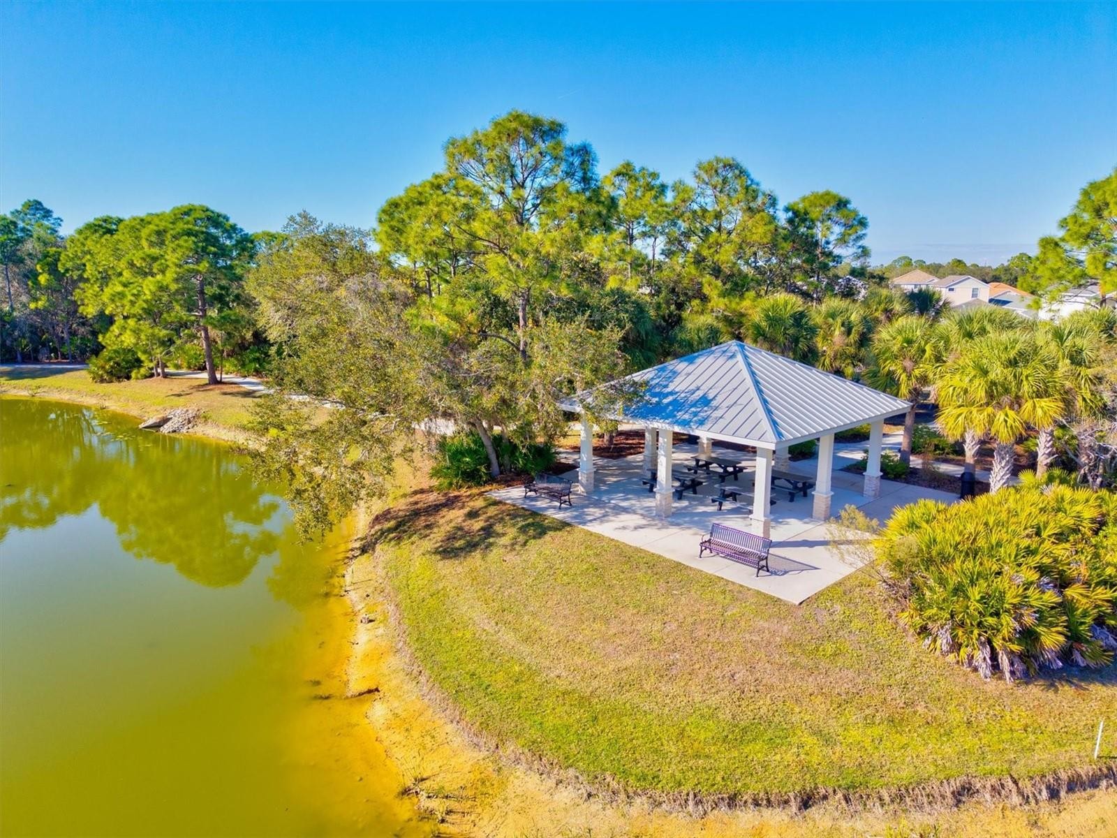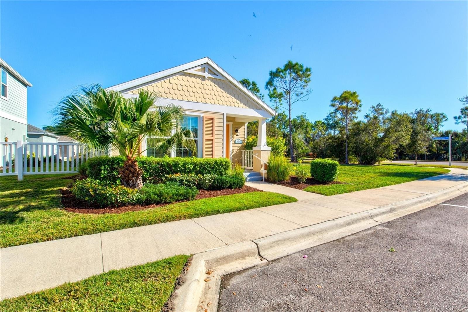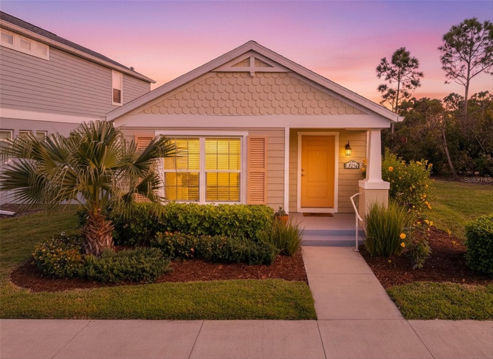 Enjoy peaceful pond views and glowing sunsets from the front porch of this picture-perfect cottage, ideally situated on a desirable corner lot within the gated, resort-style Grand Palm community. This impeccably maintained two-bedroom, two-bath home with an attached two-car garage is spotless, move-in ready, and filled with abundant natural light throughout. Inside, the open and airy floor plan seamlessly connects the great room, dining area, and kitchen, creating an inviting space ideal for both everyday living and entertaining. The bright kitchen features granite slab countertops, a stone backsplash, stainless steel appliances, a closet pantry, and a spacious breakfast bar with pendant lighting. Maple cabinetry with crown molding adds warmth and timeless appeal. The spacious owner’s suite offers room for a sitting area, a walk-in closet, and a well-appointed ensuite bath. A second bedroom and full bath provide comfort and flexibility for guests or a home office. Additional highlights include volume ceilings, neutral tile in the main living areas, brand new carpet in the bedrooms, faux wood blinds, fresh interior paint, and breathtaking front-facing views of the water and surrounding natural landscape. The attached two-car garage offers direct access to the home and features charming exterior coach lighting, while the interior laundry room includes shelving for added convenience. Located just a short walk from the clubhouse, this home provides easy access to Grand Palm’s exceptional amenities, including a resort-style pool, splash park, tot lot, fitness center, and an on-site activities director offering year-round programming. Outdoor enthusiasts will love the adventure lake with kayak and canoe launch, miles of scenic walking and biking trails, multiple dog parks, and beautifully maintained lakes and green spaces throughout the community. Enjoy true maintenance-free living in one of the area’s most sought-after communities, where location, lifestyle, and comfort come together beautifully.