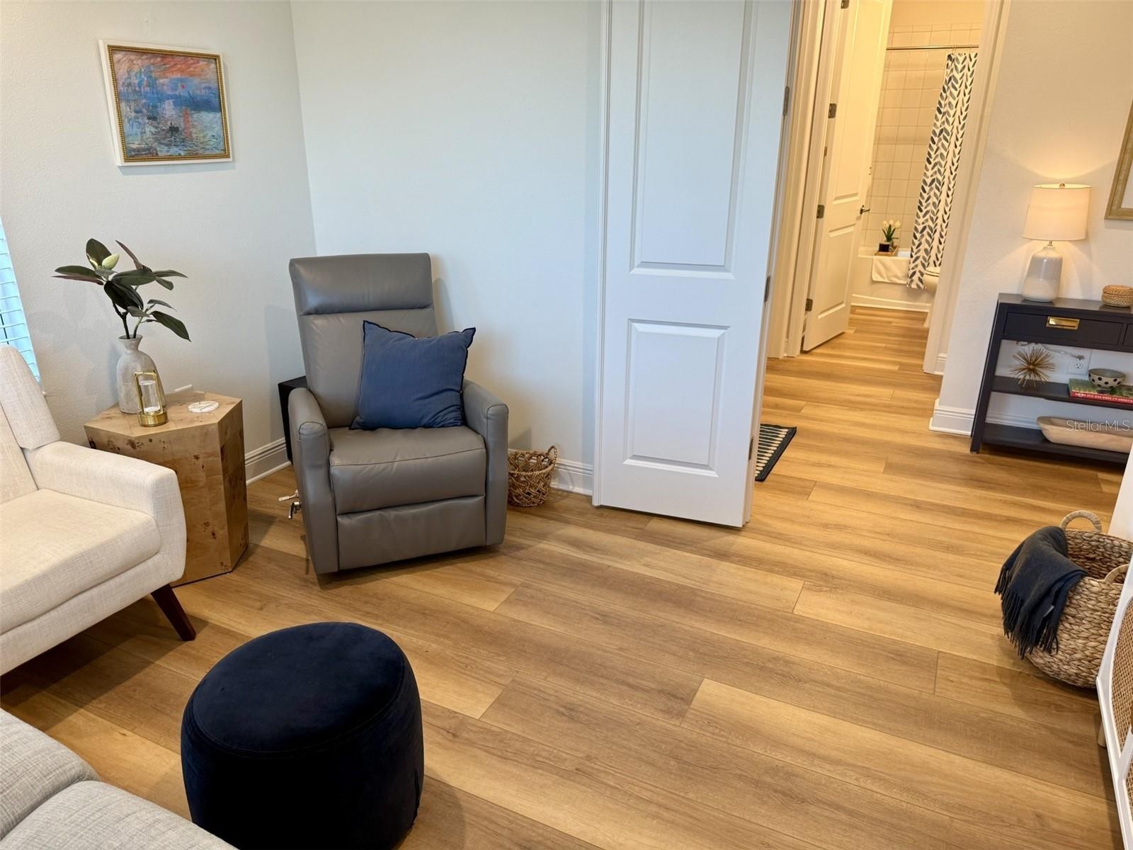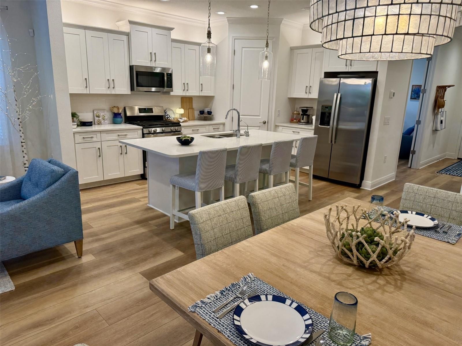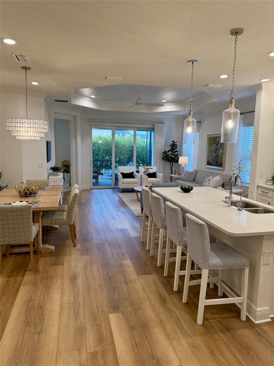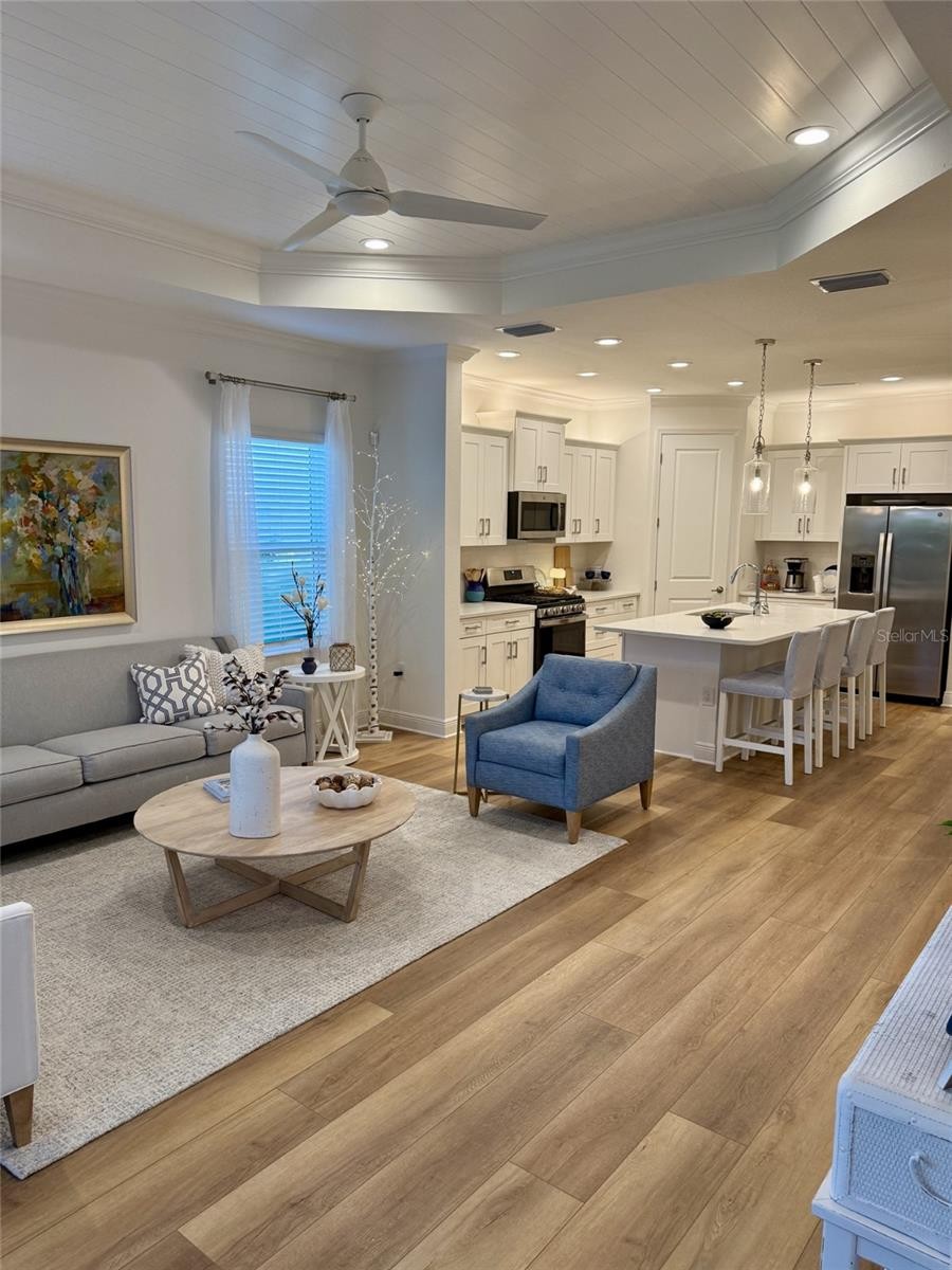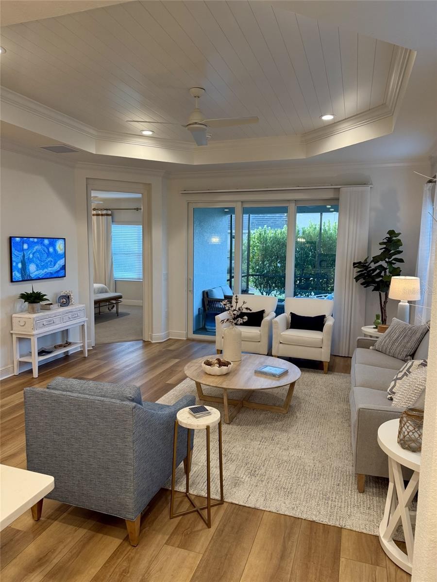 Better than the builder’s model and loaded with upgrades you won’t find in other villas, this stunning 2023-built 2-bedroom, 2 bath + flex room home in Grand Palm is the one buyer’s wait for — and they don’t last. Perfectly positioned on a large corner lot with desirable southern exposure, you’ll enjoy gorgeous sunrise views over the lake from your extended lanai, surrounded by mature landscaping for rare privacy. Inside, the difference is immediate — 8-foot doors throughout, elegant crown molding, a custom shiplap tray ceiling in the living room, and a designer accent wall create a high-end, model-like feel. Luxury vinyl plank flooring, upscale lighting, and premium window treatments — including an expensive upgraded slider treatment — elevate every space. Hurricane-impact windows and doors provide security and peace of mind. The kitchen is beautifully appointed with upgraded cabinetry featuring soft-close drawers and pull-outs, Upgraded appliance package including convection oven, RO drinking water faucet , Over-cabinet lighting, and even dedicated power in the pantry for small appliances. Thoughtful details continue with power in the front closet for a charging station; dimmer switches on the lanai and in bath two, upgraded tile in the bathrooms, and a highly desirable easy-access shower not found in other villas. A whole-house water softener, reverse osmosis drinking water system, epoxy garage flooring, and added storage shelving complete this exceptional home. This is not a standard new build — it’s a meticulously upgraded, move-in-ready villa that truly stands out. If you’ve been waiting for something special in Grand Palm, this is it. Schedule your showing before it’s gone.