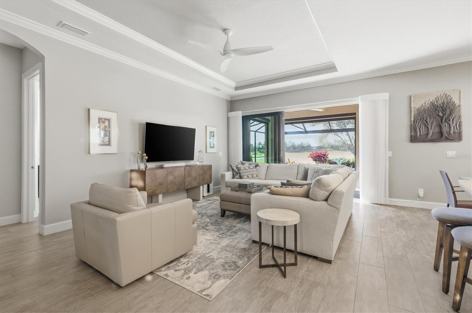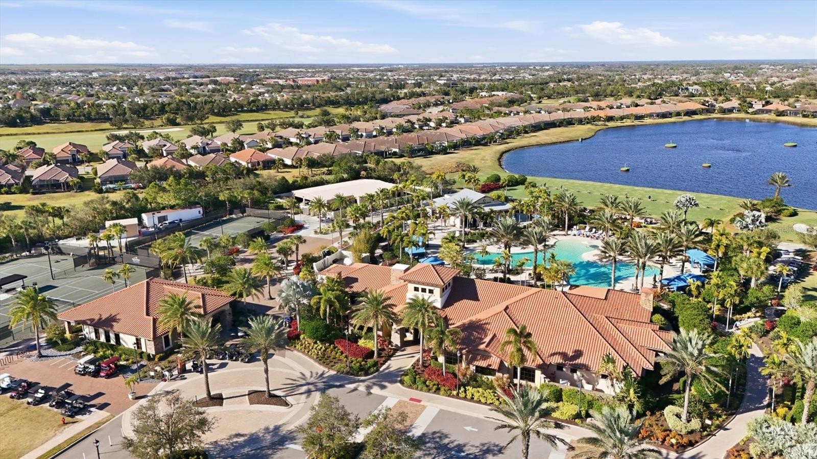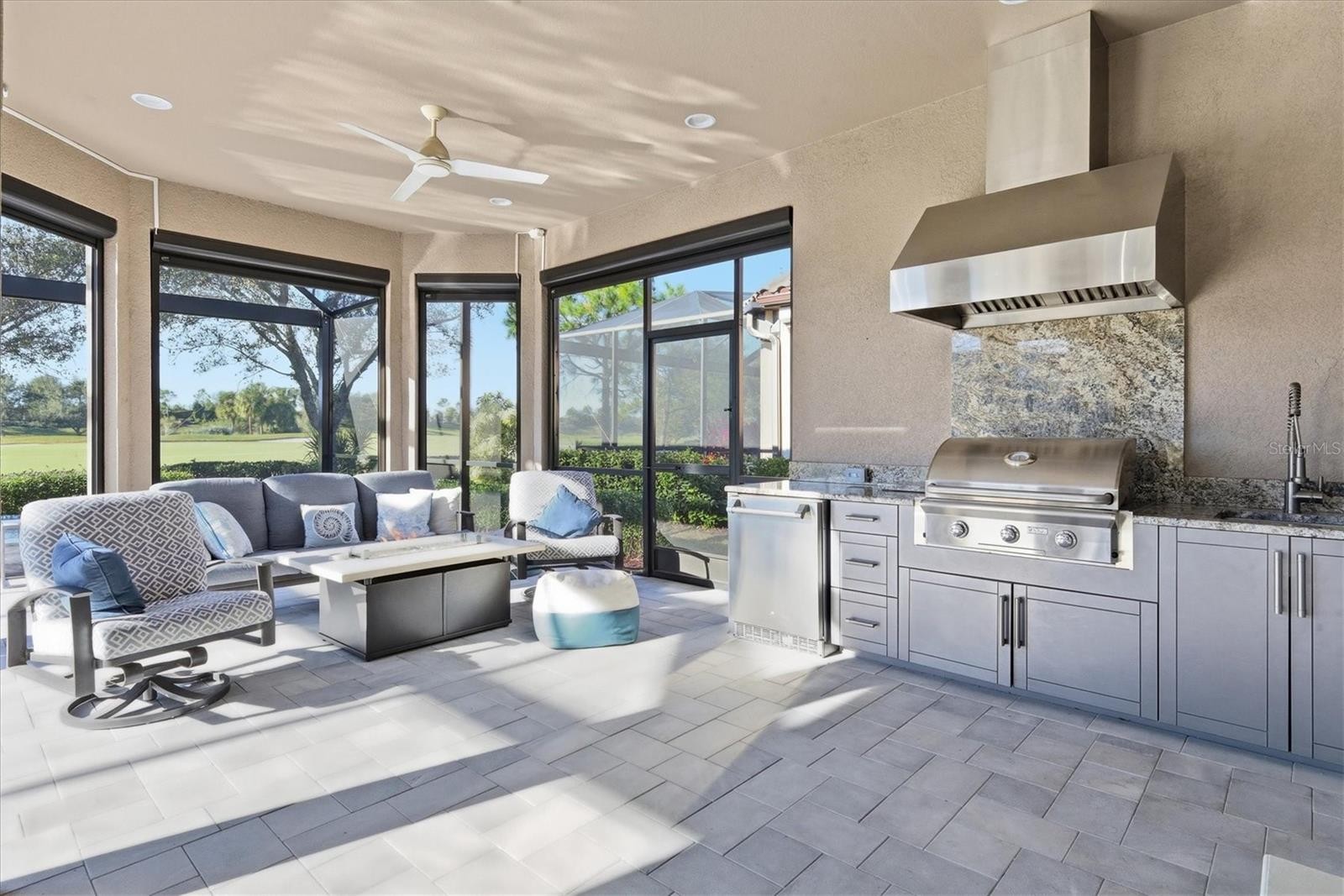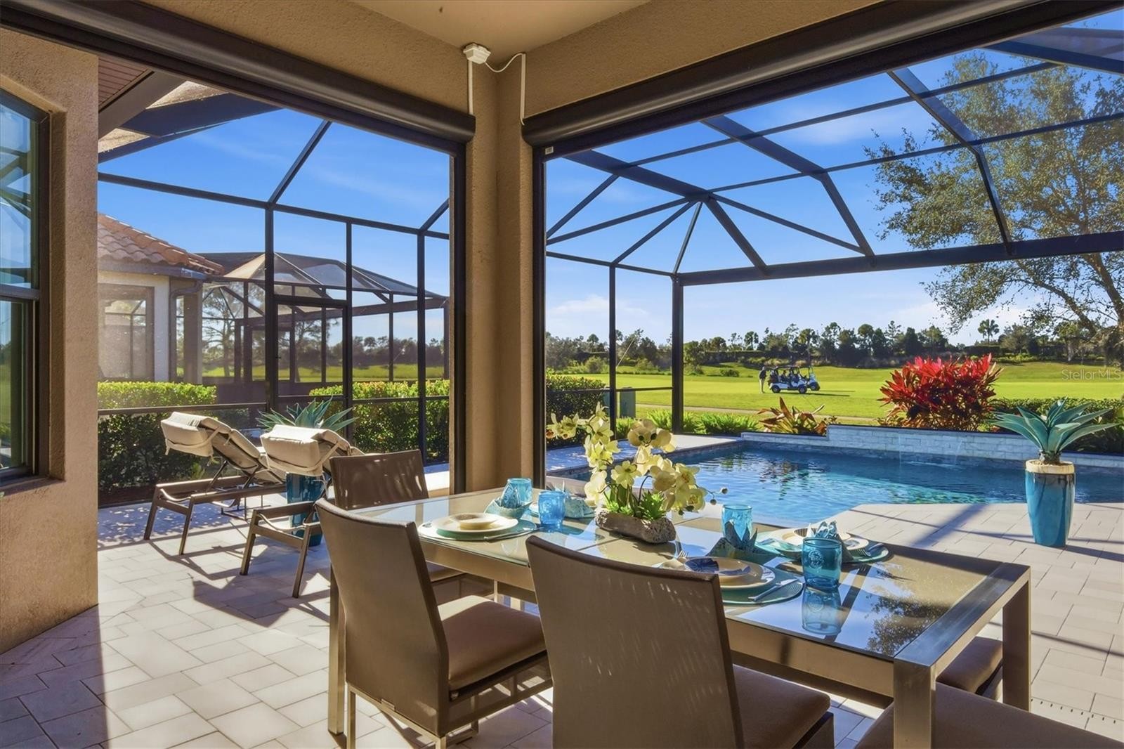 In Lakewood Ranch’s prestigious Esplanade Golf and Country Club, this elegant residence offers a balance of resort living and refined design. Overlooking the golf course, the home offers a deeded golf membership and is positioned on a golf-front lot to capture expansive views and remarkable sunsets. Impact glass windows and doors add lasting value and protection. A custom-designed pool with an infinity-edge champagne spa highlights the outdoor living area, complemented by a granite summer kitchen and the rich texture of matte pale gray marble tile across the lanai. Interior and exterior automated solar shades enhance comfort and privacy, while decorative window treatments and room-darkening shades in the primary bedroom add a refined touch. Inside, light wood-look porcelain tile flooring, crown molding and custom-designed closets underscore attention to detail. The spacious kitchen features neutral pale gray cabinetry, quartz countertops, a reverse osmosis water system, and a casual breakfast area that overlooks the lanai, ideal for casual dining or enjoying serene mornings. Additional features include automated garage storage shelving and thoughtfully integrated technology throughout. Residents enjoy an active country club lifestyle that includes tennis, pickleball, resident- run interest groups, community- sponsored social events, two large resort-style pools, two clubhouses, state-of-the-art fitness centers, the Barrel House Bistro, Bahama Bar and on-site dining at the Culinary Center. This residence reflects the exceptional quality and luxury living that defines Esplanade Golf and Country Club in Lakewood Ranch, just moments from the cultural attractions and coastal beauty of Sarasota.