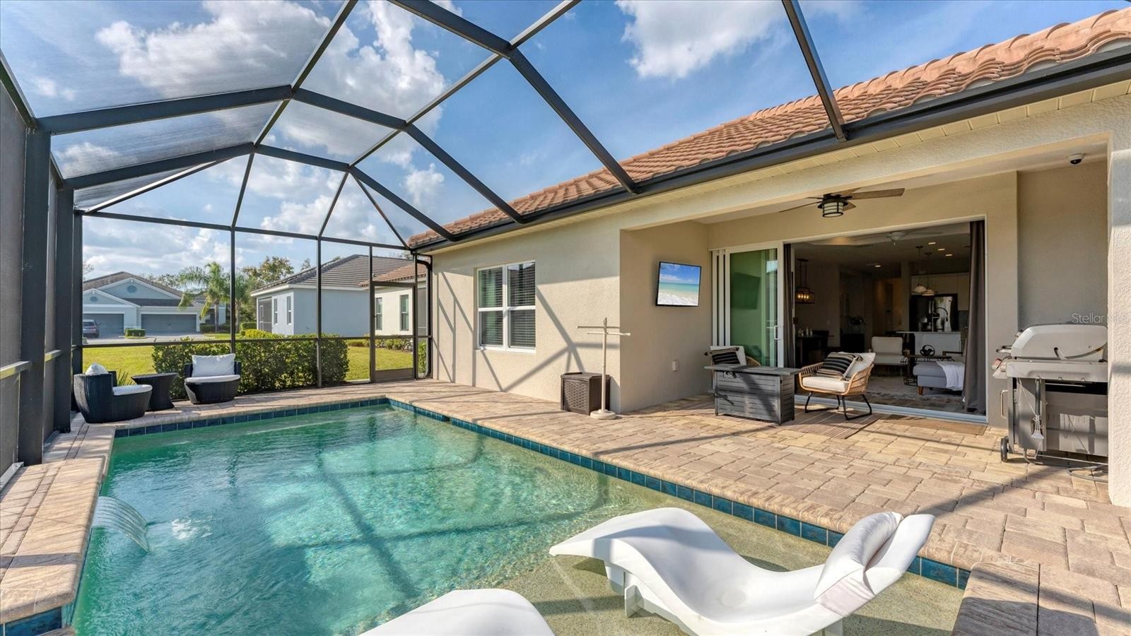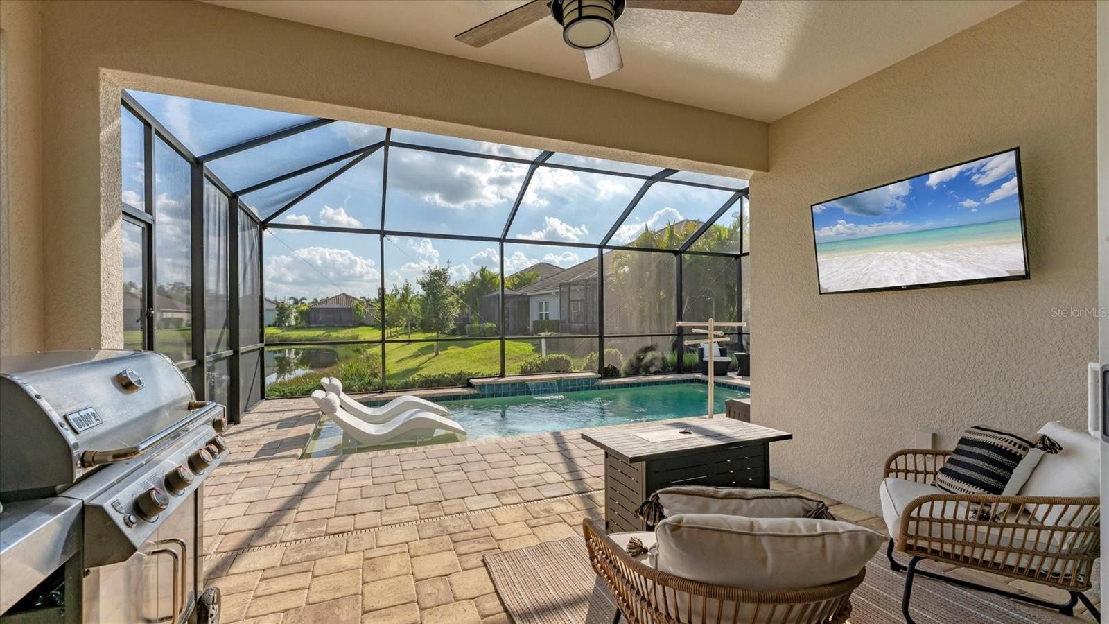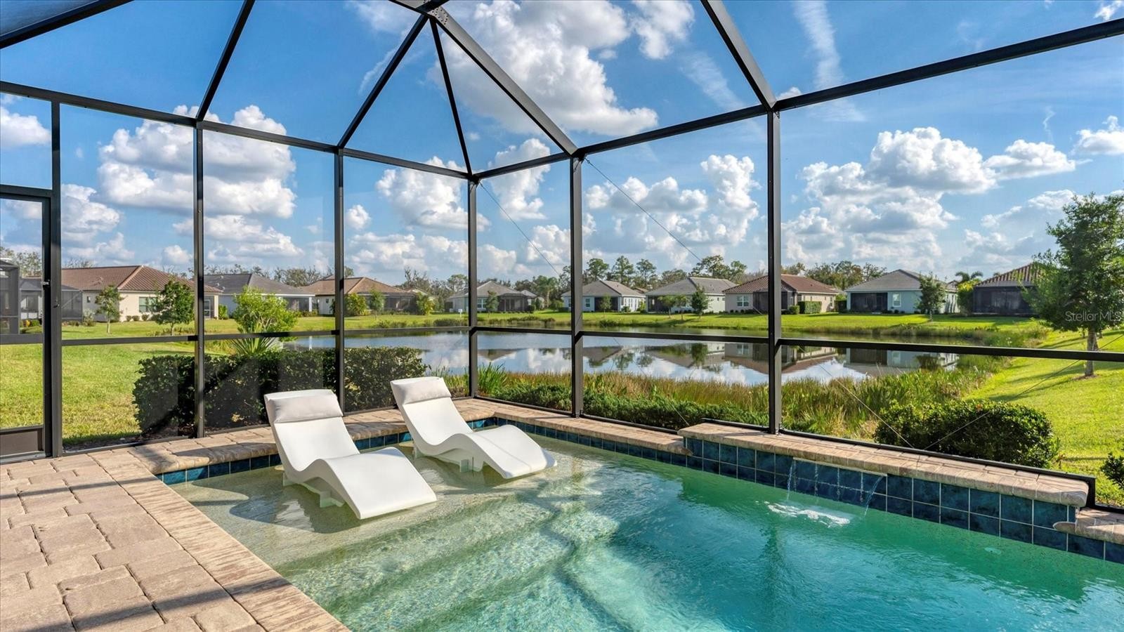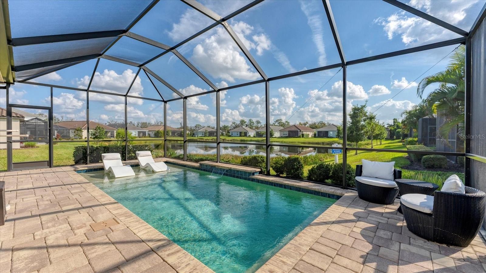 Model perfect living with serene water views in Indigo is now available for the most discerning buyer. Experience the epitome of Florida living in this meticulously maintained, three bedroom, plus a den/office, two bath residence located in the highly sought after gated community of Indigo in Lakewood Ranch, Florida. Spanning just under 1800 square feet of living space, this house features designer finishes and an effortless flow for entertaining. The open concept living area leads directly to your private resort style pool oasis with water features. The sparkling in ground pool and paver lanai boasts peaceful lake views conducive for the best experiences of rest and relaxation in the sunny Florida weather! Located in a premier active lifestyle community with a plethora of amenities AND a lifestyle community director, enjoy activities such as pickleball, workout at the fitness center, and socialize at the clubhouse. The gated, all tile roof community of Indigo is also maintenance free which is perfect for active retirees, young professionals and busy families. As you walk across the paver driveway and enter through the front door, you will notice the upgraded tile plank floors throughout most of the home, the decorative wall décor, walk in closets, and the pristine, chef’s kitchen that is open to the great room and perfect for entertaining. The pantry is a walk-in style with wood shelving and the appliances are all stainless-steel GE creations which are punctuated by the lovely range hood. The countertops are a beautiful, neutral quartz and the kitchen also has a gas range for the most serious of culinary experts! The great room features an amazing brick décor with a built-in electric fireplace. Everything about this home speaks to relaxation, peace, serenity, and coziness that is ideal for enjoying with guests, friends and family! For the ultimate peace of mind, this home is offered with impact windows and sliders! This home and community are what true Florida living is all about. Schedule your showing today!