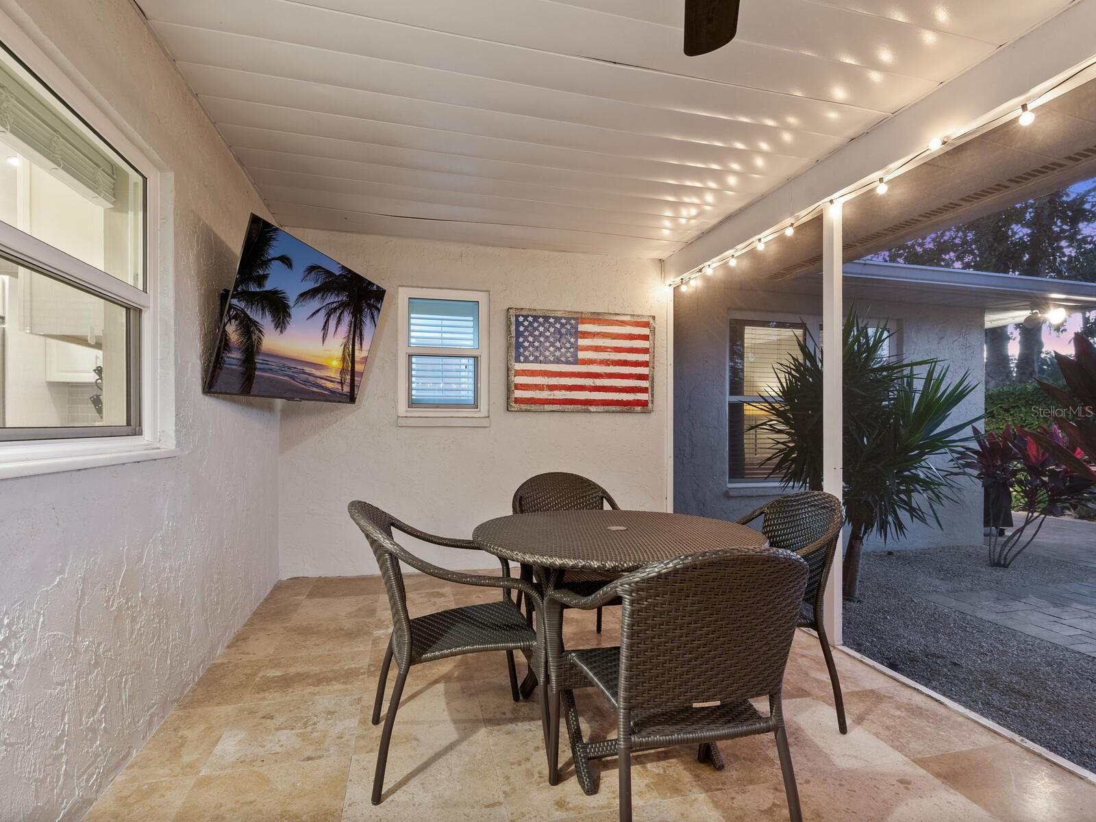 One or more photo(s) has been virtually staged. Set on a quarter-acre corner lot within a deed-restricted Sarasota community, this four-bedroom, two-bath residence blends comfort with modern enhancements. Constructed with concrete block and new hurricane-impact windows and doors, the home offers peace of mind and long-term value. The split floor plan delivers privacy and function, with primary suite positioned at the north end. The updated primary bath and expansive walk-in closet provide a refined retreat. At heart of the home, the open-concept kitchen showcases granite countertops, soft-close cabinetry, and bar seating that opens to a large dining area and vaulted family room with lake views and a travertine-clad wood-burning fireplace. Travertine and wood flooring extend throughout. Three-panel sliding doors reveal a screened lanai ideal for entertaining, offering serene lake views and a fountain feature. Additional highlights include 2025 hurricane-rated garage door, a 2019 air-conditioning system, new ductwork, updated CPVC plumbing and an oversized two-car garage with storage. The exterior has been transformed into a private oasis, complete with upgraded landscaping and paver patio designed for Florida living. This meticulously maintained home provides a rare combination of style, structure, and setting, all minutes from downtown Sarasota and the gulf beaches.