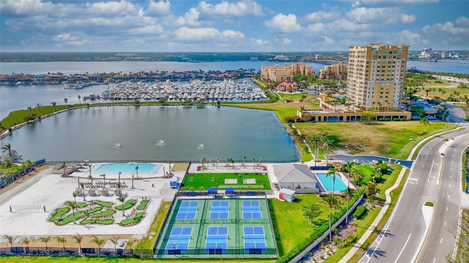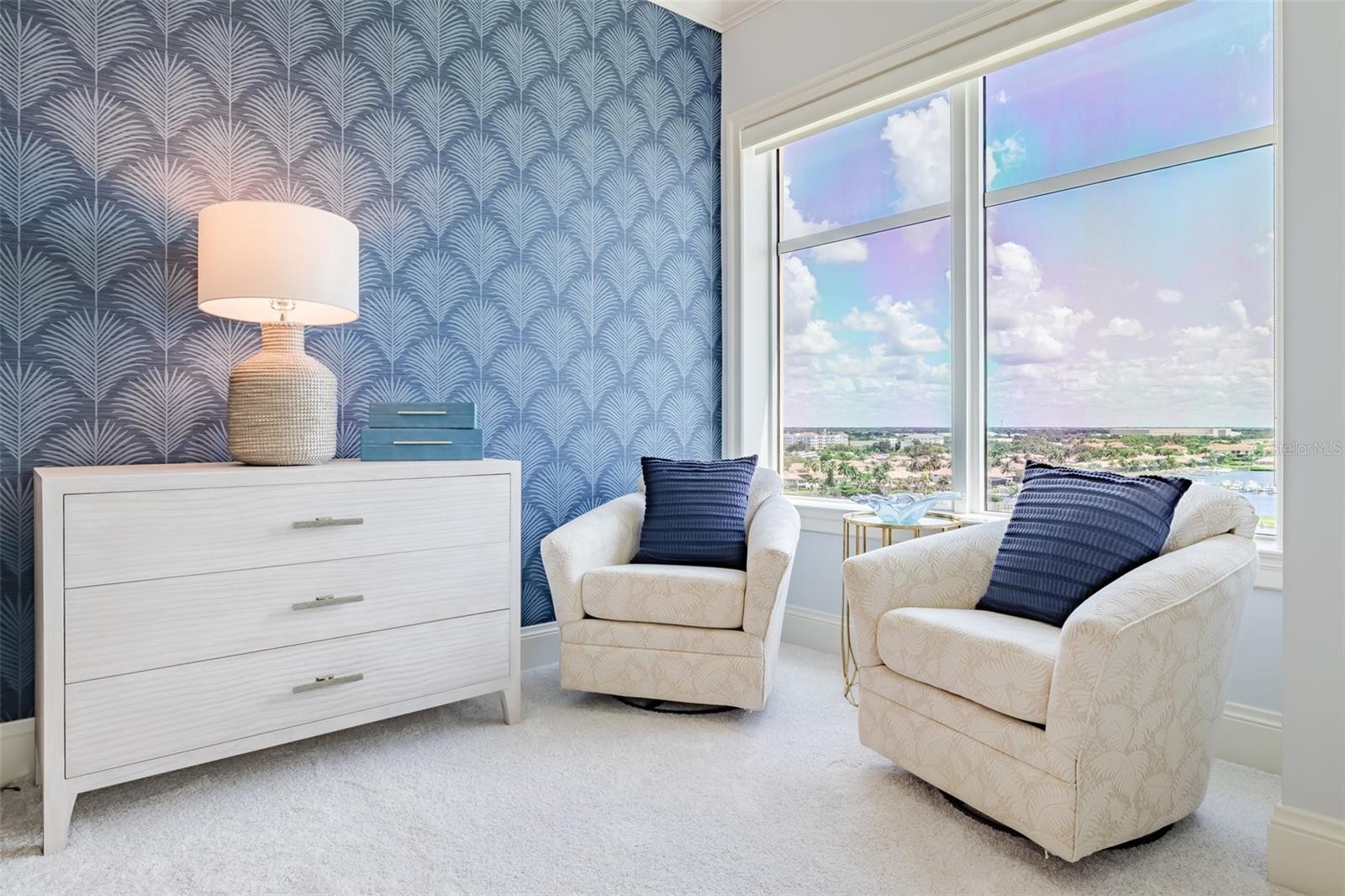 Welcome to one of Bel Mare’s most beautifully updated residences; this exceptional end-unit Rapallo floor plan offers over 3,350 total square feet and captures SWEEPING WATER VIEWS in multiple directions. Enjoy sunrises over the Manatee River and Riviera Dunes Marina from the east-facing balconies, along with stunning sunset views to the west; a rare and highly desirable combination. Arrive via your PRIVATE ELEVATOR entrance into a refined, open-concept living space featuring polished travertine flooring, professionally painted tray ceilings, and upgraded lighting throughout. The living area showcases CUSTOM built-ins and a FIREPLACE feature wall, while a beautifully designed bar with two beverage/wine refrigerators creates the perfect setting for entertaining. The kitchen offers Merillat wood cabinetry, stone countertops, a porcelain backsplash, pull-out shelving, and a 6-burner gas cooktop; a rare feature within the community. The split floor plan provides privacy, with a spacious primary suite offering balcony access, dual walk-in closets, and a fully reimagined SPA-LIKE bath with stunning BRAZILIAN QUARTZ countertops with under counter lighting, LED mirrors, and a custom frameless shower with body sprayers. Two additional guest suites feature COMPLETELY REMODELED en-suite bathrooms and walk-in closets, while the den; with closet and balcony access, functions as a fourth bedroom or office. Offered TURNKEY FURNISHED, with each piece professionally curated, this residence is truly move-in ready. The property also includes THREE under-building PARKING SPACES, two of which are side-by-side; a rare and valuable feature. Bel Mare residents enjoy resort-style amenities, including pools, fitness center, pickleball, theater, social spaces, and guest suites for visiting family and friends, along with access to the Riviera Dunes Beach Club, offering an additional waterfront lifestyle experience included with ownership. Conveniently located near downtown Bradenton, Anna Maria Island, Sarasota, St. Petersburg, Tampa, and Lakewood Ranch, this location offers both accessibility and coastal living. A rare opportunity to own a luxury waterfront residence with expansive views, private elevator access, and EXCEPTIONAL UPGRADES throughout.