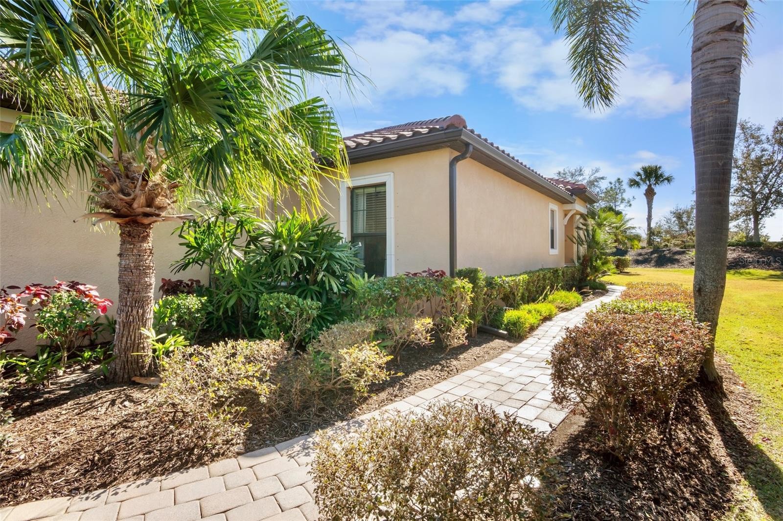 Esplanade Golf & Country Club in Lakewood Ranch sets a high standard for resort-style living, offering three resort pools, two fitness centers, a spa, salon, two dog parks, multiple social clubs and events, as well as on-site dining options including The Bahama Bar and The Barrel House Bistro Bar. This maintenance-free (lawn care included) residence provides access to all social amenities, fitness facilities, tennis, and pickleball without requiring a golf membership; golf is available on a pay-as-you-play basis. From the impressive entrance to the property itself, residents enjoy meticulously designed landscaping and a sense of luxury throughout the community. Located on a cul-de-sac street, this home has wonderful curb appeal with barrel tile roof, paver tiles on the driveway and walkway, and an extra-long driveway for ample parking for guests and family members. The interior continues the theme of sophistication, featuring a spacious gourmet kitchen with 42-inch wood cabinetry, granite countertops, crown molding, wood trim, abundant natural light, and a tranquil, private screened lanai. The popular ROMA model includes two bedrooms, a den, a spacious open floor plan, and a two-car garage. Upgrades include Germicidal Air Purifier in the A/C system and a water softener/treatment system, rescreened lanai (2024), and repainting of exterior (2021). Furniture is available for separate purchase. You can enjoy the tranquility of this lovely home and participate in your choice of the many available community activities in the amenity-rich community of Esplanade in Lakewood Ranch. Schedule your showing soon.