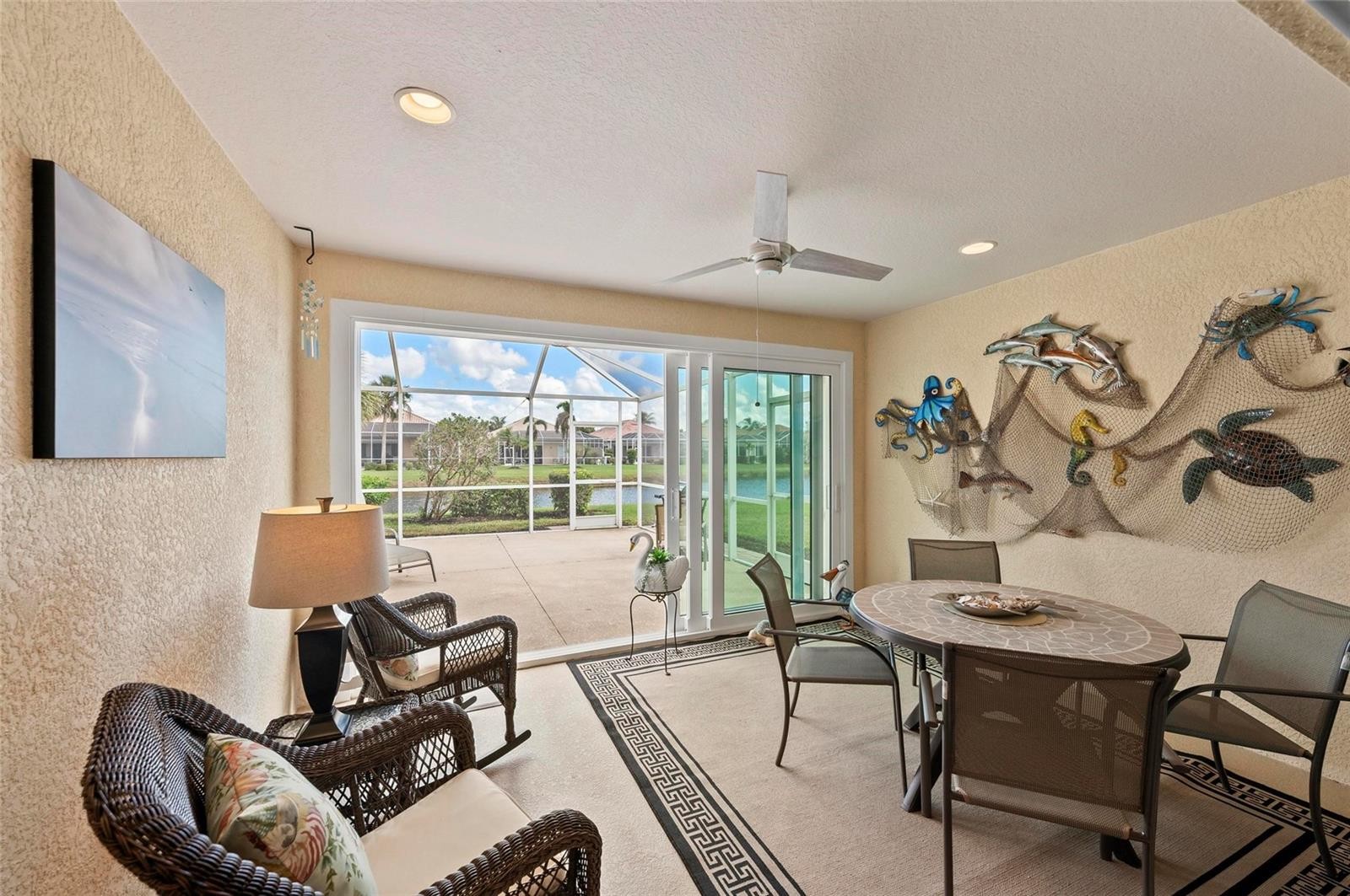The much sought after Carrington model is now available on a premium water lot! This is a true 3 bedroom, 2 bathroom with a 2 car attached garage! The owners have seldom used the home, and it is in pristine condition and move in ready! Tile throughout the living areas, new luxury laminate in the bedrooms, custom blinds, ceiling fans and Newer AC, water & dryer, Hot Water Heater, enclosed Florida room. Light and bright- this villa overlooks the lake. This villa has a nicely appointed kitchen with lots of cabinets, granite counters, breakfast bar and stainless-steel appliances. The master bathroom has a large walk-in shower, his and hers sinks. Looking for privacy? This home has a nice sized yard with a wall providing privacy from the neighbor's yard. The third bedroom has glass French doors and can easily be turned into an office or den. IslandWalk is one of VENICE'S most social communities with a FULL TIME ACTIVITIES DIRECTOR, countless events and clubs and activities, TWO community clubhouses, an EVENT center, TWO resort style pools, a LAP pool, 12 PICKLE BALL Courts, 8 Har Tru Tennis Courts, DOG PARK, Playground, Basketball Court, Community Garden- the list goes on! The entire community is surrounded by miles and miles of golf cart trails, walking and biking trails, VENETIAN bridges and water! The Atlanta Braves Stadium is a short bike ride away- enjoy year-round events and activities. The new marketplace is now complete with PUBLIX, restaurants, shopping, gas station, etc! Downtown Wellen Park features an 80-acre lake, retail shops, restaurant waterfront dining and rooftop decks, pedestrian-friendly streets, a splash pad, a playground and a public town hall gathering place that hosts live theater and music events. Coming soon to downtown Wellen Park- a hammock grove and a permanent food truck area IslandWalk HOA includes grounds maintenance, CABLE, WIFI, amenities, and 24 hour guard.