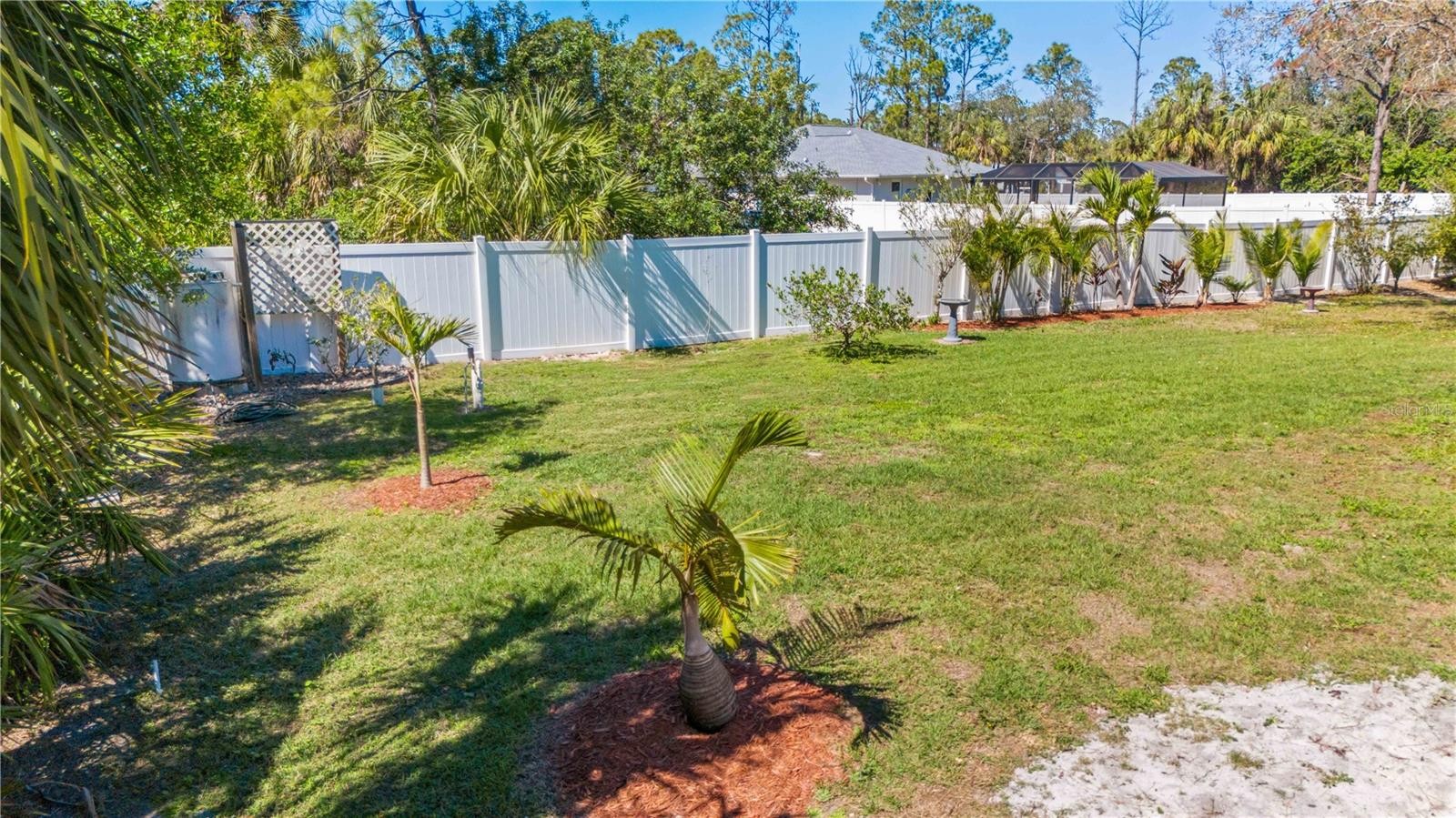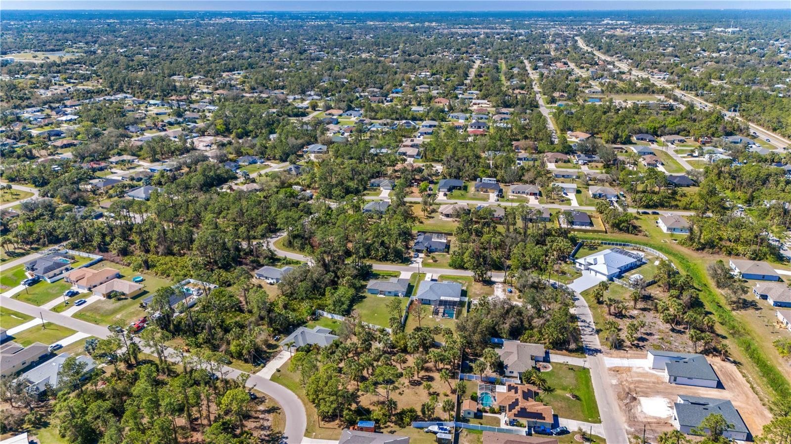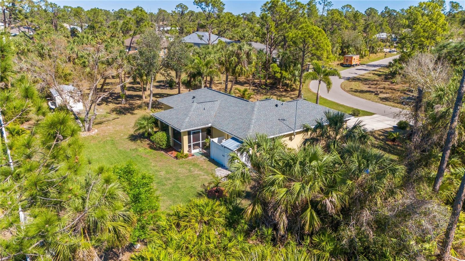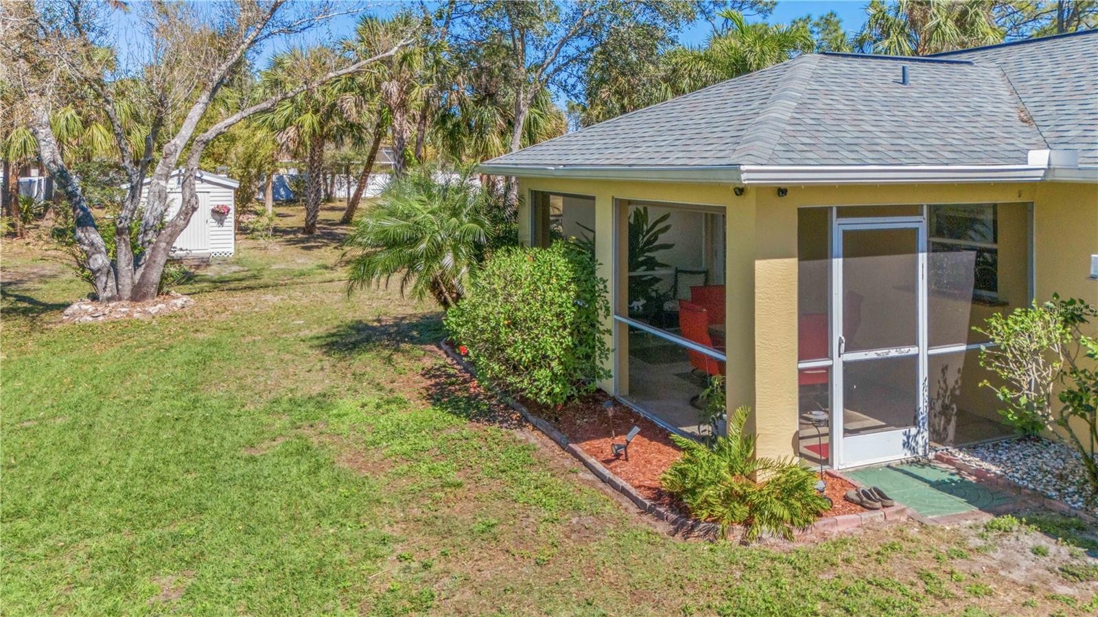 Rare opportunity in North Port, OUT OF THE FLOOD ZONE. Nestled on an expansive ¾-acre lot, this charming 3-bedroom, 2-bath home offers the perfect blend of space, privacy, and modern comfort. Whether you need room for pets, kids, or extra storage for your toys, this property provides endless possibilities—including the potential to create your own outdoor oasis! Step inside to an inviting open-concept living area, where vaulted ceilings in the living room and kitchen create a bright, airy feel. The beautifully updated kitchen features stainless steel appliances, granite countertops, a stylish tile backsplash, and a convenient pass-thru window to the lanai—perfect for entertaining or enjoying outdoor dining. The split floor plan ensures optimal privacy, with the spacious primary suite on one side and the guest bedrooms on the other. The primary bedroom boasts a walk-in closet and an en-suite bathroom with a tiled shower and modern vanity. The guest bedrooms offer peaceful views of the surrounding vacant land, adding to the home’s sense of tranquility. Enjoy the convenience of whole-house reverse osmosis, providing crisp, clean drinking water straight from the tap. The fenced-in yard enhances privacy, while mature trees and plantings create a serene atmosphere. A shed (10x16) offers additional storage, and with plenty of space for equipment, parking, or workspace, this property is an excellent option for a small business owner. Additional updates include a NEW ROOF (2019), HVAC system (2019), GUTTERS (2020), and FENCE (2018), ensuring peace of mind for years to come.